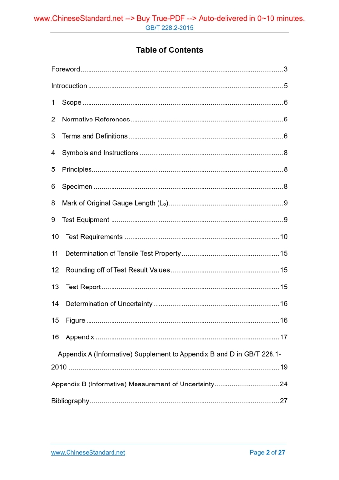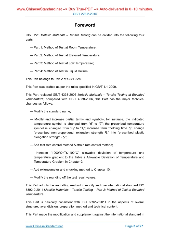 Similar standardsGB/T 228.2-2015: Metallic materials -- Tensile testing -- Part 2: Method of test at elevated temperature---This is an excerpt. Full copy of true-PDF in English version (including equations, symbols, images, flow-chart, tables, and figures etc.), auto-downloaded/delivered in 9 seconds, can be purchased online: https://www.ChineseStandard.net/PDF.aspx/GBT228.2-2015 GB NATIONAL STANDARD OF THE PEOPLE’S REPUBLIC OF CHINA ICS 77.040.10 H 22 Replacing GB/T 4338-2006 Metallic Materials – Tensile Testing – Part 2. Method of Test at Elevated Temperature (ISO 6892-2.2011, MOD) Issued on: SEPTEMBER 11, 2015 Implemented on: JUNE 1, 2016 Issued by. General Administration of Quality Supervision, Inspection and Quarantine; Standardization Administration of PRC. Table of ContentsForeword ... 3 Introduction ... 5 1 Scope ... 6 2 Normative References ... 6 3 Terms and Definitions ... 6 4 Symbols and Instructions ... 8 5 Principles ... 8 6 Specimen ... 8 8 Mark of Original Gauge Length (Lo) ... 9 9 Test Equipment ... 9 10 Test Requirements ... 10 11 Determination of Tensile Test Property ... 15 12 Rounding off of Test Result Values ... 15 13 Test Report ... 15 14 Determination of Uncertainty ... 16 15 Figure ... 16 16 Appendix ... 17 Appendix A (Informative) Supplement to Appendix B and D in GB/T 228.1- 2010 ... 19 Appendix B (Informative) Measurement of Uncertainty... 24 Bibliography ... 27ForewordGB/T 228 Metallic Materials – Tensile Testing can be divided into the following four parts. --- Part 1. Method of Test at Room Temperature; --- Part 2. Method of Test at Elevated Temperature; --- Part 3. Method of Test at Low Temperature; --- Part 4. Method of Test in Liquid Helium. This Part belongs to Part 2 of GB/T 228. This Part was drafted as per the rules specified in GB/T 1.1-2009. This Part replaced GB/T 4338-2006 Metallic Materials – Tensile Testing at Elevated Temperature; compared with GB/T 4338-2006, this Part has the major technical changes as follows. --- Modify the standard name; --- Modify and increase partial terms and symbols, for instance, the indicated temperature symbol is changed from “θ” to “T”; the prescribed temperature symbol is changed from “θi” to “Ti”; increase term “holding time ts”; change “prescribed non-proportional extension strength Rp” into “prescribed plastic elongation strength Rp”; --- Add test rate control method A strain rate control method; --- Increase “1000°C< T≤1100°C” allowable deviation of temperature and temperature gradient to the Table 2 Allowable Deviation of Temperature and Temperature Gradient in Chapter 9; --- Add extensometer and chucking method to Chapter 10; --- Modify the rounding off the test result values. This Part adopts the re-drafting method to modify and use international standard ISO 6892-2.2011 Metallic Materials – Tensile Testing – Part 2. Method of Test at Elevated Temperature. This Part is basically consistent with ISO 6892-2.2011 in the aspects of overall structure, layer division, preparation method and technical content. This Part made the modification and supplement against the international standard in Metallic Materials – Tensile Testing – Part 2. Method of Test at Elevated Temperature1 ScopeThis Part specifies the definitions, symbols instructions, specimen and its dimension measurement, test equipment, test requirements, property determination, determination result values rounding off and test report for the method of tensile testing of metallic materials at the temperature higher than the room temperature. This Part is applicable to the test of tensile property of metallic materials at the temperature higher than the room temperature.2 Normative ReferencesThe following documents are essential to the application of this document. For the dated documents, only the versions with the dates indicated are applicable to this document; for the undated documents, only the latest version (including all the amendments) are applicable to this document. GB/T 228.1-2010 Metallic Materials - Tensile Testing - Part 1. Method of Test at Room Temperature (ISO 6892-1.2009, MOD) GB/T 16825.1 Verification of Static Uniaxial Testing Machines - Part 1. Tension/Compression Testing Machines - Verification and Calibration of the Force- Measuring System (GB/T 16825.1-2008, ISO 7500-1.2004, IDT) GB/T 12160 Calibration of Extensometers Used in Uniaxial Testing (GB/T 12160- 2002, ISO 9513.1999, IDT)3 Terms and DefinitionsThe following terms and definitions stipulated in GB/T 228.1-2010 are applicable to this document. Generally, all specimens’ geometric dimensions shall be measured at the room temperature; the extensometer gauge length (see 3.3 and 10.2.2) may be exceptional. NOTE. Unless otherwise specified in the relevant specifications and agreements, generally, the elevated temperature performance shall not be measured. --- Specified residual extension strength (Rr); --- Residual elongation rate; --- Residual extension rate; --- Percentage yield point extension (Ae); --- Percentage total extension at maximum force (Agt); --- Percentage plastic extension at maximum force (Ag); --- Total extension at fracture (At). 3.1 Original gauge length (Lo) The specimen gauge length at room temperature before heating and exerting force. 3.2 Percentage elongation after fracture (A) At room temperature, the ratio between gauge length residual elongation after fracture (Lu - Lo) and the original gauge length (Lo). NOTE. see 3.4.2 in GB/T 228.1-2010. 3.3 Extensometer gauge length (Le) When using the extensometer to measure the parallel part extension, the used starting gauge length of the extensometer. 3.4 Extension The increment of extensometer gauge length Le given the scale during the test period. 3.5 Percentage extension Extension percentage expressed by extensometer gauge length Le. 3.6 Percentage reduction of area (Z) The ratio between the maximum reduction of specimen cross-sectional area after fr