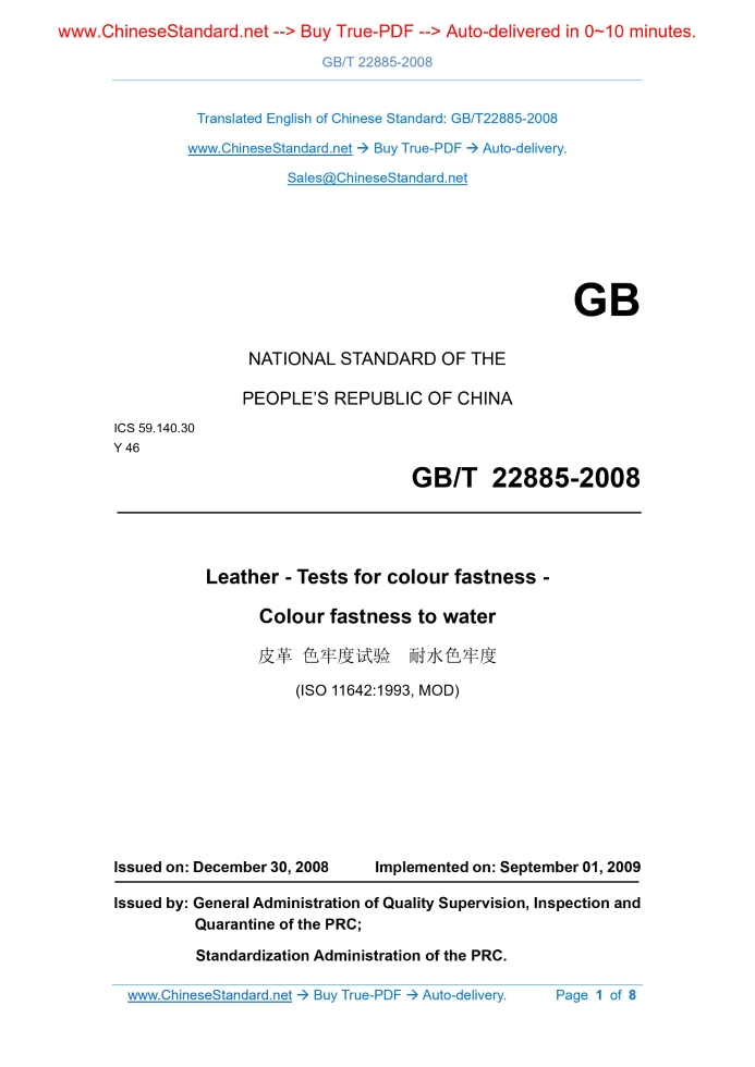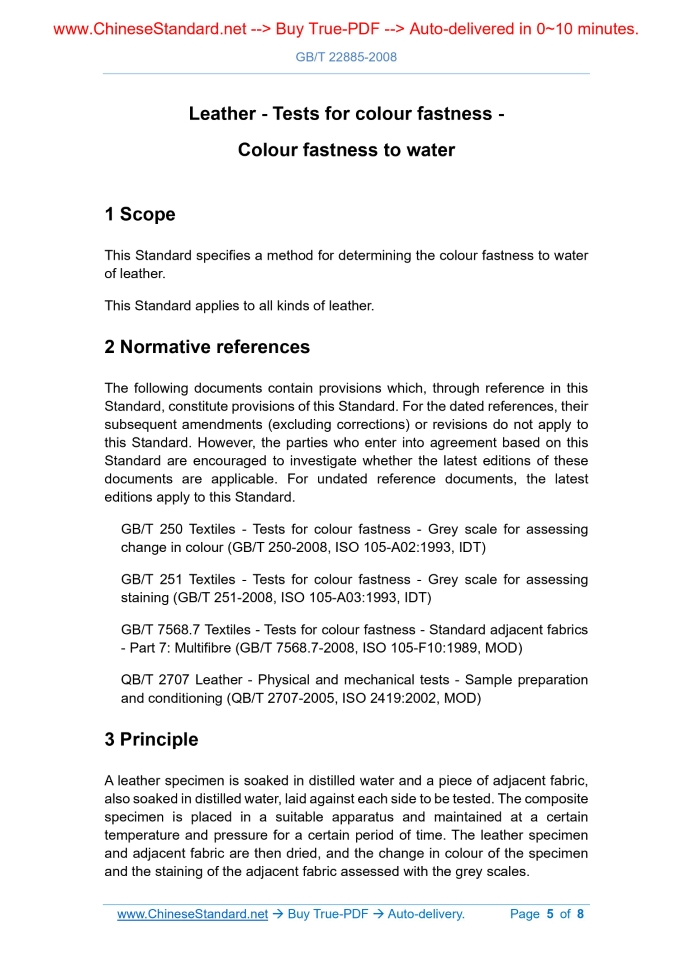 GB/T 22885-2008: Leather -- Tests for colour fastness -- Colour fastness to water Delivery: 9 seconds. True-PDF full-copy in English & invoice will be downloaded + auto-delivered via email. See step-by-step procedure Status: Valid