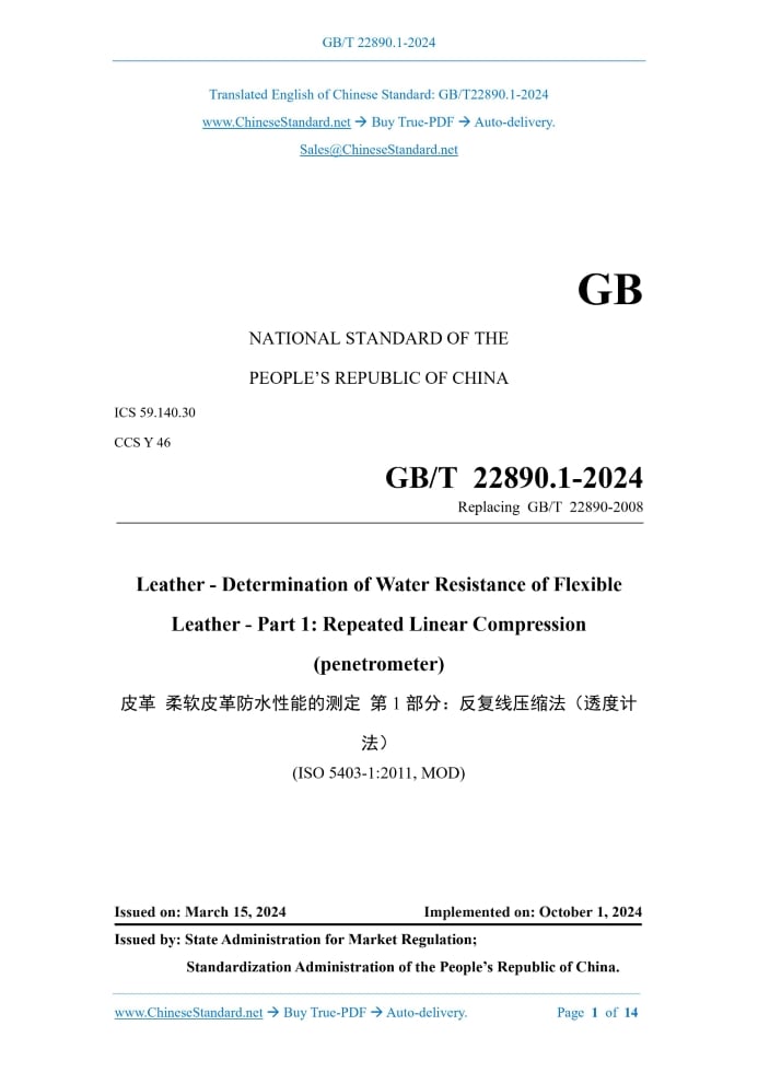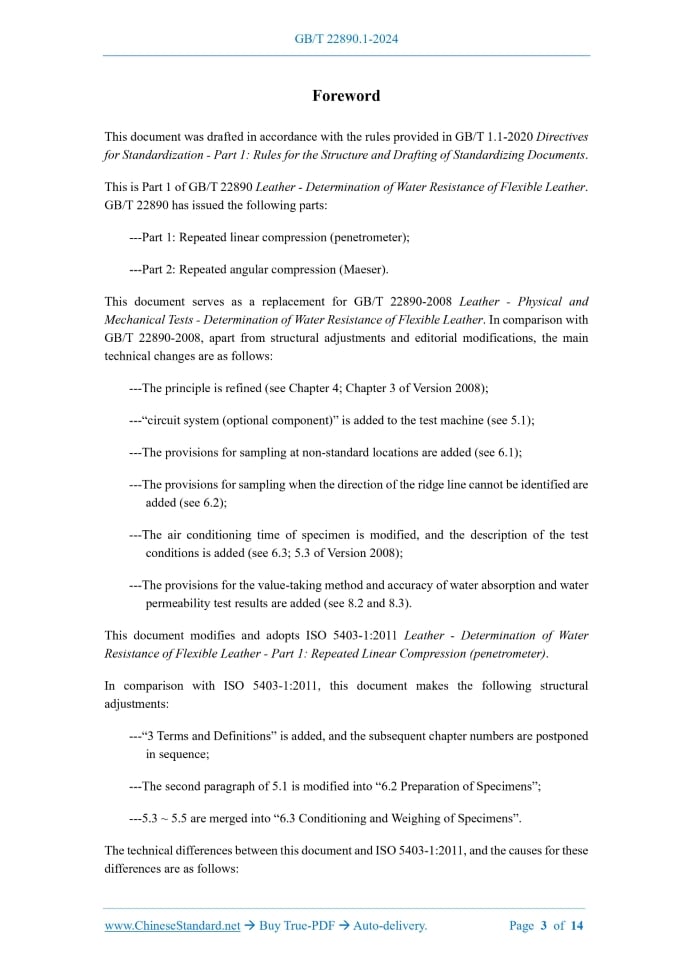 Similar standardsGB/T 22890.1-2024: Leather - Determination of water resistance of flexible leather - Part 1: Repeated linear compression(penetrometer)---This is an excerpt. Full copy of true-PDF in English version (including equations, symbols, images, flow-chart, tables, and figures etc.), auto-downloaded/delivered in 9 seconds, can be purchased online: https://www.ChineseStandard.net/PDF.aspx/GBT22890.1-2024 GB NATIONAL STANDARD OF THE PEOPLE’S REPUBLIC OF CHINA ICS 59.140.30 CCS Y 46 Replacing GB/T 22890-2008 Leather - Determination of Water Resistance of Flexible Leather - Part 1.Repeated Linear Compression (penetrometer) (ISO 5403-1.2011, MOD) Issued on: MARCH 15, 2024 Implemented on: OCTOBER 1, 2024 Issued by. State Administration for Market Regulation; Standardization Administration of the People’s Republic of China. Table of ContentsForeword... 3 Introduction... 6 1 Scope... 7 2 Normative References... 7 3 Terms and Definitions... 7 4 Principle... 7 5 Equipment, Reagents and Materials... 8 6 Sampling and Preparation of Specimens... 9 7 Test Steps... 10 8 Calculation and Expression of Results... 12 9 Test Report... 13 Bibliography... 14ForewordThis document was drafted in accordance with the rules provided in GB/T 1.1-2020 Directives for Standardization - Part 1.Rules for the Structure and Drafting of Standardizing Documents. This is Part 1 of GB/T 22890 Leather - Determination of Water Resistance of Flexible Leather. GB/T 22890 has issued the following parts. ---Part 1.Repeated linear compression (penetrometer); ---Part 2.Repeated angular compression (Maeser). This document serves as a replacement for GB/T 22890-2008 Leather - Physical and Mechanical Tests - Determination of Water Resistance of Flexible Leather. In comparison with GB/T 22890-2008, apart from structural adjustments and editorial modifications, the main technical changes are as follows. ---The principle is refined (see Chapter 4; Chapter 3 of Version 2008); ---“circuit system (optional component)” is added to the test machine (see 5.1); ---The provisions for sampling at non-standard locations are added (see 6.1); ---The provisions for sampling when the direction of the ridge line cannot be identified are added (see 6.2); ---The air conditioning time of specimen is modified, and the description of the test conditions is added (see 6.3; 5.3 of Version 2008); ---The provisions for the value-taking method and accuracy of water absorption and water permeability test results are added (see 8.2 and 8.3). This document modifies and adopts ISO 5403-1.2011 Leather - Determination of Water Resistance of Flexible Leather - Part 1.Repeated Linear Compression (penetrometer). In comparison with ISO 5403-1.2011, this document makes the following structural adjustments. ---“3 Terms and Definitions” is added, and the subsequent chapter numbers are postponed in sequence; ---The second paragraph of 5.1 is modified into “6.2 Preparation of Specimens”; ---5.3 ~ 5.5 are merged into “6.3 Conditioning and Weighing of Specimens”. The technical differences between this document and ISO 5403-1.2011, and the causes for these differences are as follows. Leather - Determination of Water Resistance of Flexible Leather - Part 1.Repeated Linear Compression (penetrometer)1 ScopeThis document describes a test method for the determination of the dynamic waterproof performance of leather through repeated linear compression. This document is applicable to the determination of the waterproof performance of various types of soft leather (especially soft leather for shoes).2 Normative ReferencesThe contents of the following documents constitute indispensable clauses of this document through the normative references in the text. In terms of references with a specified date, only versions with a specified date are applicable to this document. In terms of references without a specified date, the latest version (including all the modifications) is applicable to this document. GB/T 6682 Water for Analytical Laboratory Use - Specification and Test Methods (GB/T 6682- 2008, ISO 3696.1987, MOD) GB/T 39364 Leather - Chemical, Physical, Mechanical and Fastness Tests - Sampling Location (GB/T 39364-2020, ISO 2418.2017, MOD) QB/T 2707 Leather - Physical and Mechanical Tests - Sample Preparation and Conditioning (QB/T 2707-2018, ISO 2419.2012, MOD)3 Terms and DefinitionsThis document does not have terms or definitions that need to be defined.4 PrincipleForm the specimen into a groove shape and partially immerse it in water, then bend it, and measure the time required for water to permeate the leather specimen. This test can also determine the water absorption rate of the specimen (by mass fraction) and the water permeability of the specimen (by mass). NOTE. this method adopts compression bend, while GB/T 22890.2 uses folding bend. Since the two test methods belong to different bending types, there is no comparability between the ......Source: Above contents are excerpted from the full-copy PDF -- translated/reviewed by: www.ChineseStandard.net / Wayne Zheng et al. Tips & Frequently Asked Questions:Question 1: How long will the true-PDF of English version of GB/T 22890.1-2024 be delivered?Answer: The full copy PDF of English version of GB/T 22890.1-2024 can be downloaded in 9 seconds, and it will also be emailed to you in 9 seconds (double mechanisms to ensure the delivery reliably), with PDF-invoice.Question 2: Can I share the purchased PDF of GB/T 22890.1-2024_English with my colleagues?Answer: Yes. The purchased PDF of GB/T 22890.1-2024_English will be deemed to be sold to your employer/organization who actually paid for it, including your colleagues and your employer's intranet.Question 3: Does the price include tax/VAT?Answer: Yes. Our tax invoice, downloaded/delivered in 9 seconds, includes all tax/VAT and complies with 100+ countries' tax regulations (tax exempted in 100+ countries) -- See Avoidance of Double Taxation Agreements (DTAs): List 
