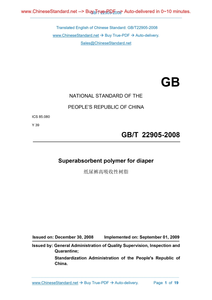 GB/T 22905-2008: Superabsorbent polymer for diaper Delivery: 9 seconds. True-PDF full-copy in English & invoice will be downloaded + auto-delivered via email. See step-by-step procedure Status: Obsolete