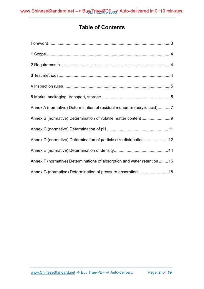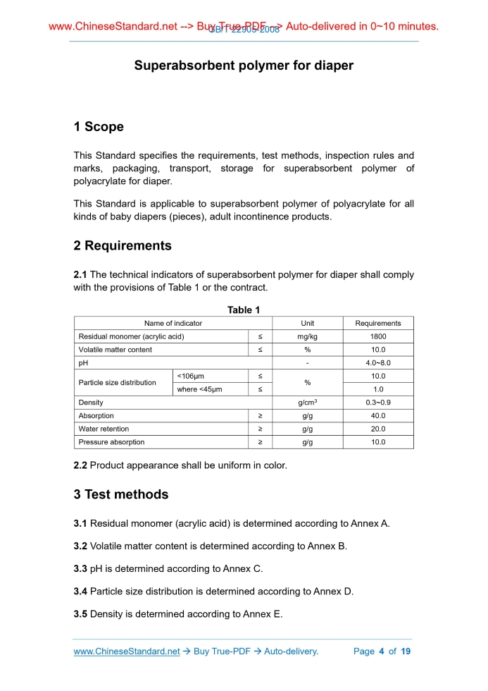 Similar standardsGB/T 22905-2008: Superabsorbent polymer for diaper---This is an excerpt. Full copy of true-PDF in English version (including equations, symbols, images, flow-chart, tables, and figures etc.), auto-downloaded/delivered in 9 seconds, can be purchased online: https://www.ChineseStandard.net/PDF.aspx/GBT22905-2008GB NATIONAL STANDARD OF THE PEOPLE’S REPUBLIC OF CHINA ICS 85.080 Y 39 Superabsorbent polymer for diaper 纸尿裤高吸收性树脂 Issued on: DECEMBER 30, 2008 Implemented on: SEPTEMBER 01, 2009 Issued by. General Administration of Quality Supervision, Inspection and Quarantine; Standardization Administration of the People's Republic of China. Table of ContentsForeword ... 3 1 Scope ... 4 2 Requirements ... 4 3 Test methods ... 4 4 Inspection rules ... 5 5 Marks, packaging, transport, storage ... 5 Annex A (normative) Determination of residual monomer (acrylic acid) ... 7 Annex B (normative) Determination of volatile matter content ... 9 Annex C (normative) Determination of pH ... 11 Annex D (normative) Determination of particle size distribution ... 12 Annex E (normative) Determination of density ... 14 Annex F (normative) Determinations of absorption and water retention ... 16 Annex G (normative) Determination of pressure absorption ... 18ForewordAnnex A, Annex B, Annex C, Annex D, Annex E, Annex F, Annex G of this Standard are normative. This Standard was proposed by China Light Industry Federation. This Standard shall be under the jurisdiction of National Technical Committee on Paper Industry of Standardization Administration of China. Main drafting organizations of this Standard. China Pulp and Paper Research Institute, Jinan Haoyue Suction Material Co., Ltd., National Paper Quality Supervision and Inspection Center. The drafting organizations of this Standard. Sanda Fine Chemicals (Nantong) Co., Ltd., BASF (China) Investment Co., Ltd., Formosa Plastics Resin (Ningbo) Co., Ltd., Kimberly (China) Co., Ltd., Guangzhou P&G Co., Ltd., Fujian Hengan Group Co., Ltd., Evonik Degussa (China) Investment Co., Ltd., Kao (China) Investment Co., Ltd., Ritong Chemical (Zhangjiagang) Co., Ltd., Quanzhou Banglida Technology Industrial Co., Ltd., You Nijia Daily Necessities (China) Co., Ltd. Main drafters of this Standard. Gao Jun, Yang Zhiliang, Zhou Junfeng. Superabsorbent polymer for diaper1 ScopeThis Standard specifies the requirements, test methods, inspection rules and marks, packaging, transport, storage for superabsorbent polymer of polyacrylate for diaper. This Standard is applicable to superabsorbent polymer of polyacrylate for all kinds of baby diapers (pieces), adult incontinence products.2 Requirements2.1 The technical indicators of superabsorbent polymer for diaper shall comply with the provisions of Table 1 or the contract. Table 1 Name of indicator Unit Requirements Residual monomer (acrylic acid) ≤ mg/kg 1800 Volatile matter content ≤ % 10.0 pH - 4.0~8.0 Particle size distribution < 106µm ≤ % 10.0 where < 45µm ≤ 1.0 Density g/cm3 0.3~0.9 Absorption ≥ g/g 40.0 Water retention ≥ g/g 20.0 Pressure absorption ≥ g/g 10.0 2.2 Product appearance shall be uniform in color.3 Test methods3.1 Residual monomer (acrylic acid) is determined according to Annex A. 3.2 Volatile matter content is determined according to Annex B. 3.3 pH is determined according to Annex C. 3.4 Particle size distribution is determined according to Annex D. 3.5 Density is determined according to Annex E. 3.6 Appearance. place the specimen under normal light for visual inspection. 3.7 The amount of absorption and water retention are determined according to Annex F. 3.8 The amount of pressure absorption is determined according to Annex G.4 Inspection rules4.1 The production batch of one time is a batch. 4.2 Perform sampling evenly from the same batch and not less than 3 packaging bags. The sampling amount shall be 1 kg. 4.3 The product shall be inspected according to this Standard or contract before leaving the factory. If there is a non-conformity after inspection, the sampling shall be doubled and the unqualified item shall be re-inspected. The results of re-inspection shall be the final inspection results. 4.4 The supplier (hereinafter referred to as the supplier) shall ensure that the product quality complies with this Standard or the contract. Product quality certificate shall be attached to the delivery. 4.5 The purchaser (hereinafter referred to as the purchaser) has the right to inspect the product in accordance with this Standard or the contract. If there is any objection to the quality of the product, the supplier shall be notified within one month of arrival (or as specified in the contract). The supplier shall handle it in time. If necessary, the sampling shall be performed by the supplier and the purchaser together for the re-inspection. If the re-inspection result does not comply with this Standard or the contract, it is determined as unqualified and shall be handled by the supplier. If the re-inspection result meets the requirements of this Standard or the contract, it shall be determined as qualified and shall be handled by the purchaser. If the two parties still have disputes over the results of the re-inspection, they shall submit to the higher-level testing institutions approved by both parties for arbitration. The arbitration results shall be as the basis for final determination.5 Marks, packaging, transport, storage5.1 The product marks, packaging shall be performed according to 5.2 or the contract. 5.2 Products shall be packaged in bags with lined plastic film. The packaging bag shall have sufficient strength to ensure that it shall not break or fall off during use. Each batch of products shall be accompanied by a quality certificate, indicating manufacturer's name, product name, trademark, date of production, packaging quantity, inspection result and standard number used. 5.3 During product transport, it shall use rainproof, moisture proof, clean transportati