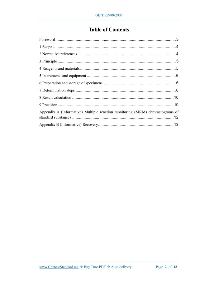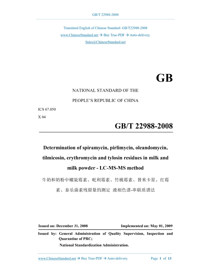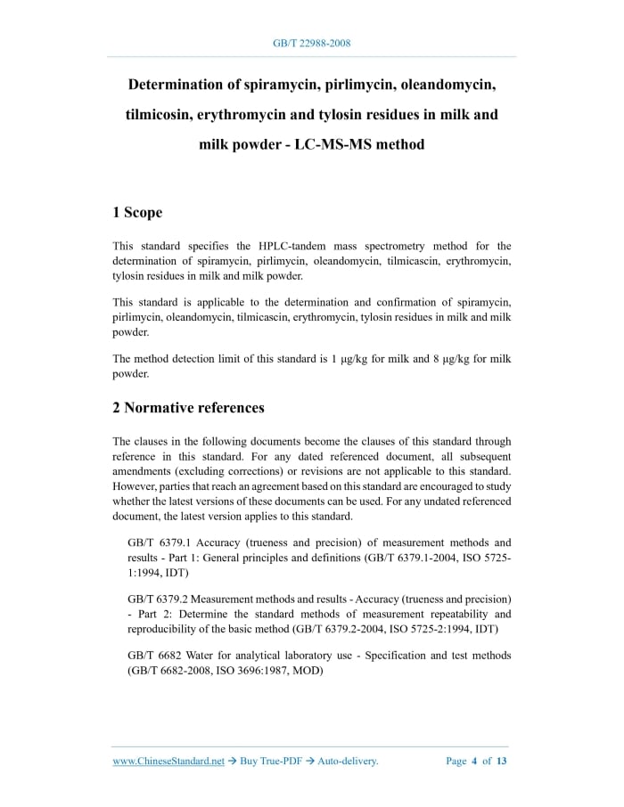 Similar standardsGB/T 22988-2008: Determination of spiramycin, pirlimycin, oleandomycin, tilmicosin, erythromycin and tylosin residues in milk and milk powder - LC-MS-MS method---This is an excerpt. Full copy of true-PDF in English version (including equations, symbols, images, flow-chart, tables, and figures etc.), auto-downloaded/delivered in 9 seconds, can be purchased online: https://www.ChineseStandard.net/PDF.aspx/GBT22988-2008 GB NATIONAL STANDARD OF THE PEOPLE’S REPUBLIC OF CHINA ICS 67.050 X 04 Determination of spiramycin, pirlimycin, oleandomycin, tilmicosin, erythromycin and tylosin residues in milk and milk powder - LC-MS-MS method ISSUED ON: DECEMBER 31, 2008 IMPLEMENTED ON: MAY 01, 2009 Issued by: General Administration of Quality Supervision, Inspection and Quarantine of PRC; National Standardization Administration. Table of ContentsForeword ... 3 1 Scope ... 4 2 Normative references ... 4 3 Principle ... 5 4 Reagents and materials ... 5 5 Instruments and equipment ... 6 6 Preparation and storage of specimens ... 6 7 Determination steps ... 6 8 Result calculation ... 10 9 Precision ... 10 Appendix A (Informative) Multiple reaction monitoring (MRM) chromatograms of standard substances ... 12 Appendix B (Informative) Recovery ... 13 Determination of spiramycin, pirlimycin, oleandomycin, tilmicosin, erythromycin and tylosin residues in milk and milk powder - LC-MS-MS method1 ScopeThis standard specifies the HPLC-tandem mass spectrometry method for the determination of spiramycin, pirlimycin, oleandomycin, tilmicascin, erythromycin, tylosin residues in milk and milk powder. This standard is applicable to the determination and confirmation of spiramycin, pirlimycin, oleandomycin, tilmicascin, erythromycin, tylosin residues in milk and milk powder. The method detection limit of this standard is 1 μg/kg for milk and 8 μg/kg for milk powder.2 Normative referencesThe clauses in the following documents become the clauses of this standard through reference in this standard. For any dated referenced document, all subsequent amendments (excluding corrections) or revisions are not applicable to this standard. However, parties that reach an agreement based on this standard are encouraged to study whether the latest versions of these documents can be used. For any undated referenced document, the latest version applies to this standard. GB/T 6379.1 Accuracy (trueness and precision) of measurement methods and results - Part 1: General principles and definitions (GB/T 6379.1-2004, ISO 5725- 1:1994, IDT) GB/T 6379.2 Measurement methods and results - Accuracy (trueness and precision) - Part 2: Determine the standard methods of measurement repeatability and reproducibility of the basic method (GB/T 6379.2-2004, ISO 5725-2:1994, IDT) GB/T 6682 Water for analytical laboratory use - Specification and test methods (GB/T 6682-2008, ISO 3696:1987, MOD)3 PrincipleThe analytes in the specimen are extracted with acetonitrile, cleaned up with solid phase extraction column, determined by high performance liquid chromatography-tandem mass spectrometry, quantified by external standard method.4 Reagents and materialsUnless otherwise specified, all reagents used are analytical grade; the water is grade 1 water as specified in GB/T 6682. 4.1 Acetonitrile, HPLC grade. 4.2 Methanol, HPLC grade. 4.3 Acetic acid, HPLC grade. 4.4 Ammonium formate, HPLC grade. 4.5 Disodium hydrogen phosphate. 4.6 Sodium hydroxide. 4.7 Methanol-water solution (3 + 7): 300 mL of methanol mixed with 700 mL of water. 4.8 5 mol/L sodium hydroxide solution: Weigh 20 g of sodium hydroxide; dissolve it in water; dilute it to 100 mL. 4.9 0.1 mol/L phosphate buffer solution: Dissolve 6 g of disodium hydrogen phosphate (4.5) in 450 mL of water; use sodium hydroxide (4.8) solution to adjust pH to 8; add water to 500 mL; prepare it before use. 4.10 0.1 mol/L ammonium formate solution: Add water to dissolve 0.63 g of ammonium formate (4.4) to 1000 mL. 4.11 Standard products: Spiramycin (CAS: 8025-81-8), pirlimycin (CAS: 79548-73-5), oleandomycin (CAS: 7060-74-4), tilmicosin (CAS: 108050-54-0), erythromycin (CAS: 114-07-8), tylosin (CAS: 1401-69-0), purity greater than or equal to 98%. 4.12 Standard stock solution: Accurately weigh appropriate amount of standard products; use methanol to prepare 100 μg/mL standard stock solution. 4.13 Mixed standard intermediate working solution: Take 1 mL of each standard stock solution (4.12) into a 100 mL volumetric flask; use methanol to dilute to the mark; prepare a mixed standard working solution which has a concentration of 1 μg/mL. 10 mL of acetonitrile to repeat extraction once. Combine the supernatant in the same chicken heart bottle. 7.1.2 Milk powder Weigh 0.5 g, accurate to 0.01 g, of the milk powder sample. Add 4 mL of water to a 50 mL stoppered centrifuge tube and mix well. Add 20 mL of acetonitrile. Oscillate for extraction for 2 min. Centrifuge at 3000 r/min for 10 min. Remove the supernatant and filter it into a chicken heart bottle. Use 10 mL of acetonitrile to repeat the extraction once. Combine the supernatant in the same chicken heart bottle. 7.2 Purification Rotate and evaporate the extract at 45 °C to about 4 mL. Add 2 mL of phosphate buffer (4.9). Mix well. Transfer to the conditioned HLB solid phase extraction column (4.15). Wash the chicken heart bottle twice with 2 mL of phosphate buffer. Transfer the washing liquid to the column. Drip it at a flow rate of less than 2 mL/min. Then, wash with 3 mL of water and 2 mL of methanol-water solution (4.7) in turn. Drain the column. Finally elute with 6 mL of acetonitrile and collect in a 10 mL graduated glass tube (the flow rate in this process is less than 2 mL/min). The eluent is blown to about 1 mL with nitrogen in a 45 °C water bath; use ammonium formate solution (4.10) to make its volume reach to 2 mL. After vortex mixing, filter it through a 0.45 µm filter membrane for HPLC-MS-MS analysis. 7.3 Preparation of blank matrix solution