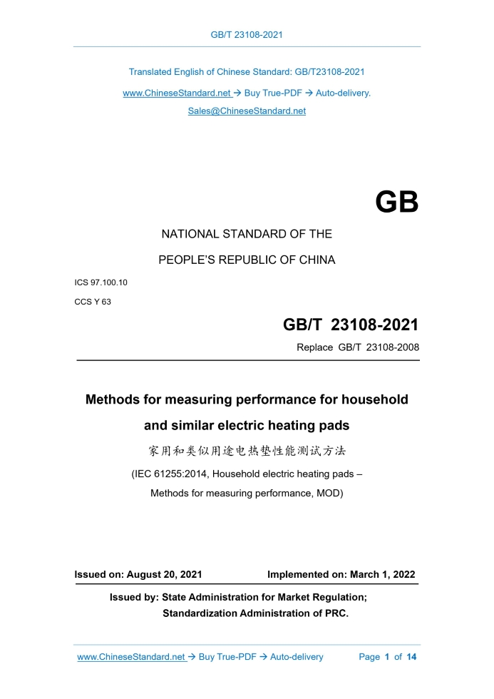 GB/T 23108-2021: Methods for measuring performance for household and similar electric heating pads Delivery: 9 seconds. True-PDF full-copy in English & invoice will be downloaded + auto-delivered via email. See step-by-step procedure Status: Valid GB/T 23108: Historical versions