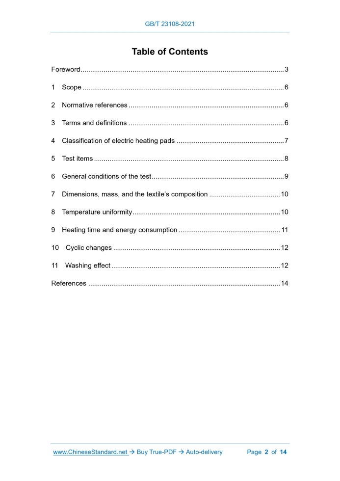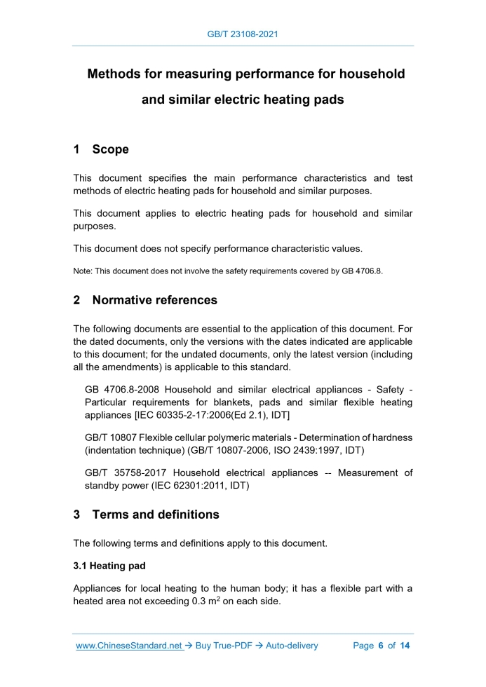 Similar standardsGB/T 23108-2021: Methods for measuring performance for household and similar electric heating pads---This is an excerpt. Full copy of true-PDF in English version (including equations, symbols, images, flow-chart, tables, and figures etc.), auto-downloaded/delivered in 9 seconds, can be purchased online: https://www.ChineseStandard.net/PDF.aspx/GBT23108-2021 GB NATIONAL STANDARD OF THE PEOPLE’S REPUBLIC OF CHINA ICS 97.100.10 CCS Y 63 Replace GB/T 23108-2008 Methods for measuring performance for household and similar electric heating pads (IEC 61255:2014, Household electric heating pads – Methods for measuring performance, MOD) ISSUED ON: AUGUST 20, 2021 IMPLEMENTED ON: MARCH 1, 2022 Issued by: State Administration for Market Regulation; Standardization Administration of PRC. Table of ContentsForeword ... 3 1 Scope ... 6 2 Normative references ... 6 3 Terms and definitions ... 6 4 Classification of electric heating pads ... 7 5 Test items ... 8 6 General conditions of the test ... 9 7 Dimensions, mass, and the textile’s composition ... 10 8 Temperature uniformity ... 10 9 Heating time and energy consumption ... 11 10 Cyclic changes ... 12 11 Washing effect ... 12 References ... 14 Methods for measuring performance for household and similar electric heating pads1 ScopeThis document specifies the main performance characteristics and test methods of electric heating pads for household and similar purposes. This document applies to electric heating pads for household and similar purposes. This document does not specify performance characteristic values. Note: This document does not involve the safety requirements covered by GB 4706.8.2 Normative referencesThe following documents are essential to the application of this document. For the dated documents, only the versions with the dates indicated are applicable to this document; for the undated documents, only the latest version (including all the amendments) is applicable to this standard. GB 4706.8-2008 Household and similar electrical appliances - Safety - Particular requirements for blankets, pads and similar flexible heating appliances [IEC 60335-2-17:2006(Ed 2.1), IDT] GB/T 10807 Flexible cellular polymeric materials - Determination of hardness (indentation technique) (GB/T 10807-2006, ISO 2439:1997, IDT) GB/T 35758-2017 Household electrical appliances -- Measurement of standby power (IEC 62301:2011, IDT)3 Terms and definitionsThe following terms and definitions apply to this document. 3.1 Heating pad Appliances for local heating to the human body; it has a flexible part with a heated area not exceeding 0.3 m2 on each side. Electric heating pads are classified according to the types of power source: - Electric heating pads that are connected to the electric network source directly; - Extra-low voltage electric heating pads. Note: The rated voltage of the extra-low voltage heating pad does not exceed 24V. 4.4 Application methods Electric heating pads are classified according to their application methods: - Dry-using heating pads; - Wet-using heating pads, including cosmetic heating pads. 4.5 Washing methods Electric heating pads are classified according to the washing methods: - Hand wash; - Machine wash; - Not washable. 4.6 Duration of use Electric heating pads are classified according to the duration of use: - Electric heating pads with timing function; - Electric heating pads that can be used continuously.5 Test itemsThe performance of the heating pad is determined by the following test items. - Dimensions, mass, and the textile’s composition (see Chapter 7); - Temperature uniformity (see Chapter 8); - Heating time and energy consumption (see Chapter 9); - Cyclic changes (see Chapter 10); - Washing effect (see Chapter 11).6 General conditions of the testUnless otherwise specified, the test shall be carried out under the following conditions: a) Laboratory The test shall be carried out in a room with no forced convection air and an ambient temperature of (20±5) °C. b) Supply voltage The supply voltage shall be within ±1% of the rated voltage. If the rated voltage range of the heating pad is calibrated, the test report shall indicate the voltage used in the test. Note: If the test result at the rated voltage of the heating pad is possible to be mistaken for the result at the voltage of the supply system, then appliances may also be tested at the voltage corresponding to the rated voltage of the system. c) Placement of heating pads Any removable covers shall be installed; the flexible part shall be placed between thermal insulation materials which shall exceed the edge of the heated area by at least 100 mm. Thermal insulation materials shall be made of open-cell polyether: - Hole count: /cm; - Specified mass: ; - Hardness: 120 N~170 N when the indentation measured according to GB/T 10807 reaches 40%. Fully support the thermal insulation materials with a piece of 20 mm thick plywood, at least 300 mm from the ground. The thickness of the thermal insulation materials under the electric heating pad is about 72 mm, and the thickness of the thermal insulation materials covering the electric heating pad is about 36 mm. Thermal insulation materials shall meet the requirements of Appendix AA of GB 4706.8-2008. trace and can cover the maximum number of heating elements. The number of test points shall meet the requirement that the center-to-center distance between adjacent test points is not more than 200 mm. Measure the temperature at 3 locations on the use surface at least. Place the electric heating pad controller in the position with the maximum temperature and energize it; measure the temperature when a steady state is established or at the end of a complete working cycle. Measure the temperature at each point, calculate the average value, and then subtract the room temperature to obtain the temperature rise value. The range of temperature rise is determined by the difference between the maximum temperature rise and