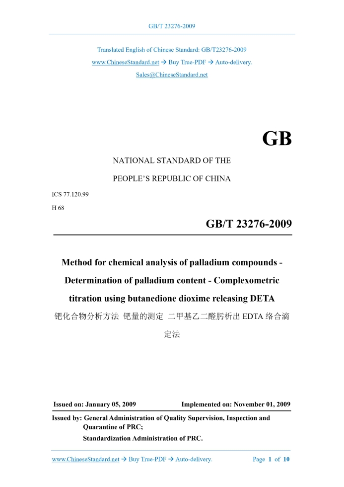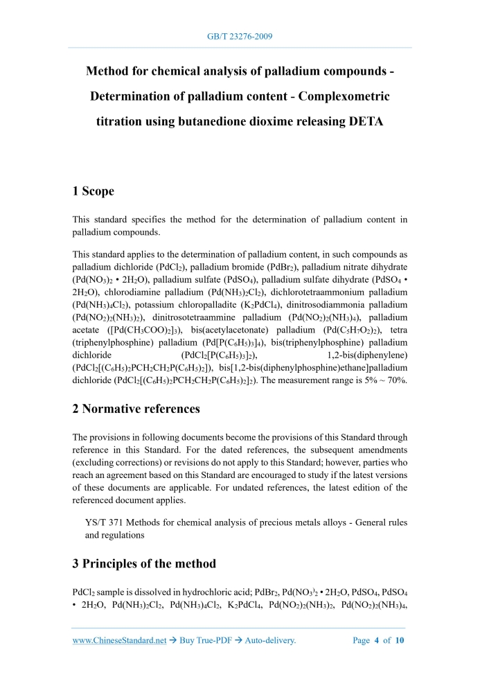 GB/T 23276-2009: Method for chemical analysis of palladium compounds - Determination of palladium content - Complexometric titration using butanedione dioxide releasing EDTA Delivery: 9 seconds. True-PDF full-copy in English & invoice will be downloaded + auto-delivered via email. See step-by-step procedure Status: Valid GB/T 23276: Historical versions