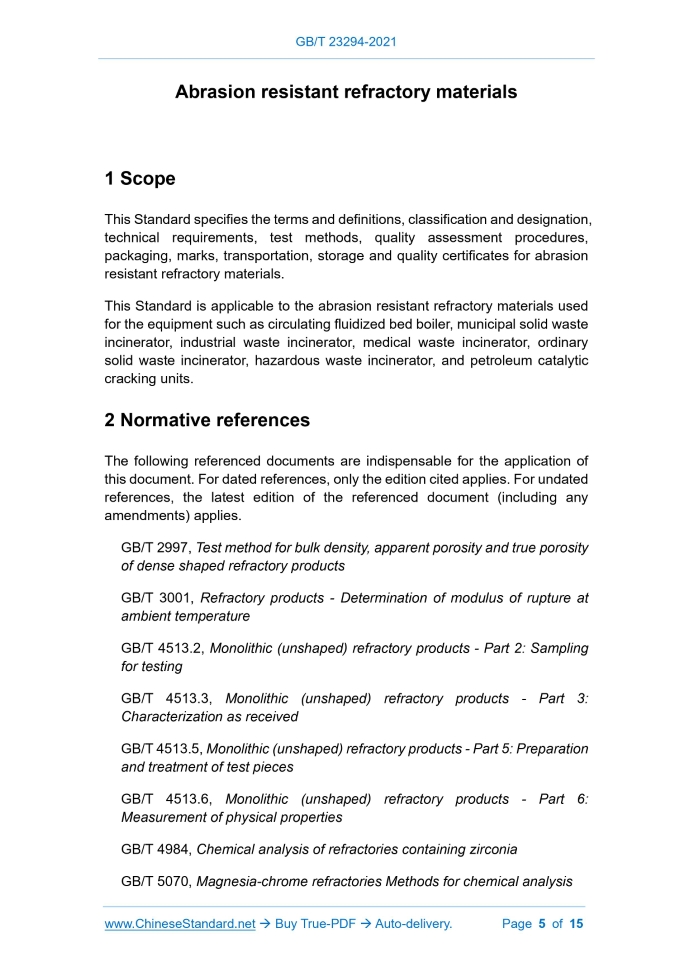 Similar standardsGB/T 23294-2021: Abrasion resistant refractory materials---This is an excerpt. Full copy of true-PDF in English version (including equations, symbols, images, flow-chart, tables, and figures etc.), auto-downloaded/delivered in 9 seconds, can be purchased online: https://www.ChineseStandard.net/PDF.aspx/GBT23294-2021GB NATIONAL STANDARD OF THE PEOPLE’S REPUBLIC OF CHINA ICS 81.080 CCS Q 44 Replacing GB/T 23294-2009 Abrasion resistant refractory materials 耐磨耐火材料 ISSUED ON: MAY 21, 2021 IMPLEMENTED ON: DECEMBER 01, 2021 Issued by: State Administration for Market Regulation; Standardization Administration of the People's Republic of China. Table of ContentsForeword ... 3 1 Scope ... 5 2 Normative references ... 5 3 Terms and definitions ... 7 4 Classification and designation... 7 5 Technical requirements ... 8 6 Test methods ... 12 7 Quality assessment procedure ... 13 8 Packaging, marks, transportation, storage and quality certificate ... 14 Abrasion resistant refractory materials1 ScopeThis Standard specifies the terms and definitions, classification and designation, technical requirements, test methods, quality assessment procedures, packaging, marks, transportation, storage and quality certificates for abrasion resistant refractory materials. This Standard is applicable to the abrasion resistant refractory materials used for the equipment such as circulating fluidized bed boiler, municipal solid waste incinerator, industrial waste incinerator, medical waste incinerator, ordinary solid waste incinerator, hazardous waste incinerator, and petroleum catalytic cracking units.2 Normative referencesThe following referenced documents are indispensable for the application of this document. For dated references, only the edition cited applies. For undated references, the latest edition of the referenced document (including any amendments) applies. GB/T 2997, Test method for bulk density, apparent porosity and true porosity of dense shaped refractory products GB/T 3001, Refractory products - Determination of modulus of rupture at ambient temperature GB/T 4513.2, Monolithic (unshaped) refractory products - Part 2: Sampling for testing GB/T 4513.3, Monolithic (unshaped) refractory products - Part 3: Characterization as received GB/T 4513.5, Monolithic (unshaped) refractory products - Part 5: Preparation and treatment of test pieces GB/T 4513.6, Monolithic (unshaped) refractory products - Part 6: Measurement of physical properties GB/T 4984, Chemical analysis of refractories containing zirconia GB/T 5070, Magnesia-chrome refractories Methods for chemical analysis GB/T 30873, Refractory materials - Determination of thermal shock resistance GB/T 50080, Standard for test method of performance on ordinary fresh concrete YB/T 4130, Refractory materials - Determination of thermal conductivity (calorimeter)3 Terms and definitionsFor the purposes of this document, the terms and definitions defined in GB/T 10325 as well as the followings apply. 3.1 abrasion resistant refractory material refractory material with Al2O3, SiC or SiO2 as main components with excellent wear resistance under the conditions of use4 Classification and designation4.1 Abrasion resistant refractory materials are divided into four categories: abrasion resistant refractory bricks, abrasion resistant refractory castable, abrasion resistant refractory plastics and abrasion resistant refractory mud. 4.2 Abrasion resistant refractory bricks are divided into 7 designations according to physical and chemical indicators: NMZ-1, NMZ-2, NMZ-3, NMZ-4, NMZ-5, NMZ-6, NMZ-7. 4.3 Abrasion resistant refractory castable (applicable to circulating fluidized bed boilers and waste incinerators) is divided into 8 designations according to physical and chemical indicators: NMJ-1, NMJ-2, NMJ-3, NMJ-4, NMJ-5, NMJ- 6, NMJ-7 and NMJ-8. 4.4 Abrasion resistant refractory castable and plastics (applicable to petroleum catalytic cracking units) are divided into 7 designations according to physical and chemical indicators: NM-A, NM-B1, NM-B2, NM-C1, NM-C2, NM-C3, NM- C4. 4.5 Abrasion resistant refractory plastics are divided into 7 designations according to physical and chemical indicators: NMK-1, NMK-2, NMK-3, NMK- 4, NMK-5, NMK-6, NMK-7. 4.6 Abrasion resistant refractory mud is divided into 4 designations: NMN-1, NMN-2, NMN-3, NMN-4 according to physical and chemical indicators. 4.7 In the designation, NM is the initials for Nai Mo (Chinese Pinyin, meaning abrasion resistant); Z, J, K, and N are the initials of Chinese Pinyin for brick, castable, plastic, and mud respectively. Among the designations in Table 3, A, B, and C are high abrasion resistant, abrasion resistant, and heat insulation abrasion resistant respectively. The following number is the product serial number.5 Technical requirements5.1 The physical and chemical indicators of abrasion resistant refractory bricks shall meet the requirements of Table 1. 5.2 The physical and chemical indicators of abrasion resistant refractory castable (applicable to circulating fluidized bed boilers and waste incinerators) shall meet the requirements of Table 2. 5.3 The physical and chemical indicators of abrasion resistant refractory castable and plastics (applicable to petroleum catalytic cracking units) shall meet the requirements of Table 3. 5.4 The physical and chemical indicators of abrasion resistant refractory plastics shall meet the requirements of Table 4. 5.5 The physical and chemical indicators of abrasion resistant refractory mud shall meet the requirements of Table 5. 5.6 The allowable size deviation and appearance of abrasion resistant refractory bricks shall meet the requirements of Table 6. 6.8 The thermal shock resistance is determined according to GB/T 30873. 6.9 The determination of the permanent heating line change and the recommended maximum use temperature shall be carried out in accordance with GB/T 5988. 6.10 The thermal conductivity can be determined by GB/T 5990, GB/