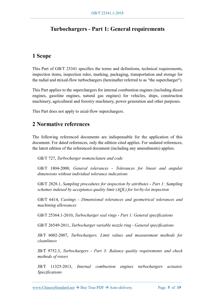 Similar standardsGB/T 23341.1-2018: Turbochargers - Part 1: General requirements---This is an excerpt. Full copy of true-PDF in English version (including equations, symbols, images, flow-chart, tables, and figures etc.), auto-downloaded/delivered in 9 seconds, can be purchased online: https://www.ChineseStandard.net/PDF.aspx/GBT23341.1-2018NATIONAL STANDARD OF THE PEOPLE’S REPUBLIC OF CHINA ICS 27.020 J 91 Replacing GB/T 23341.1-2009 Turbochargers - Part 1.General requirements Issued on. FEBRUARY 06, 2018 Implemented on. SEPTEMBER 01, 2018 Issued by. General Administration of Quality Supervision, Inspection and Quarantine; Standardization Administration of the People's Republic of China. Table of ContentsForeword... 3 1 Scope... 5 2 Normative references... 5 3 Terms and definitions... 6 4 Technical requirements... 10 5 Inspection items... 15 6 Inspection rules... 16 7 Marking, packaging, transportation and storage... 17ForewordGB/T 23341 "Turbochargers" consists of the following two parts. - Part 1.General requirements; - Part 2.Test methods. This Part is Part 1 of GB/T 23341. This Part was drafted in accordance with the rules given in GB/T 1.1-2009. This Part replaces GB/T 23341.1-2009 "Turbochargers - Part 1.General requirements". Compared with GB/T 23341.1-2009, in addition to the editorial modifications, the main technical changes are as follows. - Modify the normative references (see Chapter 2 of this Edition, Chapter 2 of Edition 2009); - Modify the terms and definitions (see Chapter 3 of this Edition, Chapter 3 of Edition 2009); - Modify the technical requirements (see Chapter 4 of this Edition, Chapter 4 of Edition 2009); - Modify the inspection items (see Chapter 5 of this Edition, Chapter 5 of Edition 2009); - Modify the inspection rules (see Chapter 6 of this Edition, Chapter 5 of Edition 2009). This Part was proposed by China Machinery Industry Federation. This Part shall be under the jurisdiction of National Technical Committee on Internal Combustion Engine of Standardization Administration of China (SAC/TC 177). The drafting organizations of this Part. Hunan Tianyan Machinery Co., Ltd., Shanghai Internal Combustion Engine Research Institute, Kunming Yunnei Power Co., Ltd., Shanghai Automotive Group Co., Ltd. Commercial Vehicle Technology Center, Changzhou Pingjiang Electric Equipment Co., Ltd., Ningbo Weifu Tianli Supercharging Technology Co., Ltd., Wuxi Kebo Turbocharger Co., Ltd., Zhejiang Jinfeng Auto Parts Manufacturing Co., Ltd. Main drafters of this Part. Hu Liaoping, Ji Weibin, Xia Yueli, Liu Shiyuan, Qiao Liangliang, Liu Lin, Sui Zhenhua, Bi Jinguang, Shen Yan, Dai Zhihui, Dai Hua, Chen Liqiong, Wu Tao, Wang Jian. Version of standard substituted by this Part is. - GB/T 23341.1-2009. Turbochargers - Part 1.General requirements1 ScopeThis Part of GB/T 23341 specifies the terms and definitions, technical requirements, inspection items, inspection rules, marking, packaging, transportation and storage for the radial and mixed-flow turbochargers (hereinafter referred to as "the supercharger"). This Part applies to the superchargers for internal combustion engines (including diesel engines, gasoline engines, natural gas engines) for vehicles, ships, construction machinery, agricultural and forestry machinery, power generation and other purposes. This Part does not apply to axial-flow superchargers.2 Normative referencesThe following referenced documents are indispensable for the application of this document. For dated references, only the edition cited applies. For undated references, the latest edition of the referenced document (including any amendments) applies. GB/T 727, Turbocharger nomenclature and code GB/T 1804-2000, General tolerances - Tolerances for linear and angular dimensions without individual tolerance indications GB/T 2828.1, Sampling procedures for inspection by attributes - Part 1.Sampling schemes indexed by acceptance quality limit (AQL) for lot-by-lot inspection GB/T 6414, Castings - Dimensional tolerances and geometrical tolerances and machining allowances GB/T 25364.1-2010, Turbocharger seal rings - Part 1.General specifications GB/T 26549-2011, Turbocharger variable nozzle ring - General specifications JB/T 6002-2007, Turbochargers. Limit values and measurement methods for cleanliness3 Terms and definitionsFor the purposes of this document, the following terms and definitions apply. 3.1 basic turbocharger The parent-type supercharger that is newly developed according to the new product R&D program and has been approved. 3.2 transformed turbocharger The supercharger that the structure is the same as the basic supercharger, only the through-flow parts or installation and connection dimensions of the compressor or turbine are changed. 3.3 benchmark curve The performance curve of the basic turbocharger and its variant turbocharger that is determined when the product is finalized. 3.4 compressor pressure ratio; The ratio of the total pressure of the compressor outlet gas to the total pressure of the inlet gas. 3.5 turbine expansion ratio; πT The ratio of the turbine inlet gas total pressure to the outlet gas static pressure p2.4 Technical requirements4.1 General Turbocharger products shall be manufactured according to the product drawings and technical documents approved by the prescribed procedures. 4.2 Matching requirements for supercharger products 4.3 Supercharger manufacturing requirements 4.3.1 The compressor impeller blank of the supercharger shall comply with the provisions of Chapter 3 of JB/T 11786-2014. 4.3.3 The nozzle ring of the supercharger shall comply with the provisions of Chapter 4 of GB/T 26549-2011. 4.3.4 The actuator of the supercharger shall comply with the provisions of Chapter 3 of JB/T 11325-2013. 4.3.8 Before the supercharger is assembled, the parts shall be cleaned. The cleanliness of the whole turbocharger shall comply with the provisions of Chapter 3 of JB/T 6002- 2007. 4.3.9 The supercharger assembly shall comply with t