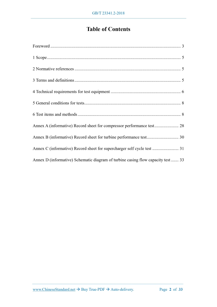 Similar standardsGB/T 23341.2-2018: Turbochargers - Part 2: Test methods---This is an excerpt. Full copy of true-PDF in English version (including equations, symbols, images, flow-chart, tables, and figures etc.), auto-downloaded/delivered in 9 seconds, can be purchased online: https://www.ChineseStandard.net/PDF.aspx/GBT23341.2-2018NATIONAL STANDARD OF THE PEOPLE’S REPUBLIC OF CHINA ICS 27.020 J 91 Replacing GB/T 23341.2-2009 Turbochargers - Part 2.Test methods Issued on. FEBRUARY 06, 2018 Implemented on. SEPTEMBER 01, 2018 Issued by. General Administration of Quality Supervision, Inspection and Quarantine; Standardization Administration of the People's Republic of China. Table of ContentsForeword... 3 1 Scope... 5 2 Normative references... 5 3 Terms and definitions... 5 4 Technical requirements for test equipment... 6 5 General conditions for tests... 8 6 Test items and methods... 8 Annex A (informative) Record sheet for compressor performance test... 28 Annex B (informative) Record sheet for turbine performance test... 30 Annex C (informative) Record sheet for supercharger self cycle test... 31 Annex D (informative) Schematic diagram of turbine casing flow capacity test... 332 Normative referencesThe following referenced documents are indispensable for the application of this document. For dated references, only the edition cited applies. For undated references, the latest edition of the referenced document (including any amendments) applies. GB/T 2624 (all parts), Full differential pressure device installed in a pipe of circular cross-section measuring fluid flow GB/T 23341.1-2018, Turbochargers - Part 1.General requirements JB/T 6002-2007, Turbochargers. Limit values and measurement methods for cleanliness JB/T 9752.3, Turbochargers - Part 3.Balance quality requirements and check methods of rotors JB/T 12334-2015, Measuring method for noise of turbochargers JB/T 12335-2015, Turbochargers. Leakage test method3 Terms and definitionsFor the purposes of this document, the terms and definitions defined in GB/T 23341.1 as well as the followings apply. 3.1 hot blast test The test that the external source compressed air is heated and input to the turbine, and the supercharger is driven by the thermal expansion of the high-temperature gas. 3.3 compressor surge flow The speed of the supercharger is constant. When the flow rate of the compressor decreases to a certain value, the outlet pressure and speed of the compressor will fluctuate violently. Compressor surge flow refers to the corresponding flow value at this time. 3.4 compressor choke flow The speed of the supercharger is constant. With the reduction of the compressor pressure ratio, the flow of the compressor does not increase any more. Compressor choke flow refers to the corresponding flow value at this time.4 Technical requirements for test equipment4.1 Test bench pipeline 4.2 Measurement of rotate speed The rotate speed of the supercharger shall be measured by a method that does not disturb the flow, such as the non-contact electromagnetic sensor tube speed measurement or photoelectric speed measurement instrument for the magnetization of the compressor impeller lock nut. Instrument accuracy is ±0.2% of full scale. 4.3 Pressure measurement 4.3.3 Ambient barometric pressure measurement. Instrument accuracy is ±2% of full scale. 4.4 Temperature measurement 4.4.1 Compressor and turbine inlet and outlet temperatures shall be measured in circular section measuring tubes by electrical thermometers with stagnant sheaths. The measuring point shall be arranged at a position of 0.5 times the pipe diameter behind the static pressure measuring point (in the direction of the airflow). It shall be staggered from the pressure measuring point. 4.4.2 When measuring the performance of the compressor, the accuracy of the instrument is ±0.3% of the full scale. When measuring turbine performance, the instrument accuracy is ±0.5% of full scale. For other measurement of turbine inlet and outlet temperature, the instrument accuracy is ±1% of full scale. 4.4.3 Lubricating oil temperature measurement. Instrument accuracy is ±2% of full scale. 4.5 Flow measurement Compressor flow measurement can be carried out by gas mass flowmeter or standard orifice flowmeter or end-face intake double-wire flowmeter.5 General conditions for tests5.1 The supercharger used for the test shall meet the requirements of the product technical documents and pass the inspection. 5.4 During the test, unless otherwise specified, the following parameters shall be controlled.6 Test items and methods6.1 Compressor performance test 6.1.1 Test conditions The performance test of the compressor shall be carried out on a special bench that can adjust the working conditions and measurable parameters. The test bench and test conditions shall comply with the provisions of Chapter 4 and Chapter 5. 6.1.2 Test methods 6.1.2.3 During the test, each equal-conversion speed line is measured point by point from surge flow to choke flow. Between the surge flow and the choke flow, the measurement points shall be no less than 6 points, evenly distributed. When the compressor runs close to the surge area, the total pressure fluctuation range of the compressor outlet is more than 10%. At this time, the supercharger is accompanied by a regular abnormal noise. Compressor air flow shall be adjusted slowly. Control the total pressure fluctuation of the compressor outlet within 2%. Measure the compressor surge flow point. 6.1.3 Test steps Carry out the test according to the following test steps. stopped running. 6.1.4 Measurement parameters During the test, measure the following parameters. 6.1.5 Data processing According to the parameters measured in the test, according to the relevant formulas in GB/T 23341.1-2018, calculate compressor conversion flow, compressor efficiency, compressor pressure ratio. 6.2 Turbine performance test 6.2.1 Test conditions The test shall be carried out on a special bench tha