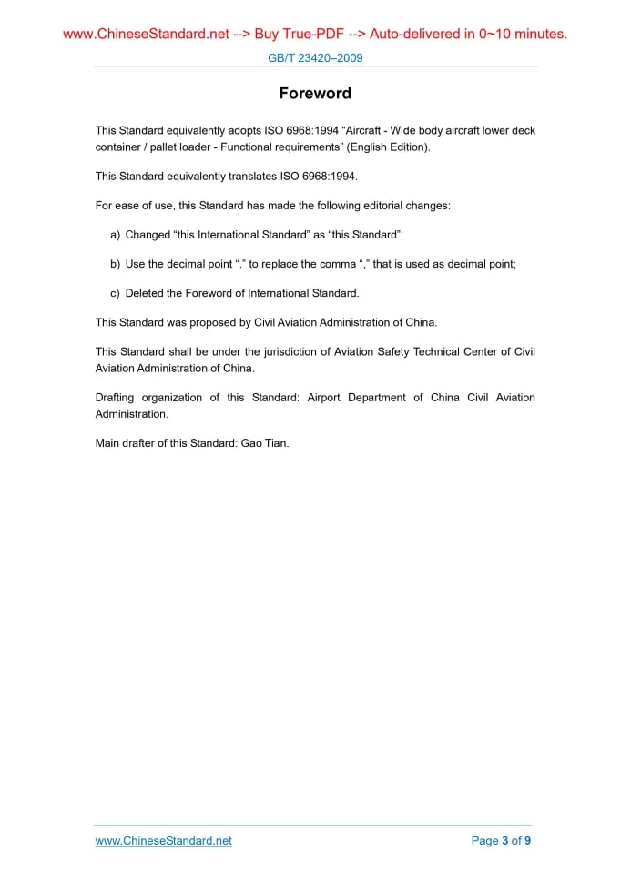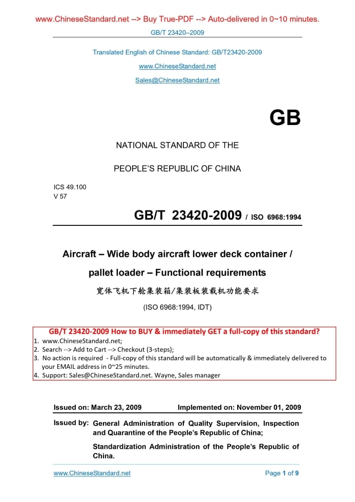 Similar standardsGB/T 23420-2009: Aircraft -- Wide body aircraft lower deck container/pallet loader -- Functional requirements---This is an excerpt. Full copy of true-PDF in English version (including equations, symbols, images, flow-chart, tables, and figures etc.), auto-downloaded/delivered in 9 seconds, can be purchased online: https://www.ChineseStandard.net/PDF.aspx/GBT23420-2009 GB NATIONAL STANDARD OF THE PEOPLE’S REPUBLIC OF CHINA ICS 49.100 V 57 GB/T 23420-2009 / ISO 6968.1994 Aircraft – Wide body aircraft lower deck container / pallet loader – Functional requirements (ISO 6968.1994, IDT) Issued on: MARCH 23, 2009 Implemented on: NOVEMBER 01, 2009 Issued by. General Administration of Quality Supervision, Inspection and Quarantine of the People’s Republic of China; Standardization Administration of the People’s Republic of China. Table of ContentsForeword... 3 1 Scope... 4 2 Normative references... 5 3 Structure and overall dimensions... 5 4 Platform design, guide rails and stops... 6 5 Platform operation and loading... 7 6 Mobility and stability... 8 7 Controls... 9ForewordThis Standard equivalently adopts ISO 6968.1994 “Aircraft - Wide body aircraft lower deck container / pallet loader - Functional requirements” (English Edition). This Standard equivalently translates ISO 6968.1994. For ease of use, this Standard has made the following editorial changes. a) Changed “this International Standard” as “this Standard”; b) Use the decimal point “.” to replace the comma “,” that is used as decimal point; c) Deleted the Foreword of International Standard. This Standard was proposed by Civil Aviation Administration of China. This Standard shall be under the jurisdiction of Aviation Safety Technical Center of Civil Aviation Administration of China. Drafting organization of this Standard. Airport Department of China Civil Aviation Administration. Main drafter of this Standard. Gao Tian. For further information, see IATA Specification AHM 931, “Functional specification for lower deck container pallet loader”.2 Normative referencesThe articles contained in the following documents have become this Standard when they are quoted herein. For the dated documents so quoted, all the modifications (excluding corrections) or revisions made thereafter shall not be applicable to this Standard. For the undated documents so quoted, the latest editions shall be applicable to this Standard. ISO 4116.1986, Air cargo equipment – Ground equipment requirements for compatibility with aircraft unit load devices3 Structure and overall dimensions3.1 On an adequate chassis, the loader shall provide two platforms. a) a front platform which is positioned at the applicable aircraft door and which remains at this position during the loading/unloading operation; b) a main platform for up and down movement between 483 mm (19 in) and 3450 mm (136 in). 3.2 The overall height of the entire unit shall not exceed 3 600 mm (142 in) when being driven. The height of the front platform (top of rollers) shall not exceed 1 880 mm (74 in) in the fully down position. 3.3 The overall dimensions of the unit shall be kept to a minimum. 3.4 The loader shall support at their maximum gross weight. a) two half-size containers on the main platform and simultaneously one half size container on the front platform; b) one pallet on the main platform, and simultaneously one half-size container on the front platform. 3.5 The unit shall have adequate clearance underneath from any portion of the equipment to the ground when negotiating two ramps that intersect at 5°. 3.6 The loader shall not interfere with the positioning of the aircraft tractor below the fuselage of the aircraft. with and without the engine running. 5.3 Both the front and main platform elevating mechanisms shall incorporate safety features to prevent sudden collapse in the event of system failure. 5.4 Load movement in and out of the aircraft shall be carried out by one person (operator). The unit shall be capable of being positioned and operated by one person. The operator shall be able to open the aircraft door from the front platform. 5.5 The time taken for the main platform to reach maximum height from the lowered position and vice versa, i.e. one complete cycle, shall be less than 35 s. 5.6 The front platform shall be accessible from the ground at all times. 5.7 It shall not be possible to alter the height of either platform when containers/pallets are bridging the platforms.6 Mobility and stability6.1 The unit shall be capable of being driven at speeds up to 16 km/h (10 mph) for at least 3 km (2 miles). The unit does not require the capability of being driven when loaded. 6.2 Power steering shall be provided. 6.3 The unloaded unit shall be capable of starting from rest up a 3° incline under its own power. 6.4 The unit shall be capable of turning with a swept radius of less than 12.2 m (40 ft). 6.5 For the final safe positioning at the aircraft door a slow positive non-jerking speed is required. 6.6 Power-operated stabilizers shall be installed in order to provide for the stability required for loading/unloading operations and to unload the wheel axles. In case of power failure, manual retraction of the stabilizers shall be possible. 6.7 The unit in the raised position with stabilizers extended shall be safe in wind velocities up to 130 km/h (80 mph). In the lowered position, the loader shall remain stable in wind velocities up to 190 km/h (120 mph). 6.8 It shall not be possible. a) to activate the transfer system and to raise the main platform from the full down position if the stabilizers are not extended; b) to drive the loader when the stabilizers are extended; c) for stabilizers to collapse in the case of system failure.7 Controls7.1 All controls necessary to move and position the loader shall be located in the driver position. 7.2 An electrical control panel shall be provided to allow control of both platforms and complete loading/ 