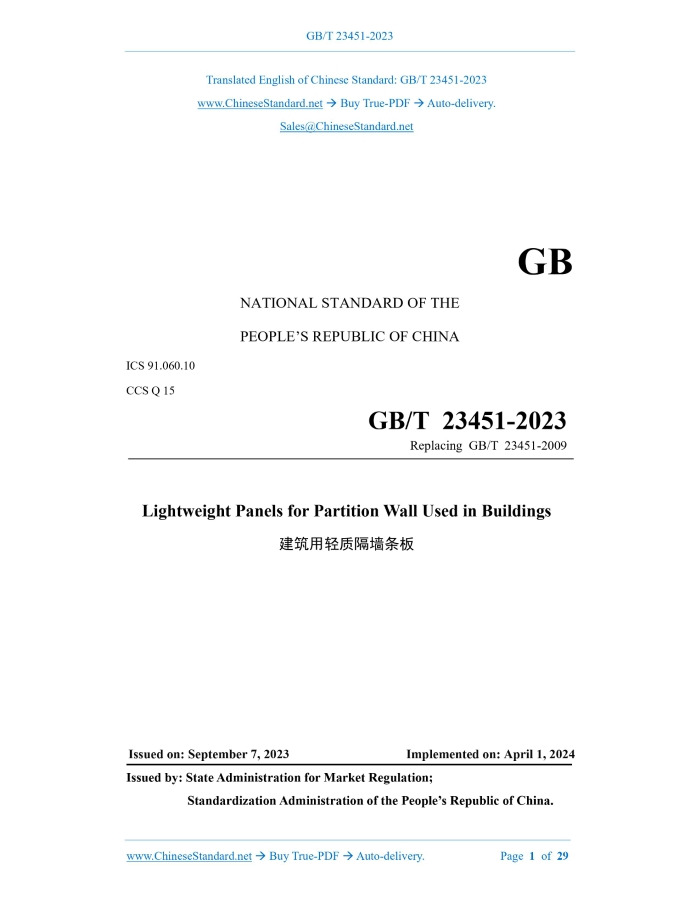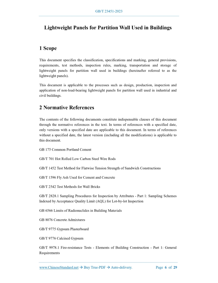 Similar standardsGB/T 23451-2023: Lightweight panels for partition wall used in buildings---This is an excerpt. Full copy of true-PDF in English version (including equations, symbols, images, flow-chart, tables, and figures etc.), auto-downloaded/delivered in 9 seconds, can be purchased online: https://www.ChineseStandard.net/PDF.aspx/GBT23451-2023GB NATIONAL STANDARD OF THE PEOPLE’S REPUBLIC OF CHINA ICS 91.060.10 CCS Q 15 Replacing GB/T 23451-2009 Lightweight Panels for Partition Wall Used in Buildings Issued on: SEPTEMBER 7, 2023 Implemented on: APRIL 1, 2024 Issued by. State Administration for Market Regulation; Standardization Administration of the People’s Republic of China. Table of ContentsForeword... 3 1 Scope... 6 2 Normative References... 6 3 Terms and Definitions... 8 4 Classification, Specifications and Marking... 10 5 General Provisions... 13 6 Requirements... 15 7 Test Methods... 17 8 Inspection Rules... 24 9 Marking, Transportation and Storage... 27 Lightweight Panels for Partition Wall Used in Buildings1 ScopeThis document specifies the classification, specifications and marking, general provisions, requirements, test methods, inspection rules, marking, transportation and storage of lightweight panels for partition wall used in buildings (hereinafter referred to as the lightweight panels). This document is applicable to the processes such as design, production, inspection and application of non-load-bearing lightweight panels for partition wall used in industrial and civil buildings.2 Normative ReferencesThe contents of the following documents constitute indispensable clauses of this document through the normative references in the text. In terms of references with a specified date, only versions with a specified date are applicable to this document. In terms of references without a specified date, the latest version (including all the modifications) is applicable to this document. GB 175 Common Portland Cement GB/T 701 Hot Rolled Low Carbon Steel Wire Rods GB/T 1452 Test Method for Flatwise Tension Strength of Sandwich Constructions GB/T 1596 Fly Ash Used for Cement and Concrete GB/T 2542 Test Methods for Wall Bricks GB/T 2828.1 Sampling Procedures for Inspection by Attributes - Part 1.Sampling Schemes Indexed by Acceptance Quality Limit (AQL) for Lot-by-lot Inspection GB 6566 Limits of Radionuclides in Building Materials GB 8076 Concrete Admixtures GB/T 9775 Gypsum Plasterboard GB/T 9776 Calcined Gypsum GB/T 9978.1 Fire-resistance Tests - Elements of Building Construction - Part 1.General Requirements YB/T 5294 Low Carbon Steel Wire for General Uses3 Terms and DefinitionsThe following terms and definitions are applicable to this document. 3.1 Lightweight Panel A prefabricated panel with a length of not less than 2.2 m, a length-to-width ratio of not less than 2, made of lightweight materials or by means of lightweight construction, with a surface density not greater than the value specified in this document, and manufactured by mechanized production. 3.2 Hollow Panel A lightweight panel with several through holes along the length of the board. 3.3 Solid Panel A non-porous lightweight panel. 3.4 Composite Sandwich Panel A prefabricated panel made of a composite of two or more materials with different properties or a composite of a face panel and a sandwich material. 3.5 Lightweight Concrete Panel A prefabricated concrete panel mixed with pumice, ceramsite, fly ash, coal gangue, slag, recycled aggregates and other lightweight aggregates or admixtures, using cement as the cementitious material, and steel bars, steel wire mesh, chopped fibers or other materials as the reinforced materials; or a prefabricated concrete panel molded by foaming process. 3.6 Lightweight Cement Panel A prefabricated panel for partition wall made with appropriate amounts of additives and admixtures, using alkali-resistant glass fiber mesh, steel wire mesh or steel wire mesh frame, and chopped fibers as the reinforced materials, cement as the cementitious material, or magnesium cementitious material. NOTE. Lightweight cement panels include glass fiber reinforced cement panels, foamed cement panels, panels of cement polystyrene particle, etc. 3.7 Panel of Cement Polystyrene Particle A cement panel made with appropriate amounts of additives and admixtures, using cement, polystyrene particles, etc. as the main materials, and steel wire mesh or steel wire mesh frame as the reinforced material. 3.8 Gypsum Hollow Panel A hollow panel made with an appropriate amount of additives, using gypsum as the main raw material, with cement content not exceeding 10%, and added with inorganic lightweight aggregates, chopped fibers, alkali-resistant glass fiber mesh, steel wire mesh and other reinforced materials. 3.9 Moisture-proof Gypsum Panel A gypsum panel that has moisture-proof properties after moisture-proof treatment during the molding process. 3.10 Lightweight Foamed Ceramic Panel A lightweight ceramic panel foamed and fired at high temperature using one or more of clay, quartz, ceramic fragments, tailings, red mud, fly ash, aeolian sand and other materials as the main raw materials, with the aid of a foaming agent. 3.11 Foamed Ceramic Composite Panel A lightweight composite panel made of foamed ceramic as the face material and other functional materials as the core material. 3.12 Composite Panel of Cement Polystyrene Particle A composite panel made of cement-based polystyrene particle composite material as the core material and inorganic sheet material as the face panel. 3.13 Composite Panel of Aluminum Honeycomb A lightweight composite panel made of single-layer or multi-layer aluminum honeycomb core panel as the core material and inorganic sheet materials bonded on both sides as the face panels. 3.14 Composite Panel of Paper Honeycomb A lightweight composite panel laminated, pressurized, and bonded using paper honeycomb core panel as the core material and inorganic sheet material as the face panel. 3.