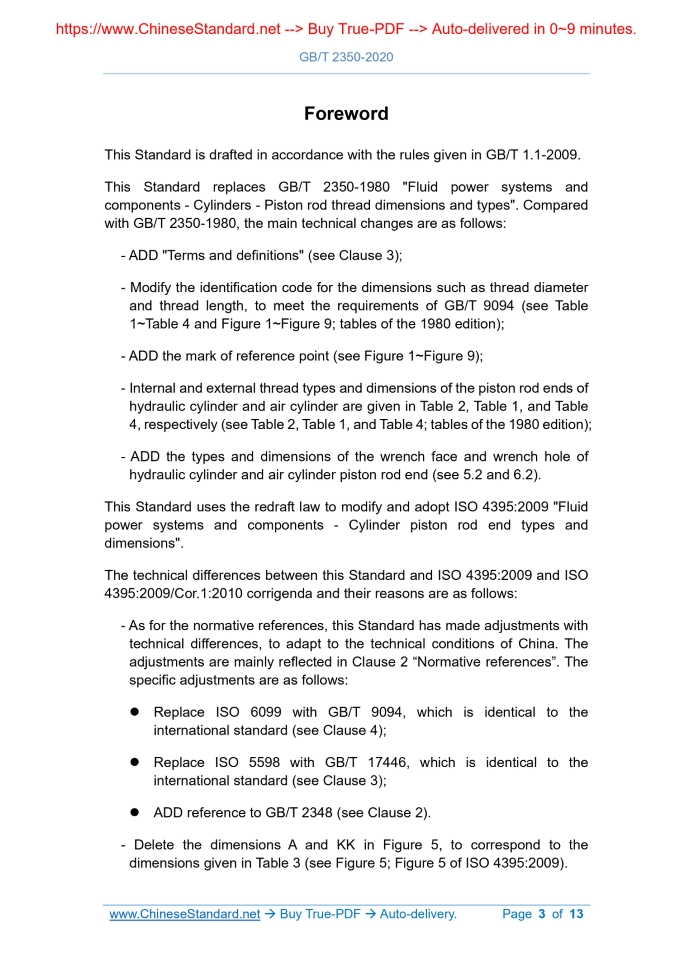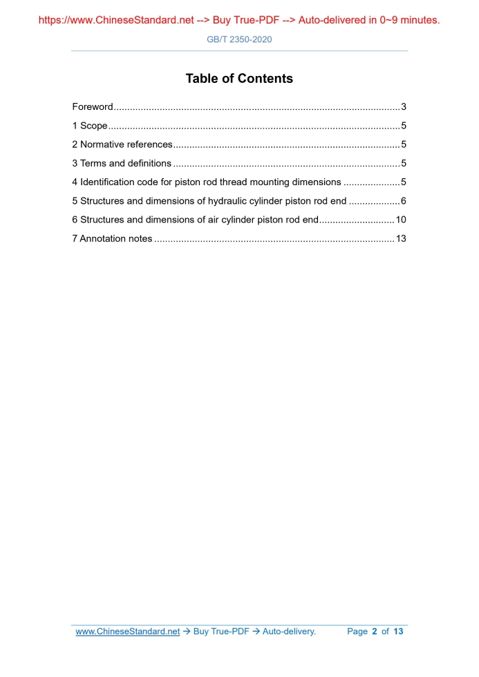 Similar standardsGB/T 2350-2020: Fluid power systems and components - Cylinder piston rod thread types and dimensions---This is an excerpt. Full copy of true-PDF in English version (including equations, symbols, images, flow-chart, tables, and figures etc.), auto-downloaded/delivered in 9 seconds, can be purchased online: https://www.ChineseStandard.net/PDF.aspx/GBT2350-2020 GB NATIONAL STANDARD OF THE PEOPLE’S REPUBLIC OF CHINA ICS 23.100.20 J 20 Replacing GB/T 2350-1980 Fluid power systems and components - Cylinder piston rod thread types and dimensions (ISO 4395:2009, Fluid power systems and components - Cylinder piston rod end types and dimensions, MOD) ISSUED ON: NOVEMBER 19, 2020 IMPLEMENTED ON: JUNE 01, 2021 Issued by: State Administration for Market Regulation; Standardization Administration of the PRC. Table of ContentsForeword ... 3 1 Scope ... 5 2 Normative references ... 5 3 Terms and definitions ... 5 4 Identification code for piston rod thread mounting dimensions ... 5 5 Structures and dimensions of hydraulic cylinder piston rod end ... 6 6 Structures and dimensions of air cylinder piston rod end ... 10 7 Annotation notes ... 13ForewordThis Standard is drafted in accordance with the rules given in GB/T 1.1-2009. This Standard replaces GB/T 2350-1980 "Fluid power systems and components - Cylinders - Piston rod thread dimensions and types". Compared with GB/T 2350-1980, the main technical changes are as follows: - ADD "Terms and definitions" (see Clause 3); - Modify the identification code for the dimensions such as thread diameter and thread length, to meet the requirements of GB/T 9094 (see Table 1~Table 4 and Figure 1~Figure 9; tables of the 1980 edition); - ADD the mark of reference point (see Figure 1~Figure 9); - Internal and external thread types and dimensions of the piston rod ends of hydraulic cylinder and air cylinder are given in Table 2, Table 1, and Table 4, respectively (see Table 2, Table 1, and Table 4; tables of the 1980 edition); - ADD the types and dimensions of the wrench face and wrench hole of hydraulic cylinder and air cylinder piston rod end (see 5.2 and 6.2). This Standard uses the redraft law to modify and adopt ISO 4395:2009 "Fluid power systems and components - Cylinder piston rod end types and dimensions". The technical differences between this Standard and ISO 4395:2009 and ISO 4395:2009/Cor.1:2010 corrigenda and their reasons are as follows: - As for the normative references, this Standard has made adjustments with technical differences, to adapt to the technical conditions of China. The adjustments are mainly reflected in Clause 2 “Normative references”. The specific adjustments are as follows: Replace ISO 6099 with GB/T 9094, which is identical to the international standard (see Clause 4); Replace ISO 5598 with GB/T 17446, which is identical to the international standard (see Clause 3); ADD reference to GB/T 2348 (see Clause 2). - Delete the dimensions A and KK in Figure 5, to correspond to the dimensions given in Table 3 (see Figure 5; Figure 5 of ISO 4395:2009). Fluid power systems and components - Cylinder piston rod thread types and dimensions1 ScopeThis Standard specifies the common series of piston rod threads for hydraulic cylinders and air cylinders that use hydraulic oil (fluid) or compressed air as the working medium; as well as the wrench face and wrench hole dimensions for assembly and tightening of the piston rod threads. This Standard applies to the external connecting threads of hydraulic cylinder and air cylinder piston rods.2 Normative referencesThe following documents are indispensable for the application of this document. For the dated references, only the editions with the dates indicated are applicable to this document. For the undated references, the latest edition (including all the amendments) are applicable to this document. GB/T 2348 Fluid power systems and components - Cylinder bores and piston rod diameters (GB/T 2348-2018, ISO 3320:2013, MOD) GB/T 9094 Fluid power systems and components - Identification code for cylinders mounting dimensions and mounting types (GB/T 9094-2020, ISO 6099:2018, IDT) GB/T 17446 Fluid power systems and components - Vocabulary (GB/T 17446-2012, ISO 5598:2008, IDT)3 Terms and definitionsThe terms and definitions defined in GB/T 17446 apply to this document.4 Identification code for piston rod thread mountingdimensions The identification code for piston rod thread mounting dimensions shall meet the requirements of GB/T 9094. ......Source: Above contents are excerpted from the full-copy PDF -- translated/reviewed by: www.ChineseStandard.net / Wayne Zheng et al. Tips & Frequently Asked Questions:Question 1: How long will the true-PDF of English version of GB/T 2350-2020 be delivered?Answer: The full copy PDF of English version of GB/T 2350-2020 can be downloaded in 9 seconds, and it will also be emailed to you in 9 seconds (double mechanisms to ensure the delivery reliably), with PDF-invoice.Question 2: Can I share the purchased PDF of GB/T 2350-2020_English with my colleagues?Answer: Yes. The purchased PDF of GB/T 2350-2020_English will be deemed to be sold to your employer/organization who actually paid for it, including your colleagues and your employer's intranet.Question 3: Does the price include tax/VAT?Answer: Yes. Our tax invoice, downloaded/delivered in 9 seconds, includes all tax/VAT and complies with 100+ countries' tax regulations (tax exempted in 100+ countries) -- See Avoidance of Double Taxation Agreements (DTAs): List of DTAs signed between Singapore and 100+ countriesQuestion 4: Do you accept my currency other than USD?Answer: Yes. www.ChineseStandard.us -- GB/T 2350-2020 -- Click this link and select your country/currency to pay, the exact amount in your currency will be printed on the invoice. Full PDF will also be downloaded/emailed in 9 seconds.Question 5: Should I purchase the latest version GB/T 2350-2020?Answer: Yes. Unless special scenarios such as technical c