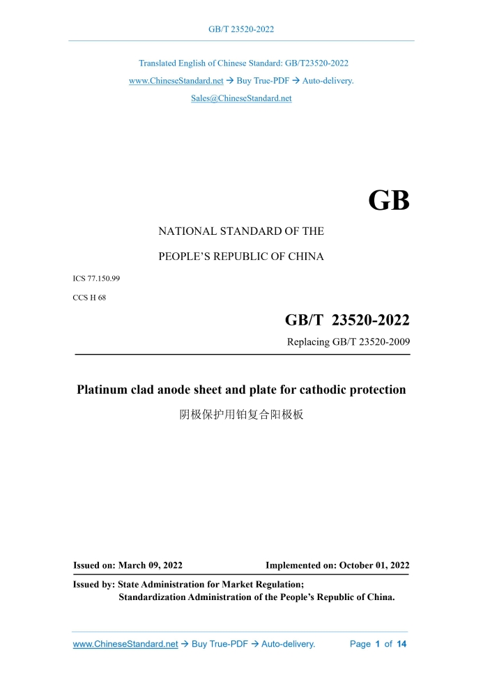 GB/T 23520-2022: Platinum clad anode sheet and plate for cathodic protection Delivery: 9 seconds. True-PDF full-copy in English & invoice will be downloaded + auto-delivered via email. See step-by-step procedure Status: Valid GB/T 23520: Historical versions