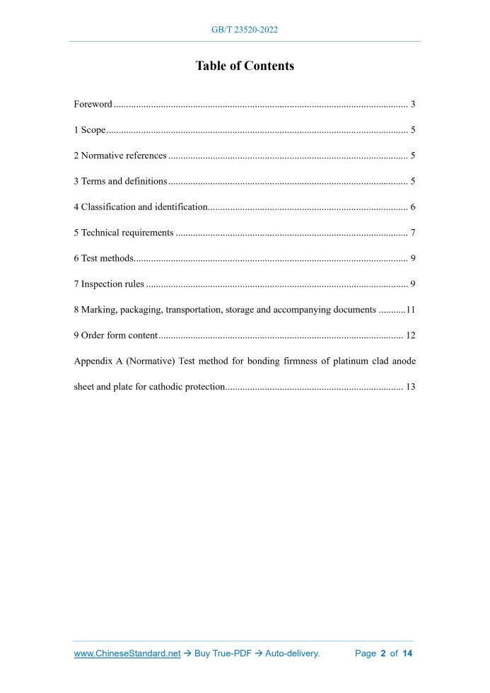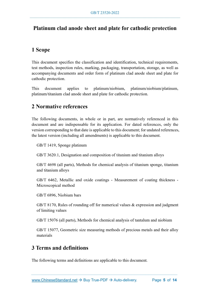 Similar standardsGB/T 23520-2022: Platinum clad anode sheet and plate for cathodic protection---This is an excerpt. Full copy of true-PDF in English version (including equations, symbols, images, flow-chart, tables, and figures etc.), auto-downloaded/delivered in 9 seconds, can be purchased online: https://www.ChineseStandard.net/PDF.aspx/GBT23520-2022NATIONAL STANDARD OF THE PEOPLE’S REPUBLIC OF CHINA ICS 77.150.99 CCS H 68 Replacing GB/T 23520-2009 Platinum clad anode sheet and plate for cathodic protection ISSUED ON: MARCH 09, 2022 IMPLEMENTED ON: OCTOBER 01, 2022 Issued by: State Administration for Market Regulation; Standardization Administration of the People’s Republic of China. Table of ContentsForeword ... 3 1 Scope ... 5 2 Normative references ... 5 3 Terms and definitions ... 5 4 Classification and identification ... 6 5 Technical requirements ... 7 6 Test methods ... 9 7 Inspection rules ... 9 8 Marking, packaging, transportation, storage and accompanying documents ... 11 9 Order form content ... 12 Appendix A (Normative) Test method for bonding firmness of platinum clad anode sheet and plate for cathodic protection ... 13 Platinum clad anode sheet and plate for cathodic protection1 ScopeThis document specifies the classification and identification, technical requirements, test methods, inspection rules, marking, packaging, transportation, storage, as well as accompanying documents and order form of platinum clad anode sheet and plate for cathodic protection. This document applies to platinum/niobium, platinum/niobium/platinum, platinum/titanium clad anode sheet and plate for cathodic protection.2 Normative referencesThe following documents, in whole or in part, are normatively referenced in this document and are indispensable for its application. For dated references, only the version corresponding to that date is applicable to this document; for undated references, the latest version (including all amendments) is applicable to this document. GB/T 1419, Sponge platinum GB/T 3620.1, Designation and composition of titanium and titanium alloys GB/T 4698 (all parts), Methods for chemical analysis of titanium sponge, titanium and titanium alloys GB/T 6462, Metallic and oxide coatings - Measurement of coating thickness - Microscopical method GB/T 6896, Niobium bars GB/T 8170, Rules of rounding off for numerical values & expression and judgment of limiting values GB/T 15076 (all parts), Methods for chemical analysis of tantalum and niobium GB/T 15077, Geometric size measuring methods of precious metals and their alloy materials3 Terms and definitionsThe following terms and definitions are applicable to this document.6 Test methods6.1 Chemical composition The chemical composition analysis method of platinum raw material shall be carried out in accordance with the provisions of GB/T 1419; the chemical composition analysis method of titanium raw material shall be carried out in accordance with the provisions of GB/T 4698 (all parts); the chemical composition analysis method of niobium raw material shall be carried out in accordance with the provisions of GB/T 15076 (all parts). 6.2 Overall dimensions and their allowable deviation 6.2.1 The thickness of the platinum clad layer of the product shall be measured according to the metallographic method specified in GB/T 6462. The average value of five points measured on each sample shall be taken as the final thickness of the measurement. 6.2.2 The overall dimensions – thickness, width and length – of the product shall be measured in accordance with the methods specified in GB/T 15077. 6.3 Bonding firmness The bonding firmness test of the platinum clad layer and the substrate shall be carried out in accordance with the provisions of Appendix A, and shall be checked visually. 6.4 Appearance quality Use a 10x magnifying glass to visually inspect the leak points; use a measuring tool of corresponding precision to measure the maximum linear dimension of the leak point; check the rest of the appearance quality with naked eyes.7 Inspection rules7.1 Inspection and acceptance 7.1.1 The quality inspection department of the supplier shall inspect the products, to ensure that the product quality conforms to the provisions of this document and the order form. 7.1.2 The buyer can inspect the received products according to the provisions of this document and the order form. If the inspection results are inconsistent with the provisions of this document and the order form, it shall report to the supplier within three months from the date of receipt of the products. An arbitration, if required, shall be taken on the buyer side through joint sampling by both the supplier and the buyer, or determined through negotiation. 7.5.4 Where the platinum clad layer thickness and bonding firmness test is unqualified, double the number of samples shall be taken from the batch of products (including the product that failed the original inspection) to repeat the test. If the repeated test items are all qualified, judge the batch of products to be qualified. If there are still unqualified samples in the results of repeated test items, judge the batch of products to be unqualified.8 Marking, packaging, transportation, storage andaccompanying documents 8.1 Marking 8.1.1 Product marking The following marks shall be printed, or a label shall be hanged, on the products that have passed the inspection: a) designation; b) state; c) specification; d) product batch number. 8.1.2 Packaging marking There shall be a label (or sign) on the product packaging box: a) name of the supplier; b) product designation, state and specification, net weight (quantity); c) product batch number. 8.2 Packaging, transportation, storage For each anode plate, first use soft paper to wrap the platinum side, then use plastic bubble films to wrap tightly; pack into a wooden box; use plastic bubble films to wrap around the product to keep the product from shaking in the wooden box. Products shall b