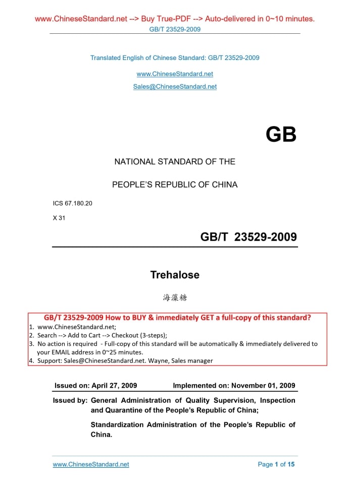 GB/T 23529-2009: Trehalose Delivery: 9 seconds. True-PDF full-copy in English & invoice will be downloaded + auto-delivered via email. See step-by-step procedure Status: Valid