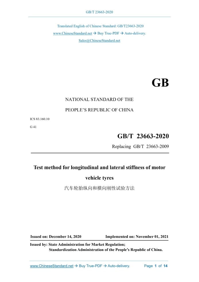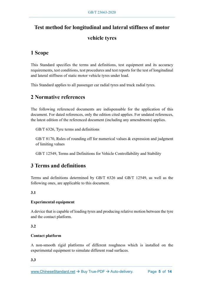 Similar standardsGB/T 23663-2020: Test method for longitudinal and lateral stiffness of motor vehicle tyres---This is an excerpt. Full copy of true-PDF in English version (including equations, symbols, images, flow-chart, tables, and figures etc.), auto-downloaded/delivered in 9 seconds, can be purchased online: https://www.ChineseStandard.net/PDF.aspx/GBT23663-2020NATIONAL STANDARD OF THE PEOPLE’S REPUBLIC OF CHINA ICS 83.160.10 G 41 Replacing GB/T 23663-2009 Test method for longitudinal and lateral stiffness of motor vehicle tyres ISSUED ON: DECEMBER 14, 2020 IMPLEMENTED ON: NOVEMBER 01, 2021 Issued by: State Administration for Market Regulation; Standardization Administration of the People’s Republic of China. Table of ContentsForeword ... 3 1 Scope ... 5 2 Normative references ... 5 3 Terms and definitions... 5 4 Test equipment and its accuracy requirements ... 6 5 Test conditions ... 7 6 Test steps ... 8 7 Test report ... 12 References ... 14 Test method for longitudinal and lateral stiffness of motor vehicle tyres1 ScopeThis Standard specifies the terms and definitions, test equipment and its accuracy requirements, test conditions, test procedures and test reports for the test of longitudinal and lateral stiffness of static motor vehicle tyres under load. This Standard applies to all passenger car radial tyres and truck radial tyres.2 Normative referencesThe following referenced documents are indispensable for the application of this document. For dated references, only the edition cited applies. For undated references, the latest edition of the referenced document (including any amendments) applies. GB/T 6326, Tyre terms and definitions GB/T 8170, Rules of rounding off for numerical values & expression and judgment of limiting values GB/T 12549, Terms and Definitions for Vehicle Controllability and Stability3 Terms and definitionsTerms and definitions determined by GB/T 6326 and GB/T 12549, as well as the following ones, are applicable to this document. 3.1 Experimental equipment A device that is capable of loading tyres and producing relative motion between the tyre and the contact platform. 3.2 Contact platform A non-smooth rigid platforms of different roughness which is installed on the experimental equipment to simulate different road surfaces. 3.3 4.1.4.1 The contact platform shall completely accommodate the entire part in contact with the tyre; the contact platform stroke shall be able to meet the test requirements. 4.1.4.2 The contact platform and its supporting structure shall have sufficient stiffness to ensure that when the loading device exerts a vertical force on the tyre, the platform shall not be deformed in the lateral, longitudinal and bending aspects. 4.1.4.3 The contact platform shall have sufficient roughness. 4.2 Accuracy requirements of test equipment 4.2.1 The angle between the vertical loading direction and the contact platform of the experimental equipment is 90°; the deviation is not more than 0.05°. 4.2.2 The accuracy of vertical force, longitudinal force and lateral force loading device is ±1.0% of full scale. 4.2.3 The accuracy of vertical displacement, longitudinal displacement and lateral displacement is ±0.5 mm. 4.2.4 The accuracy of vertical movement speed is ±2.5 mm/min. 4.2.5 The maximum range of the inflation pressure gauge for passenger car tyres is at least 500 kPa, and the accuracy is ±5 kPa; the maximum range of the inflation pressure gauge for truck tyres is at least 1 000 kPa, and the accuracy is ±10 kPa.5 Test conditions5.1 The tested tyres shall be parked for more than 24 h after vulcanization and before assembly. 5.2 The test rim should be the measurement rim specified in GB/T 2977 or GB/T 2978. Before installation, ensure that the bead seat and the mating surface of the tyre are clean and dry; it is not allowed to apply lubricants and other lubricating materials for the convenience of assembly. 5.3 The test load should be the maximum load of the tyre (when there are two conditions of use for single and double tyres, use the single tyre load). 5.4 Inflate the passenger car tyres with the air pressure specified in Table 1. Inflate the truck tyres with the air pressure corresponding to the maximum load. If agreed, it may be stipulated otherwise. Table 1 – Inflation pressure for longitudinal and lateral stiffness test of passenger car tyres in kilopascals Where: a1 – longitudinal stiffness, in Newtons per millimeter (N/mm); y – longitudinal force, in Newtons (N); x – longitudinal displacement, in millimeters (mm). 6.1.5 The longitudinal stiffness result is accurate to one decimal place; the longitudinal force is accurate to an integer place; the longitudinal displacement is accurate to two decimal places. The measurement and calculation results are rounded according to provisions of GB/T 8170. 6.1.6 Unload and adjust the air pressure to the specified value. 6.1.7 Repeat the process of 6.1.1 ~ 6.1.5, in which steps 6.1.1 and 6.1.2 are loaded to the maximum load of the tyre. 6.1.8 Repeat the process of 6.1.1 ~ 6.1.5, in which steps 6.1.1 and 6.1.2 are loaded to 120% of the maximum load of the tyre. Note: When necessary, the test can be carried out according to the vertical loading load different from the above. 6.2 Lateral stiffness test 6.2.1 Install the test tyre rim assembly on the corresponding test device and lock it. Apply a vertical force to the tyre at a speed of 50 mm/min; load it to 80% of the maximum load of the tyre; keep it for 5 s and then unload. Repeat the pre-test 3 times; adjust the tyre pressure to the specified value of 5.4 after the pre-test. 6.2.2 Apply a vertical force to the tyre at a speed of 50 mm/min; load it to 80% of the maximum load of the tyre; keep it for 1 min. 6.2.3 Move the contact platform along the Y' axis; the moving speed of the contact platform shall be 30 mm/min ~ 50 mm/min, until relative sliding occurs between the contact platform and the tyre or the maximum travel of the contact p