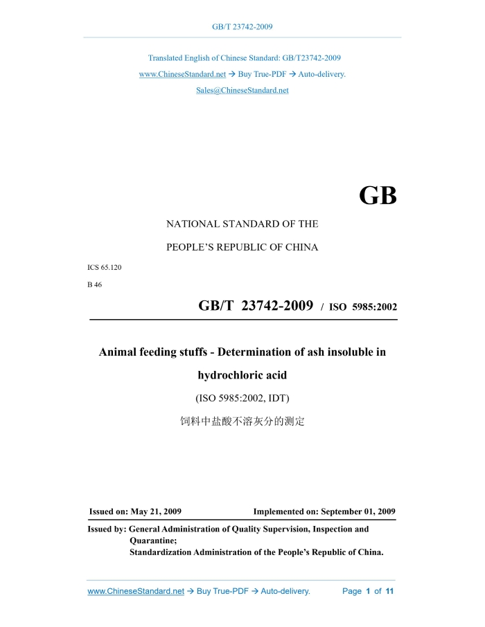GB/T 23742-2009: Animal feeding stuffs -- Determination of ash insoluble in hydrochloric acid Delivery: 9 seconds. True-PDF full-copy in English & invoice will be downloaded + auto-delivered via email. See step-by-step procedure Status: Valid