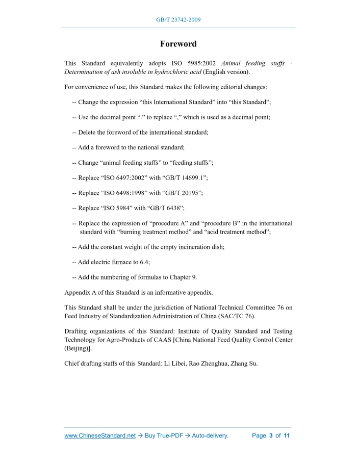 Similar standardsGB/T 23742-2009: Animal feeding stuffs -- Determination of ash insoluble in hydrochloric acid---This is an excerpt. Full copy of true-PDF in English version (including equations, symbols, images, flow-chart, tables, and figures etc.), auto-downloaded/delivered in 9 seconds, can be purchased online: https://www.ChineseStandard.net/PDF.aspx/GBT23742-2009GB NATIONAL STANDARD OF THE PEOPLE’S REPUBLIC OF CHINA ICS 65.120 B 46 GB/T 23742-2009 / ISO 5985:2002 Animal feeding stuffs - Determination of ash insoluble in hydrochloric acid (ISO 5985:2002, IDT) ISSUED ON: MAY 21, 2009 IMPLEMENTED ON: SEPTEMBER 01, 2009 Issued by: General Administration of Quality Supervision, Inspection and Quarantine; Standardization Administration of the People’s Republic of China. Table of ContentsForeword ... 3 1 Scope ... 4 2 Normative references ... 4 3 Terms and definitions ... 4 4 Principle ... 5 5 Reagents ... 5 6 Instruments and equipment ... 5 7 Sampling ... 6 8 Determination steps ... 6 9 Calculation of results ... 7 10 Precision ... 8 11 Test report ... 9 Appendix A (Informative) Results of interlaboratory tests ... 10 References ... 11ForewordThis Standard equivalently adopts ISO 5985:2002 Animal feeding stuffs - Determination of ash insoluble in hydrochloric acid (English version). For convenience of use, this Standard makes the following editorial changes: -- Change the expression “this International Standard” into “this Standard”; -- Use the decimal point “.” to replace “,” which is used as a decimal point; -- Delete the foreword of the international standard; -- Add a foreword to the national standard; -- Change “animal feeding stuffs” to “feeding stuffs”; -- Replace “ISO 6497:2002” with “GB/T 14699.1”; -- Replace “ISO 6498:1998” with “GB/T 20195”; -- Replace “ISO 5984” with “GB/T 6438”; -- Replace the expression of “procedure A” and “procedure B” in the international standard with “burning treatment method” and “acid treatment method”; -- Add the constant weight of the empty incineration dish; -- Add electric furnace to 6.4; -- Add the numbering of formulas to Chapter 9. Appendix A of this Standard is an informative appendix. This Standard shall be under the jurisdiction of National Technical Committee 76 on Feed Industry of Standardization Administration of China (SAC/TC 76). Drafting organizations of this Standard: Institute of Quality Standard and Testing Technology for Agro-Products of CAAS [China National Feed Quality Control Center (Beijing)]. Chief drafting staffs of this Standard: Li Libei, Rao Zhenghua, Zhang Su. Animal feeding stuffs - Determination of ash insoluble in hydrochloric acid1 ScopeThis Standard specifies the determination method of ash insoluble in hydrochloric acid. The applicable treatment method depends on the nature of the sample. a) The burning treatment method is applicable to organic single feed and compound feed (except those mentioned in acid treatment method). b) The acid treatment method is applicable to minerals, mineral mixtures and compound feeds whose ash insoluble in hydrochloric acid measured by the burning treatment method is greater than 1%.2 Normative referencesThe terms in the following documents become the terms of this Standard by reference to this Standard. For dated references, all subsequent amendments (not including errata content) or revisions do not apply to this standard. However, parties to agreements that are based on this Standard are encouraged to study whether the latest versions of these documents can be used. For undated references, the latest edition applies to this Standard. GB/T 6438, Animal feeding stuffs - Determination of crude ash (GB/T 6438-2007, ISO 5984:2002, IDT) GB/T 14699.1, Feeding stuffs - Sampling (GB/T 14699.1-2005, ISO 6497:2002, IDT) GB/T 20195, Animal feeding stuffs - Preparation of test samples (GB/T 20195-2006, ISO 6498:1998, IDT)3 Terms and definitionsThe following terms and definitions are applicable to this Standard. 3.1 Ash insoluble in hydrochloric acid The part of ash that is insoluble in dilute hydrochloric acid under the conditions specified in this Standard. ......Source: Above contents are excerpted from the full-copy PDF -- translated/reviewed by: www.ChineseStandard.net / Wayne Zheng et al. Tips & Frequently Asked Questions:Question 1: How long will the true-PDF of English version of GB/T 23742-2009 be delivered?Answer: The full copy PDF of English version of GB/T 23742-2009 can be downloaded in 9 seconds, and it will also be emailed to you in 9 seconds (double mechanisms to ensure the delivery reliably), with PDF-invoice.Question 2: Can I share the purchased PDF of GB/T 23742-2009_English with my colleagues?Answer: Yes. The purchased PDF of GB/T 23742-2009_English will be deemed to be sold to your employer/organization who actually paid for it, including your colleagues and your employer's intranet.Question 3: Does the price include tax/VAT?Answer: Yes. Our tax invoice, downloaded/delivered in 9 seconds, includes all tax/VAT and complies with 100+ countries' tax regulations (tax exempted in 100+ countries) -- See Avoidance of Double Taxation Agreements (DTAs): List of DTAs signed between Singapore and 100+ countriesQuestion 4: Do you accept my currency other than USD?Answer: Yes. www.ChineseStandard.us -- GB/T 23742-2009 -- Click this link and select your country/currency to pay, the exact amount in your currency will be printed on the invoice. Full PDF will also be downloaded/emailed in 9 seconds.How to buy and download a true PDF of English version of GB/T 23742-2009?A step-by-step guide to download PDF of GB/T 23742-2009_EnglishStep 1: Visit website https://www.ChineseStandard.net (Pay in USD), or https://www.ChineseStandard.us (Pay in any currencies such as Euro, KRW, JPY, AUD).Step 2: Search keyword "GB/T 23742-2009". Step 3: Click "Add to Cart". If multiple PDFs are required, repeat steps 2 and 3 to add up to 12 PDFs 