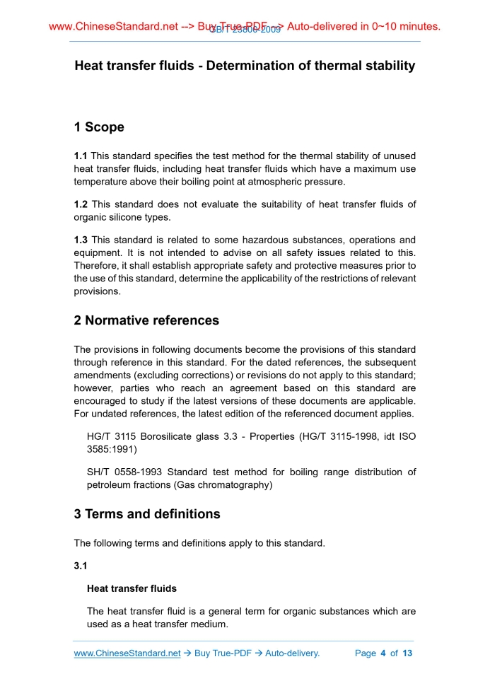 Similar standardsGB/T 23800-2009: Heat transfer fluids -- Determination of thermal stability---This is an excerpt. Full copy of true-PDF in English version (including equations, symbols, images, flow-chart, tables, and figures etc.), auto-downloaded/delivered in 9 seconds, can be purchased online: https://www.ChineseStandard.net/PDF.aspx/GBT23800-2009GB NATIONAL STANDARD OF THE PEOPLE’S REPUBLIC OF CHINA ICS 75.100 E 34 Heat transfer fluids - Determination of thermal stability Issued on. MAY 18, 2009 Implemented on. NOVEMBER 01, 2009 Issued by. General Administration of Quality Supervision, Inspection and Quarantine; Standardization Administration of PRC. Table of ContentsForeword... 3 1 Scope... 4 2 Normative references... 4 3 Terms and definitions... 4 4 Summary of method... 6 5 Meaning and application... 6 6 Instruments and materials... 6 7 Test procedure... 7 8 Report... 13ForewordThis standard modifies and uses the German national standard DIN 51528.1998 “Determination of the thermal stability of unused heat transfer fluids” (English version). This standard was redrafted in accordance with DIN 51528.1998. In order to adapt to China’s national conditions, this standard made modifications when adopting DIN 51528.1998.The main technical differences between this standard and DIN 51528.1998 are as follows. - CHANGE the standard name into “Heat transfer fluids - Determination of thermal stability”; - CHANGE the unit of temperature from K to °C; - ADD the requirements for the accuracy of weighing of specimen and instrument; - INCREASE the minimum volume of glass ampoule from 5 mL to 15 mL; - ADD the report of the appearance of the specimen after heating; - ADD the requirements for gas chromatography analysis; - In clause 6.1.1, ADD that “guarantee the even distribution of temperature”; - CHANGE the test time of each specimen from not less than 480 h to not less than 720 h. This standard was proposed by the National Petroleum Products and Lubricants Standardization Technical Committee (SAC/TC 280). This standard shall be under the jurisdiction of the National Petroleum Products and Lubricants Standardization Technical Committee, Subcommittee of Petroleum Fuels and Lubricants (SAC/TC 280/SC 1). Drafting organization of this standard. Petrochemical Research Institute of China Petroleum and Chemical Corporation. The main drafters of this standard. Kang Yin, Liang Hong, Jin Ke. Heat transfer fluids - Determination of thermal stability1 Scope1.1 This standard specifies the test method for the thermal stability of unused heat transfer fluids, including heat transfer fluids which have a maximum use temperature above their boiling point at atmospheric pressure. 1.2 This standard does not evaluate the suitability of heat transfer fluids of organic silicone types. 1.3 This standard is related to some hazardous substances, operations and equipment. It is not intended to advise on all safety issues related to this. Therefore, it shall establish appropriate safety and protective measures prior to the use of this standard, determine the applicability of the restrictions of relevant provisions.2 Normative referencesThe provisions in following documents become the provisions of this standard through reference in this standard. For the dated references, the subsequent amendments (excluding corrections) or revisions do not apply to this standard; however, parties who reach an agreement based on this standard are encouraged to study if the latest versions of these documents are applicable. For undated references, the latest edition of the referenced document applies. HG/T 3115 Borosilicate glass 3.3 - Properties (HG/T 3115-1998, idt ISO 3585.1991) SH/T 0558-1993 Standard test method for boiling range distribution of petroleum fractions (Gas chromatography)3 Terms and definitionsThe following terms and definitions apply to this standard. 3.1 Heat transfer fluids The heat transfer fluid is a general term for organic substances which are used as a heat transfer medium. Note. The heat transfer fluids include all organic media which is used for the purposes of indirect heat transfer, including heat transfer fluids, hot oils, organic heat carrier, heating media, etc. 3.2 Thermal stability The ability of heat transfer fluids to resist chemical decomposition at high- temperatures. 3.3 Gaseous decomposition products Substances whose boiling point is below room temperature under normal pressure, such as hydrogen and methane. 3.4 Low-boiling components The substances whose boiling range of the specimen after heating as measured through a simulated distillation method is below the initial boiling point of the unused heat transfer fluids.4 Summary of method4.1 The heat transfer fluids are heated at a predetermined temperature. The deterioration rate of the heat transfer fluids is determined to evaluate the thermal stability of the heat transfer fluids. 4.1.1 The unused heat transfer fluid can be sealed in a glass ampoule which is placed in a metal protective tube, or otherwise added into a steel tester and sealed. The metal protective tube or steel tester which is loaded with a glass ampoule is heated to a specified time at the specified test temperature, the test temperature is preferably within the upper limit of the temperature range in which the product to be tested is used. 4.1.3 Compare the test results of the heat transfer fluid before and after it is heated.5 Meaning and application5.1 Under the laboratory conditions as specified in this standard, this method records and reflects the effect of heat on the heat transfer fluid as a function of temperature and heating time. 5.2 It cannot extrapolate the information on the performance of heat transfer fluids in industrial heat transfer devices from the test results of this method, because the performance of heat transfer fluids in the device is also affected by other materials, various pollutants, heat accumulation, temperature in the circulatory syst
