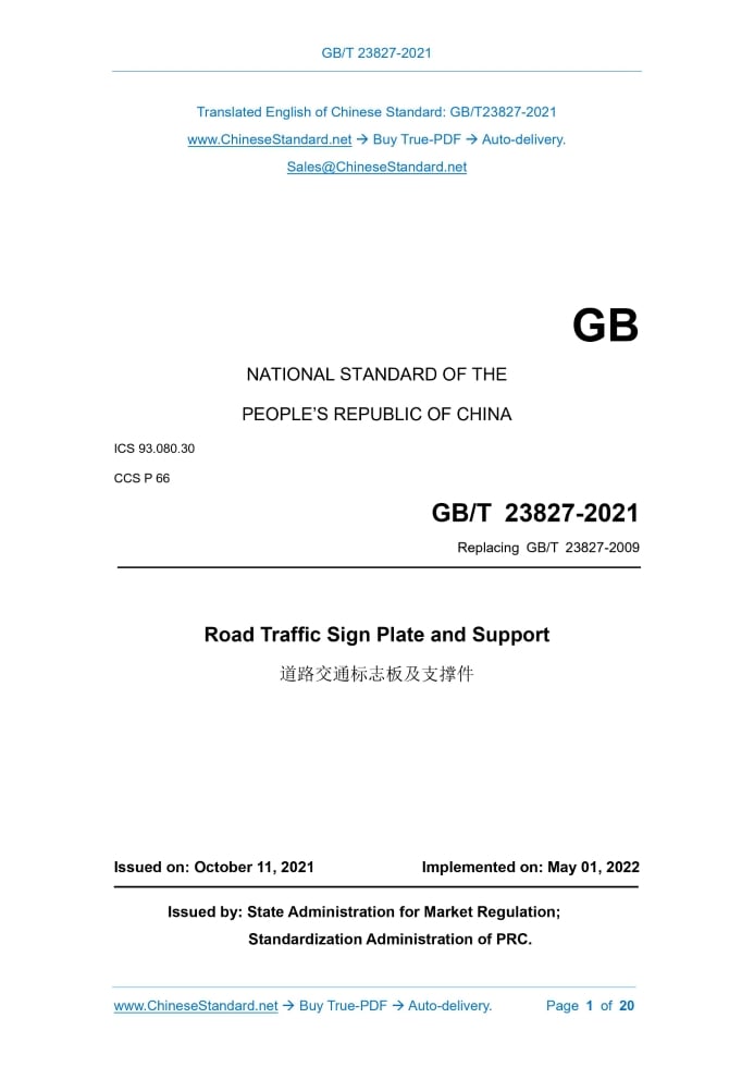 GB/T 23827-2021: Road traffic sign plate and support Delivery: 9 seconds. True-PDF full-copy in English & invoice will be downloaded + auto-delivered via email. See step-by-step procedure Status: Valid GB/T 23827: Historical versions
