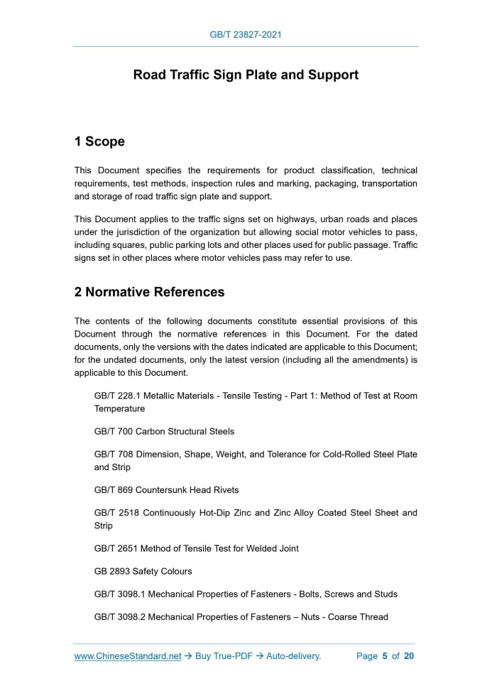 Similar standardsGB/T 23827-2021: Road traffic sign plate and support---This is an excerpt. Full copy of true-PDF in English version (including equations, symbols, images, flow-chart, tables, and figures etc.), auto-downloaded/delivered in 9 seconds, can be purchased online: https://www.ChineseStandard.net/PDF.aspx/GBT23827-2021GB NATIONAL STANDARD OF THE PEOPLE’S REPUBLIC OF CHINA ICS 93.080.30 CCS P 66 Replacing GB/T 23827-2009 Road Traffic Sign Plate and Support ISSUED ON: OCTOBER 11, 2021 IMPLEMENTED ON: MAY 01, 2022 Issued by: State Administration for Market Regulation; Standardization Administration of PRC. Table of ContentsForeword ... 3 1 Scope ... 5 2 Normative References ... 5 3 Terms and Definitions ... 7 4 Product Classification ... 7 5 Technical Requirements ... 7 6 Test Methods ... 14 7 Inspection Rules ... 18 8 Marking, Packaging, Transportation and Storage ... 19 Road Traffic Sign Plate and Support1 ScopeThis Document specifies the requirements for product classification, technical requirements, test methods, inspection rules and marking, packaging, transportation and storage of road traffic sign plate and support. This Document applies to the traffic signs set on highways, urban roads and places under the jurisdiction of the organization but allowing social motor vehicles to pass, including squares, public parking lots and other places used for public passage. Traffic signs set in other places where motor vehicles pass may refer to use.2 Normative ReferencesThe contents of the following documents constitute essential provisions of this Document through the normative references in this Document. For the dated documents, only the versions with the dates indicated are applicable to this Document; for the undated documents, only the latest version (including all the amendments) is applicable to this Document. GB/T 228.1 Metallic Materials - Tensile Testing - Part 1: Method of Test at Room Temperature GB/T 700 Carbon Structural Steels GB/T 708 Dimension, Shape, Weight, and Tolerance for Cold-Rolled Steel Plate and Strip GB/T 869 Countersunk Head Rivets GB/T 2518 Continuously Hot-Dip Zinc and Zinc Alloy Coated Steel Sheet and Strip GB/T 2651 Method of Tensile Test for Welded Joint GB 2893 Safety Colours GB/T 3098.1 Mechanical Properties of Fasteners - Bolts, Screws and Studs GB/T 3098.2 Mechanical Properties of Fasteners – Nuts - Coarse Thread JT/T 688 Retroreflection Vocabulary3 Terms and DefinitionsFor the purposes of this Document, the terms and definitions given in JT/T 688 and the following apply. 3.1 Sign plate An assembly that consists of a sign base plate, a sign plate surface, chutes, rivets, etc. 3.2 Support A member that supports and connects the fastening sign plate. NOTE: Supports include posts, beams, flanges, hoops and fasteners, etc.4 Product ClassificationRoad traffic sign plates are classified into retroreflective, illuminating and light-emitting types according to their optical properties. Among them, the illuminating type is divided into internal and external illuminating types.5 Technical Requirements5.1 Structural size 5.1.1 Road traffic signs are composed of sign plates and supports; and their shape and size shall meet the requirements of GB 5768.2 or design requirements. 5.1.2 The maximum allowable deviation of the external size of the sign plate is ±5mm; if the external size is greater than 1.2m, the allowable deviation is ±0.5% of the external size. 5.1.3 The reflective film pasted on the retroreflective sign plate shall meet the requirements of GB/T 18833. The black film with the durability matching the reflective film is pasted on the reflective film as a mask; and the plate surface information can also be formed by printing ink or digital printing on the reflective film. When necessary, active light-emitting units can be added or sign illuminating facilities can be installed to the sign plate surface according to the terrain and sunshine conditions. When the illuminating type or light-emitting type is adopted, its performance shall comply with the provisions of GB 5768.2 and GB/T 31446. 5.1.5 The sign base plate can be reinforced with a chute; and the reinforcing method and the size of the chute shall meet the design requirements. The reinforcement connection between the sign bottom plate and the chute can adopt riveting, welding or other technological methods, and shall meet the following requirements. a) When using the aluminium alloy plate to make the sign base plate, the countersunk rivets shall be used for connection. The riveting spacing shall be uniform, generally 150mm±50mm; and the riveting shall be strengthened at the end of the chute to disperse the stress. The shape of the rivet shall meet the requirements of GB/T 869; the diameter should be no less than 4mm, and it shall match the sign base plate and the chute. b) The quality of the welding process shall be stable and reliable; there shall be no leakage welding, virtual welding and other phenomena; and the welding strength shall be uniform. The strength of welding or other process connection methods shall be no lower than the strength requirements of the same type of materials when connected by rivets. 5.1.6 The sign post can be made of H-section steel, steel pipe, aluminium alloy profile, wood, synthetic material and reinforced concrete pipe, etc., or steel truss. The shape and size of the sign post shall meet the design requirements; the outer diameter, thickness and curvature of the seamless steel pipe shall meet the requirements of GB/T 8162; and the outer diameter, thickness and ovality of the straight seam electric welded steel pipe shall meet the requirements of GB/T 13793. 5.1.7 When the sign post is a steel member, the top shall be covered with a post cap. The structure size of the post cap shall meet the design requirements. 5.1.8 The connection between the sign plate and the post can be in the form of hoop clamping or steel strap bundling; and its structural dimension