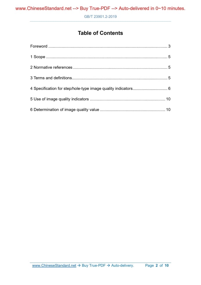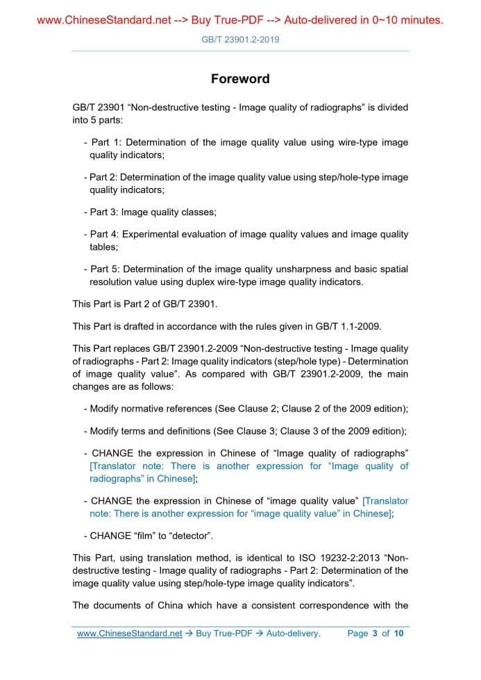 GB/T 23901 “Non-destructive testing - Image quality of radiographs” is divided into 5 parts: - Part 1: Determination of the image quality value using wire-type image quality indicators; - Part 2: Determination of the image quality value using step/hole-type image quality indicators; - Part 3: Image quality classes; - Part 4: Experimental evaluation of image quality values and image quality tables; - Part 5: Determination of the image quality unsharpness and basic spatial resolution value using duplex wire-type image quality indicators. This Part is Part 2 of GB/T 23901. This Part is drafted in accordance with the rules given in GB/T 1.1-2009. This Part replaces GB/T 23901.2-2009 “Non-destructive testing - Image quality of radiographs - Part 2: Image quality indicators (step/hole type) - Determination of image quality value”. As compared with GB/T 23901.2-2009, the main changes are as follows: - Modify normative references (See Clause 2; Clause 2 of the 2009 edition); - Modify terms and definitions (See Clause 3; Clause 3 of the 2009 edition); - CHANGE the expression in Chinese of “Image quality of radiographs” [Translator note: There is another expression for “Image quality of radiographs” in Chinese]; - CHANGE the expression in Chinese of “image quality value” [Translator note: There is another expression for “image quality value” in Chinese]; - CHANGE “film” to “detector”. This Part, using translation method, is identical to ISO 19232-2:2013 “Non- destructive testing - Image quality of radiographs - Part 2: Determination of the image quality value using step/hole-type image quality indicators”. The documents of China which have a consistent correspondence with the international documents normatively referenced in this Part are as follows: - GB/T 19802-2005 Non-destructive testing - Industrial radiographic illuminators - Minimum requirements (ISO 5580:1985, IDT) - GB/T 23901.4-2019 Non-destructive testing - Image quality of radiographs - Part 4: Experimental evaluation of image quality values and image quality tables (ISO 19232-4:2013, IDT) - GB/T 27050.1-2006 Conformity assessment - Suppliers declaration of conformity - part 1: General requirements (ISO/IEC 17050-1:2004, IDT) This Part was proposed by and shall be under the jurisdiction of National Technical Committee 56 on Non-destructive Testing of Standardization Administration of China (SAC/TC 56). Responsible drafting organizations of this Part: Shanghai Institute of Space Propulsion; Shanghai Aerospace Power Technology Engineering Co., Ltd.; Shanghai Research Institute of Materials; Zhejiang Jinyun IQI. Co.; Hubei Sanjiang Space Jiangbei Machinery Engineering Co., Ltd.; Matrix Science and Industry Testing Technologies (Beijing) Co., Ltd.; Shanghai Spaceflight Precision Machinery Institute; Shanghai Institute of Spacecraft Equipment; Shanghai Aerospace Equipment Manufacturer Co., Ltd.; Sichuan Aerospace Chuannan Fire Work Technology Co., Ltd.; China Nuclear Power Engineering Co., Ltd.; Shanghai Feitian Zhongzhi Technology Co., Ltd.; Zhejiang Academy of Special Equipment Science; Aerospace Research Institute of Materials & Processing Technology; CITIC Dicastal Co., Ltd.; Shanghai Acoustics Laboratory, Chinese Academy of Sciences; Ningbo Special Equipment Inspection and Research Institute; Shanghai Aerospace Control Technology Institute; NDT Testing Technology (Shanghai) Co., Ltd. Main drafters of this Part: Chen Yiwei, Xu Guozhen, Jiang Jiansheng, Ding Jie, Liu Zhanglong, Wang Xiaoyong, Jiang Yunxi, Zhou Jianping, Wei Quan, Sun Jiangang, Xu Wei, Zhang Zheng, Zhu Congbin, Wang Daolong, Huang Wenda, Lv Yanda, Yuan Shengping, Liu Jun, Hu Ling, Chen Hu, Yuan Zhizuo, Zhang Rui, Zhang Yifeng, Zhai Lianna, Ma Jun. The previous editions of the standard replaced by this Part were released as follows: - GB/T 23901.2-2009. Non-destructive testing - Image quality of radiographs - Part 2: Determination of the image quality value using step/hole-type image quality indicators
