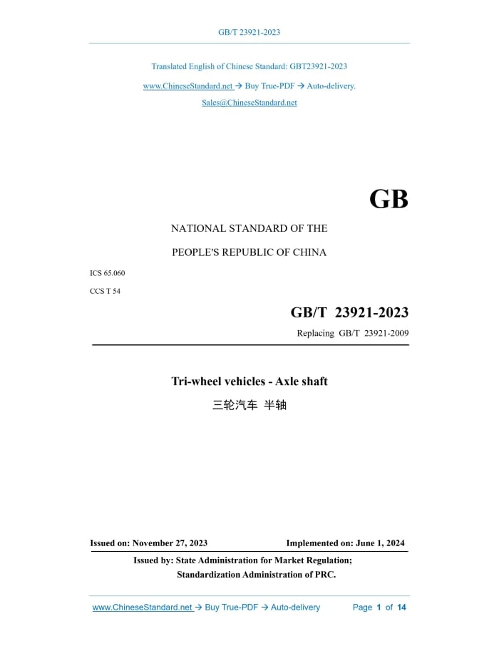GB/T 23921-2023: Tri-wheel vehicles - Axle shaft Delivery: 9 seconds. True-PDF full-copy in English & invoice will be downloaded + auto-delivered via email. See step-by-step procedure Status: Valid GB/T 23921: Historical versions