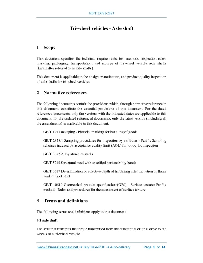 Similar standardsGB/T 23921-2023: Tri-wheel vehicles - Axle shaft---This is an excerpt. Full copy of true-PDF in English version (including equations, symbols, images, flow-chart, tables, and figures etc.), auto-downloaded/delivered in 9 seconds, can be purchased online: https://www.ChineseStandard.net/PDF.aspx/GBT23921-2023GB NATIONAL STANDARD OF THE PEOPLE'S REPUBLIC OF CHINA ICS 65.060 CCS T 54 Replacing GB/T 23921-2009 Tri-wheel vehicles - Axle shaft ISSUED ON: NOVEMBER 27, 2023 IMPLEMENTED ON: JUNE 1, 2024 Issued by: State Administration for Market Regulation; Standardization Administration of PRC. Table of ContentsForeword ... 3 1 Scope ... 5 2 Normative references ... 5 3 Terms and definitions ... 5 4 Technical requirements ... 6 5 Test methods ... 8 6 Inspection rules ... 11 7 Marking, packaging, transportation, and storage ... 13 Tri-wheel vehicles - Axle shaft1 ScopeThis document specifies the technical requirements, test methods, inspection rules, marking, packaging, transportation, and storage of tri-wheel vehicle axle shafts (hereinafter referred to as axle shafts). This document is applicable to the design, manufacture, and product quality inspection of axle shafts for tri-wheel vehicles.2 Normative referencesThe following documents contain the provisions which, through normative reference in this document, constitute the essential provisions of this document. For the dated referenced documents, only the versions with the indicated dates are applicable to this document; for the undated referenced documents, only the latest version (including all the amendments) is applicable to this document. GB/T 191 Packaging - Pictorial marking for handling of goods GB/T 2828.1 Sampling procedures for inspection by attributes - Part 1: Sampling schemes indexed by acceptance quality limit (AQL) for lot-by-lot inspection GB/T 3077 Alloy structure steels GB/T 5216 Structural steel with specified hardenability bands GB/T 5617 Determination of effective depth of hardening after induction or flame hardening of steel GB/T 10610 Geometrical product specifications(GPS) - Surface texture: Profile method - Rules and procedures for the assessment of surface texture3 Terms and definitionsThe following terms and definitions apply to this document. 3.1 axle shaft The axle that transmits the torque transmitted from the differential or final drive to the wheels of a tri-wheel vehicle. NOTE: Some axle shafts can withstand bending moments. 3.2 full-floating axle shaft An axle shaft that transmits only torque. 3.3 semi-floating axle shaft An axle shaft that both transmits torque and withstands bending moments. 3.4 rated torque Maximum allowable torque designed for an axle shaft. 3.5 ultimate failure torque of static torsional testing The maximum breaking torque value during the static torsion testing of an axle shaft. 3.6 static torsional strength safety factor The ratio of the ultimate failure torque of static torsional testing of an axle shaft to the rated torque of the axle shaft. 3.7 torsional fatigue life The number of cycles at which cracks or fractures occur during axle shaft torsional fatigue testing.4 Technical requirements4.1 Axle shafts shall be manufactured in accordance with product drawings and technical documents. 4.2 Under the condition of ensuring product design performance requirements, axle shaft material shall comply with the chemical composition, mechanical properties, and other relevant requirements required by GB/T 3077 and GB/T 5216. The recommended materials for axle shafts are 40Cr, 40CrH, 42CrMo, 42CrMoH, 40MnB, 40MnBH, and 50CrVA. Other materials that meet the requirements of this document can also be used. 4.3 It is recommended to use the surface medium frequency quenching process after pre-tempering treatment. Under the condition of ensuring the performance index requirements of the axle shaft, other heat treatment processes can be used, such as the surface medium frequency quenching process after normalizing treatment. 4.4 After heat treatment of the axle shaft, the surface hardness and hardened layer depth shall meet the following requirements: -- The recommended core hardness value of the axle shaft after pre-tempering treatment is 24 HRC~30 HRC, and the recommended core hardness value of the axle shaft made of 42CrMo and 42CrMoH materials after pre-tempering treatment is 28 HRC~36 HRC; -- The surface hardness of the rod after medium frequency quenching treatment is not less than 52 HRC, and the spline can be reduced by 3 HRC; the depth of the hardened layer of the rod ranges from 10% to 20% of the diameter of the rod, and the change in the depth of the hardened layer is not greater than 5% of the diameter of the rod; -- The effective depth of the quenched and hardened layer at the spline is measured from the minor diameter of the spline, and its depth is not less than 10% of the major diameter of the spline; the length of the non-quenching area of the spline is measured from the end of the spline, and the maximum value is 10 mm; -- The effective depth of the hardened layer at the root fillet of the axle shaft flange is measured along the direction of the fillet, the depth of the hardened layer is not less than 5% of the root diameter of the axle shaft flange and is not greater than the upper limit value of the effective depth of the quenched and hardened layer at the rod; the hardness of the semi-floating axle shaft flange shall be 180 HB~240 HB. 4.5 Roughness shall meet the following requirements: -- For the installation end face of the flange, it shall not be larger than Ra3.2; -- The surfaces of the non-processed rod and the fillet at the rod root are rough surfaces. For the processed rod, it is not larger than Ra6.3 (if shot-peened surface, it is allowed to be not larger than Ra12.5), and for the fillet at the processed rod root, it is not larger than Ra3.2; -- For the mating surface of the bearing and oil seal, it is not larger than Ra1.6; -- For the spline outer circl