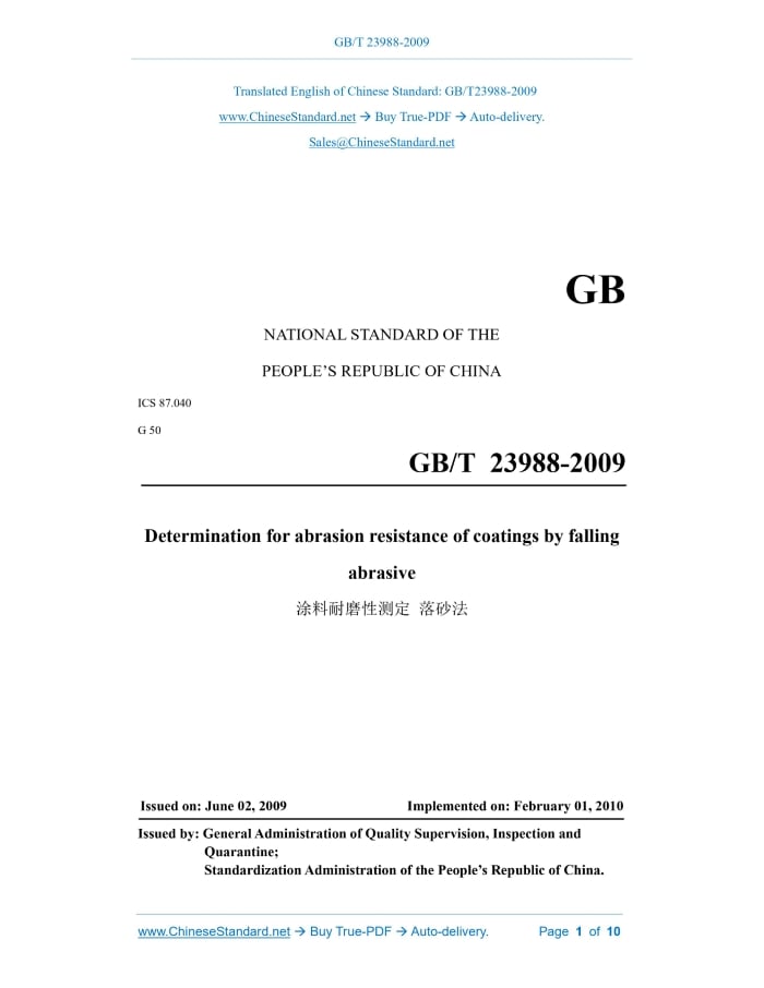 GB/T 23988-2009: Determination for abrasion resistance of coatings by falling abrasive Delivery: 9 seconds. True-PDF full-copy in English & invoice will be downloaded + auto-delivered via email. See step-by-step procedure Status: Valid