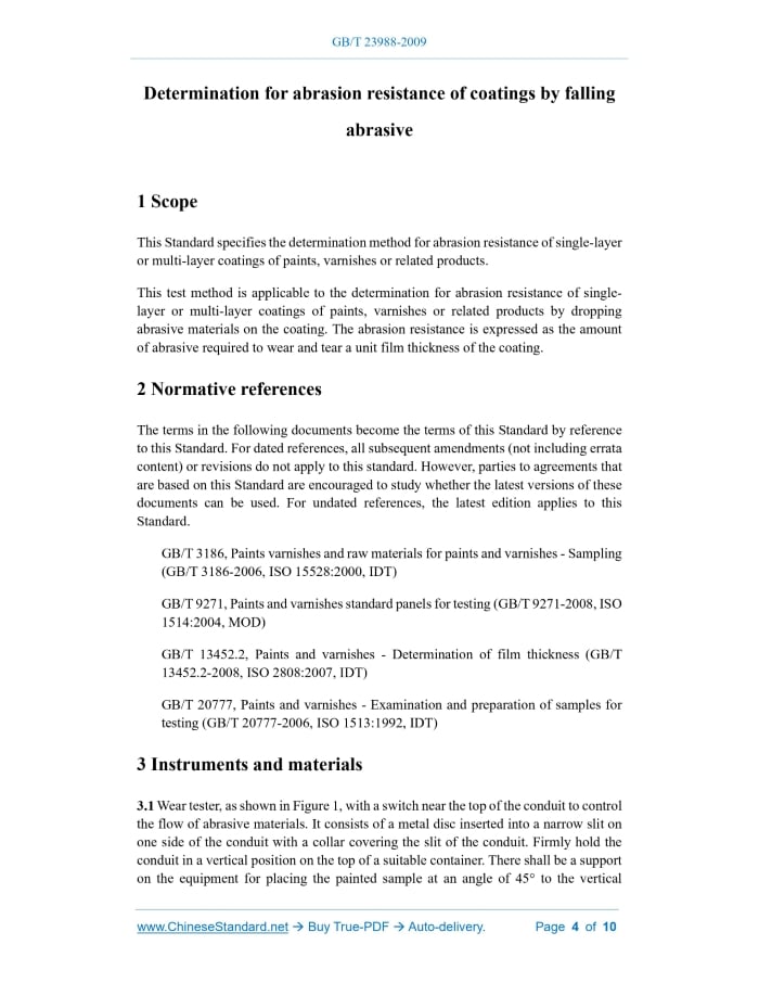 Similar standardsGB/T 23988-2009: Determination for abrasion resistance of coatings by falling abrasive---This is an excerpt. Full copy of true-PDF in English version (including equations, symbols, images, flow-chart, tables, and figures etc.), auto-downloaded/delivered in 9 seconds, can be purchased online: https://www.ChineseStandard.net/PDF.aspx/GBT23988-2009GB NATIONAL STANDARD OF THE PEOPLE’S REPUBLIC OF CHINA ICS 87.040 G 50 Determination for abrasion resistance of coatings by falling abrasive ISSUED ON: JUNE 02, 2009 IMPLEMENTED ON: FEBRUARY 01, 2010 Issued by: General Administration of Quality Supervision, Inspection and Quarantine; Standardization Administration of the People’s Republic of China. Table of ContentsForeword ... 3 1 Scope ... 4 2 Normative references ... 4 3 Instruments and materials ... 4 4 Calibration ... 6 5 Sampling ... 7 6 Test plate ... 7 7 Operation steps ... 7 8 Result calculation ... 8 9 Test report ... 8 Bibliography ... 10 Determination for abrasion resistance of coatings by falling abrasive1 ScopeThis Standard specifies the determination method for abrasion resistance of single-layer or multi-layer coatings of paints, varnishes or related products. This test method is applicable to the determination for abrasion resistance of single- layer or multi-layer coatings of paints, varnishes or related products by dropping abrasive materials on the coating. The abrasion resistance is expressed as the amount of abrasive required to wear and tear a unit film thickness of the coating.2 Normative referencesThe terms in the following documents become the terms of this Standard by reference to this Standard. For dated references, all subsequent amendments (not including errata content) or revisions do not apply to this standard. However, parties to agreements that are based on this Standard are encouraged to study whether the latest versions of these documents can be used. For undated references, the latest edition applies to this Standard. GB/T 3186, Paints varnishes and raw materials for paints and varnishes - Sampling (GB/T 3186-2006, ISO 15528:2000, IDT) GB/T 9271, Paints and varnishes standard panels for testing (GB/T 9271-2008, ISO 1514:2004, MOD) GB/T 13452.2, Paints and varnishes - Determination of film thickness (GB/T 13452.2-2008, ISO 2808:2007, IDT) GB/T 20777, Paints and varnishes - Examination and preparation of samples for testing (GB/T 20777-2006, ISO 1513:1992, IDT)3 Instruments and materials3.1 Wear tester, as shown in Figure 1, with a switch near the top of the conduit to control the flow of abrasive materials. It consists of a metal disc inserted into a narrow slit on one side of the conduit with a collar covering the slit of the conduit. Firmly hold the conduit in a vertical position on the top of a suitable container. There shall be a support on the equipment for placing the painted sample at an angle of 45° to the vertical5 SamplingTake representative samples of the product under test (or each product in a multi-coating system) in accordance with GB/T 3186. Inspect and prepare test samples according to the provisions of GB/T 20777.6 Test plate6.1 Substrate Unless otherwise agreed, the substrate shall be a hard substrate in accordance with the provisions of GB/T 9271, such as metal plate or glass plate, with a minimum size of 70 mm × 150 mm. 6.2 Treatment and coating Unless otherwise agreed, each substrate shall be prepared in accordance with the provisions of GB/T 9271 and then painted using the method specified for the product or system to be tested. At least two test plates shall be prepared for each sample. 6.3 Drying and conditioning Dry and cure the coated test plate under the conditions specified for the product. Unless otherwise specified, the sample plate shall be conditioned at (23 ± 2) °C and relative humidity (50 ± 5) % for at least 24 hours before testing. 6.4 Coating thickness Measure the thickness of the dry coating by one of the methods specified in GB/T 13452.2 and express in μm.7 Operation steps7.1 Unless otherwise agreed, the tests shall be carried out at a temperature of (23 ± 2) °C and a relative humidity of (50 ± 5) %. 7.2 Mark a circular area with a diameter of approximately 25 mm on each test block and position each circular area appropriately on the abrasion test plate support. Measure the coating thickness according to the provisions in 6.4. At least 3 test points are required for each circular area. Record the average measured value of the coating thickness on each circular area. 7.3 Fix the coated test plate on the tester as described in 3.1. Adjust the test plate so that the marked circular area is just below the center of the conduit; pour a certain volume of standard sand into the funnel; turn on the switch; let the sand pass through the conduit and hit the coated test plate. The container installed at the bottom of the tester collects the fallen sand. Repeat the above operation until the coating is destroyed and the substrate of an area of 4 mm diameter is exposed. During the test, the appropriate incremental sand is 2 000 mL ± 20 mL. When approaching the end point, 200 mL ± 2 mL of sand can be added to the funnel. Note 1: When the conduit is switched on, ensure that the collar covers the narrow slit of the conduit opening. Note 2: In order to ensure that the center of the sand beam falls exactly in the center of the sand flow, check the centering of the conduit at regular intervals. Note 3: The sand shall be replaced after passing through the instrument 25 times. 7.4 Repeat the tests of 7.1 ~ 7.3 on another test plate with the same coating.8 Result calculationCalculate the abrasion resistance of the test area of the coated test plate according to the following formula: Where: A – abrasion resistance, in liters per micron (L/μm); V – volume of abrasive material used, in liters (L); T – coating thickness, in microns (μm). Take the arithmetic mean of two parallel determinations as the result, w