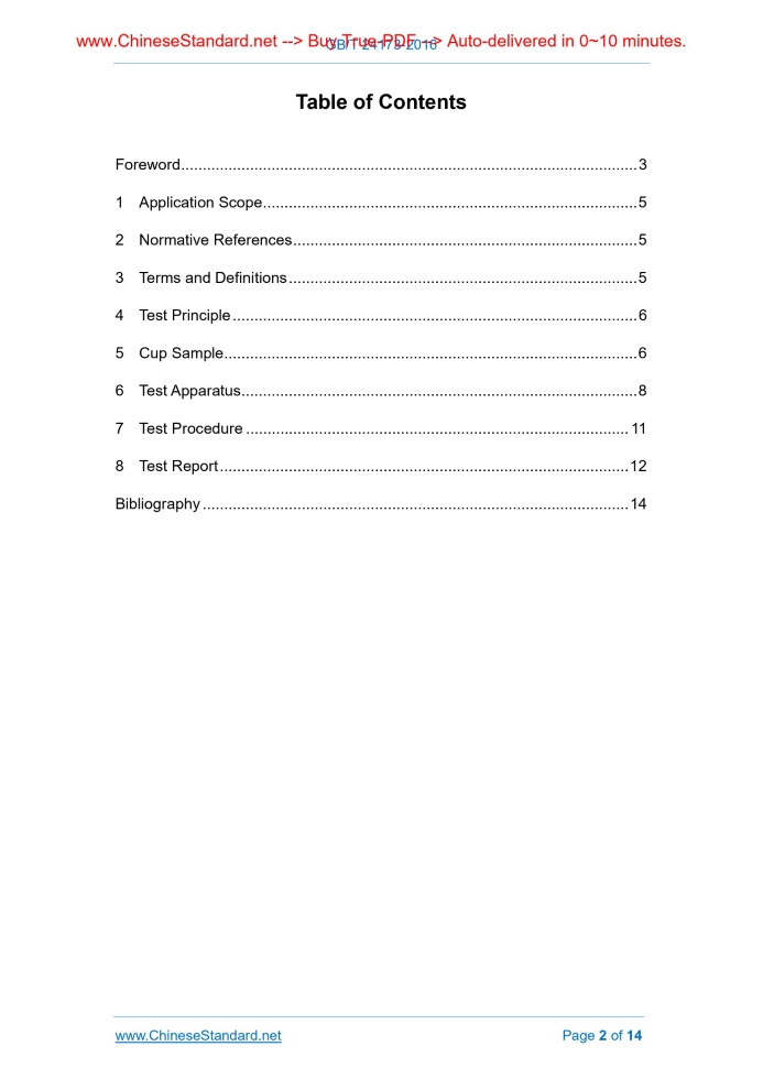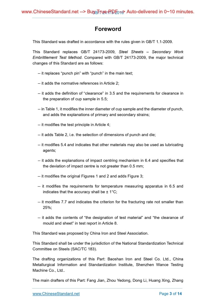 Similar standardsGB/T 24173-2016: Steel Sheets - Secondary Work Embrittlement Test Method---This is an excerpt. Full copy of true-PDF in English version (including equations, symbols, images, flow-chart, tables, and figures etc.), auto-downloaded/delivered in 9 seconds, can be purchased online: https://www.ChineseStandard.net/PDF.aspx/GBT24173-2016GB NATIONAL STANDARD OF THE PEOPLE’S REPUBLIC OF CHINA ICS 77.040.10 H 22 Replacing GB/T 24173-2009 Steel Sheets – Secondary Work Embrittlement Test Method Issued on. DECEMBER 30, 2016 Implemented on. SEPTEMBER 1, 2017 Issued by. General Administration of Quality Supervision, Inspection and Quarantine of the People's Republic of China; Standardization Administration of the People's Republic of China. Table of ContentsForeword... 3 1 Application Scope... 5 2 Normative References... 5 3 Terms and Definitions... 5 4 Test Principle... 6 5 Cup Sample... 6 6 Test Apparatus... 8 7 Test Procedure... 11 8 Test Report... 12 Bibliography... 14ForewordThis Standard was drafted in accordance with the rules given in GB/T 1.1-2009. This Standard replaces GB/T 24173-2009, Steel Sheets – Secondary Work Embrittlement Test Method. Compared with GB/T 24173-2009, the major technical changes of this Standard are as follows. -- it replaces “punch pin” with “punch” in the main text; -- it adds the normative references in Article 2; -- it adds the definition of “clearance” in 3.5 and the requirements for clearance in the preparation of cup sample in 5.5; -- in Table 1, it modifies the inner diameter of cup sample and the diameter of punch, and adds the explanations of primary and secondary strains; -- it modifies the test principle in Article 4; -- it adds Table 2, i.e. the selection of dimensions of punch and die; -- it modifies 5.4 and indicates that other materials may also be used as lubricating agents; -- it adds the explanations of impact centring mechanism in 6.4 and specifies that the deviation of impact centre is not greater than 0.5 mm; -- it modifies the original Figures 1 and 2 and adds Figure 3; -- it modifies the requirements for temperature measuring apparatus in 6.5 and indicates that the accuracy shall be ± 1°C; -- it modifies 7.7 and indicates the criterion for the fracturing rate not smaller than 25%; -- it adds the contents of “the designation of test material” and “the clearance of mould and sheet” in test report in Article 8. This Standard was proposed by China Iron and Steel Association. This Standard shall be under the jurisdiction of the National Standardization Technical Committee on Steels (SAC/TC 183). The drafting organizations of this Part. Baoshan Iron and Steel Co. Ltd., China Metallurgical Information and Standardization Institute, Shenzhen Wance Testing Machine Co., Ltd.. The main drafters of this Part. Fang Jian, Zhou Yedong, Dong Li, Huang Xing, Zhang Weixu. The previous edition of the standard replaced by this Standard is as follows. -- GB/T 24173-2009. Steel Sheets – Secondary Work Embrittlement Test Method1 Application ScopeThis Standard specifies the terms and definitions, test principle, cup sample, test apparatus, test procedure, accuracy of test results and test report of secondary work embrittlement test method for steel sheets. This Standard applies to the secondary work embrittlement test of the sheets made of interstitial free steel and phosphorus bearing steel for punch-forming auto parts and other steel sheets having secondary work embrittlement characteristics for punch forming, with a thickness of 0.45 mm ~ 2.5 mm.2 Normative ReferencesThe following referenced documents are indispensable for the application of this document. For dated references, only the edition dated applies to this document. For undated references, the latest edition of the referenced documents (including all amendments) applies to this Part. GB/T 10623, Metallic Material – Mechanical Testing – Vocabulary GB/T 15825.3, Sheet Metal Formability and Test Methods – Part 3.Drawing and Drawing Load Test3 Terms and DefinitionsThose defined in GB/T 10623 and GB/T 15825.3 and the following terms and definitions apply to this document. 3.1 secondary work embrittlement; SWE The phenomenon that interstitial free steel (IF steel) and phosphorus bearing steel have certain interstitial internal stress after punch forming (primary processing), so they are liable to fracture on the grain boundary subjected to an external force (especially an impact force under low temperature conditions, secondary work). 3.2 secondary work embrittlement temperature; SWET 3.3 draw ratio; DR The ratio of the diameter of round billet to the diameter of punch during punch forming.4 Test PrinciplePlace a cup sample on the base at some test temperature; make the heavy punch of a certain angle of cone and mass to fall freely to impact the rim part of the cup sample.5 Cup Sample5.1 See Table 1 for the dimensions of cup sample and the diameters of punch. 5.2 The head, tail and edge of sheet steels shall be avoided for the parts selected from steel sheet billets (except those with special requirements); the surface shall be free from defects including scratches and roll marks. The widths of cup sample no.1 and no. 2 shall not be less than 74 mm and 108 mm. 5.4 The punching of round billets into cylindrical cup sample is performed on a forming property testing machine, using the draw ratio DR 2.1, the corner radius of punch 6.0 mm ± 0.5 mm, the blank holder force 9.8 kN ~ 14.7 kN and the rising speed of punch normally not greater than 40 mm/min, and using polypropylene film of thickness 0.040 mm ± 0.005 mm as the lubricating agent to reduce the wrinkling of cup sample and reduce the abrasion of mould. Record the blank holder force used for deep drawing cup. For coating materials, clean mould after each time of punching. 5.6 The earing on the edge of cylindrical cup sample is processed by turning on the lathe; the height of the cup sample processed by turni