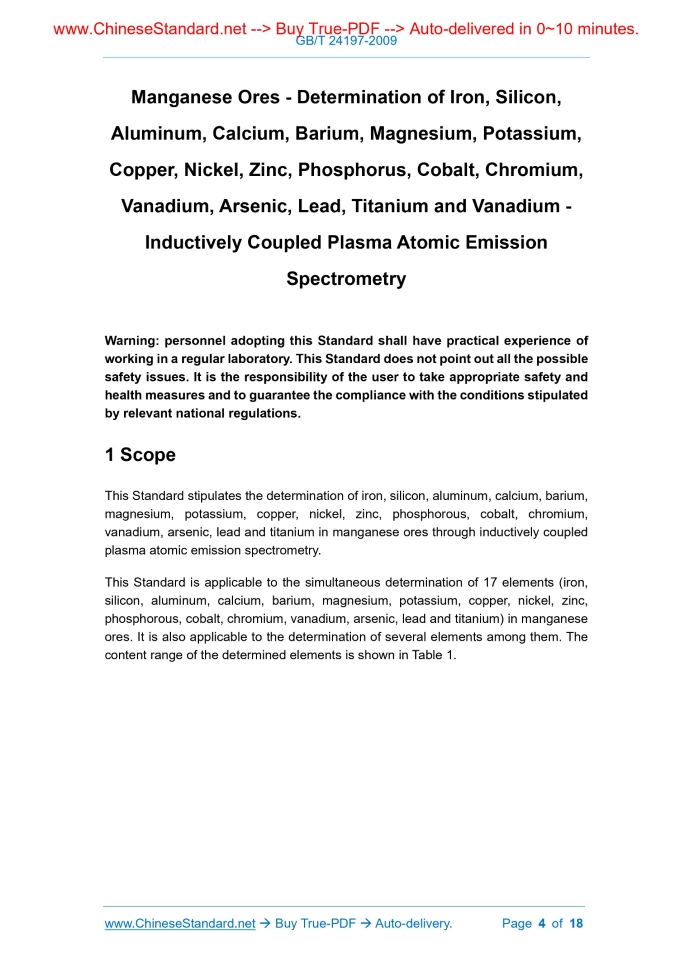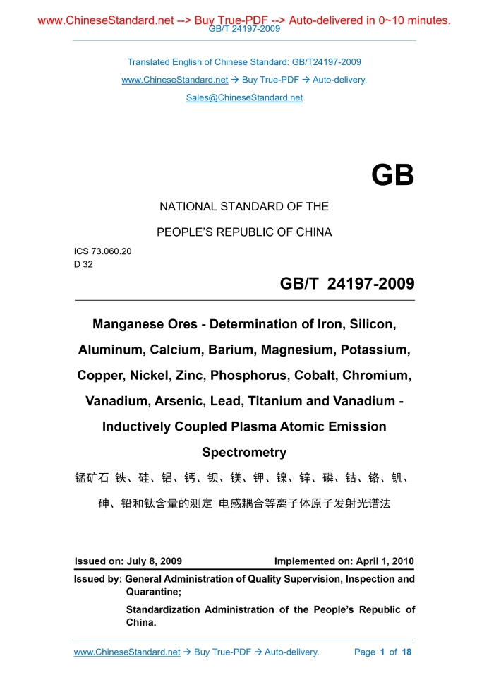 GB/T 24197-2009: Manganese Ores - Determination of Iron, Silicon, Aluminum, Calcium, Barium, Magnesium, Potassium, Copper, Nickel, Zinc, Phosphorus, Cobalt, Chromium, Vanadium, Arsenic, Lead, Titanium and Vanadium - Inductively Coupled Plasma Atomic Emission Spectrometry Delivery: 9 seconds. True-PDF full-copy in English & invoice will be downloaded + auto-delivered via email. See step-by-step procedure Status: Valid