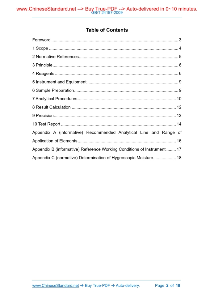 Similar standardsGB/T 24197-2009: Manganese Ores - Determination of Iron, Silicon, Aluminum, Calcium, Barium, Magnesium, Potassium, Copper, Nickel, Zinc, Phosphorus, Cobalt, Chromium, Vanadium, Arsenic, Lead, Titanium and Vanadium - Inductively Coupled Plasma Atomic Emission Spectrometry---This is an excerpt. Full copy of true-PDF in English version (including equations, symbols, images, flow-chart, tables, and figures etc.), auto-downloaded/delivered in 9 seconds, can be purchased online: https://www.ChineseStandard.net/PDF.aspx/GBT24197-2009 NATIONAL STANDARD OF THE PEOPLE’S REPUBLIC OF CHINA ICS 73.060.20 D 32 Manganese Ores - Determination of Iron, Silicon, Aluminum, Calcium, Barium, Magnesium, Potassium, Copper, Nickel, Zinc, Phosphorus, Cobalt, Chromium, Vanadium, Arsenic, Lead, Titanium and Vanadium - Inductively Coupled Plasma Atomic Emission Spectrometry ISSUED ON: JULY 8, 2009 IMPLEMENTED ON: APRIL 1, 2010 Issued by: General Administration of Quality Supervision, Inspection and Quarantine; Standardization Administration of the People’s Republic of China. Table of ContentsForeword ... 3 1 Scope ... 4 2 Normative References ... 5 3 Principle ... 6 4 Reagents ... 6 5 Instrument and Equipment ... 9 6 Sample Preparation ... 9 7 Analytical Procedures ... 10 8 Result Calculation ... 12 9 Precision ... 13 10 Test Report ... 14 Appendix A (informative) Recommended Analytical Line and Range of Application of Elements ... 16 Appendix B (informative) Reference Working Conditions of Instrument ... 17 Appendix C (normative) Determination of Hygroscopic Moisture ... 18 Manganese Ores - Determination of Iron, Silicon, Aluminum, Calcium, Barium, Magnesium, Potassium, Copper, Nickel, Zinc, Phosphorus, Cobalt, Chromium, Vanadium, Arsenic, Lead, Titanium and Vanadium - Inductively Coupled Plasma Atomic Emission Spectrometry Warning: personnel adopting this Standard shall have practical experience of working in a regular laboratory. This Standard does not point out all the possible safety issues. It is the responsibility of the user to take appropriate safety and health measures and to guarantee the compliance with the conditions stipulated by relevant national regulations.1 ScopeThis Standard stipulates the determination of iron, silicon, aluminum, calcium, barium, magnesium, potassium, copper, nickel, zinc, phosphorous, cobalt, chromium, vanadium, arsenic, lead and titanium in manganese ores through inductively coupled plasma atomic emission spectrometry. This Standard is applicable to the simultaneous determination of 17 elements (iron, silicon, aluminum, calcium, barium, magnesium, potassium, copper, nickel, zinc, phosphorous, cobalt, chromium, vanadium, arsenic, lead and titanium) in manganese ores. It is also applicable to the determination of several elements among them. The content range of the determined elements is shown in Table 1. - Part 1: General Principles and Definitions (GB/T 6379.1-2004, ISO 5725-1:1994, IDT) GB/T 6379.2 Accuracy (trueness and precision) of Measurement Methods and Results - Part 2: Basic Method for the Determination of Repeatability and Reproducibility of a Standard Measurement Method (GB/T 6379.2-2004, ISO 5725-2:1994, IDT) GB/T 6682 Water for Analytical Laboratory Use - Specification and Test Methods (GB/T 6682-2008, ISO 3696:1987, MOD) GB/T 14949.8 Manganese Ores - Determination of Hygroscopic Moisture Content in Analytical Samples (GB/T 14949.8-1994, eqv ISO 310:1981)3 PrincipleUse sodium peroxide to melt the specimen in a zirconium crucible; use hydrochloric acid to leach it; dilute it to a certain volume. Use a high-salt resistant atomizer and corresponding fog chamber; atomize the sample solution, then, introduce it into an inductively coupled plasma torch. Determine the net light intensity of the various elements at the analytical line. In accordance with the established calibration curve, calculate the concentration of the various elements in the sample solution. Then, in accordance with the concentration, the mass of the specimen, and the volume of the sample solution after deducting the hygroscopic moisture, calculate the content of the various elements in the specimen.4 ReagentsUnless it is otherwise stipulated, reagents that are confirmed to be analytically pure shall merely be used in the analysis. 4.1 Water, Grade-2 water stipulated in GB/T 6682. 4.2 Sodium peroxide. 4.3 Anhydrous sodium carbonate, excellent grade of purity. 4.4 Hydrochloric acid, 1.19 g/mL, excellent grade of purity. 4.5 Nitric acid, 1.42 g/mL, excellent grade of purity. 4.6 Hydrochloric acid, 1 + 1. 4.7 Hydrochloric acid, 1 + 4. 4.8 Nitric acid, 1 + 9. 4.9 Manganese standard solution, 4.0 mg/mL. mL volumetric flask. Use water to dilute to the scale; mix it up. 4.14 Barium standard solution, 0.8 mg/mL. Weigh-take 1.5238 g of barium nitrate (spectrally pure; beforehand, at 105 °C, dry for 1 h; place it in a desiccator, then, cool it down to room temperature) in a 1,000 mL beaker. Add around 100 mL of water and 100 mL of nitric acid (4.5); heat it up, dissolve it, then, cool it down to room temperature. Transfer it into a 1,000 mL volumetric flask. Use water to dilute to the scale; mix it up. 4.15 Magnesium and potassium mixed standard solution (magnesium: 0.4 mg/mL; potassium: 0.4 mg/mL). Weigh-take 0.6632 g of magnesium oxide (spectrally pure; beforehand, burn it at 1,000 °C for 1 h, then, place it in a desiccator, then, cool it down to room temperature) and 0.7626 g of potassium chloride (spectrally pure; beforehand, at 105 °C, dry for 1 h; place it in a desiccator, then, cool it down to room temperature) in a 1,000 mL beaker. Add 100 mL of nitric acid (4.5). After gentle heating and dissolution, cool it down to room temperature. Transfer it into a 1,000 mL volumetric flask. Use water to dilute to the scale; mix it up. 4.16 Single-element standard stock solution Standard stock solutions of copper, nickel, zinc, phosphorus, cobalt, chromium, vanadium, arsenic, lead and titan