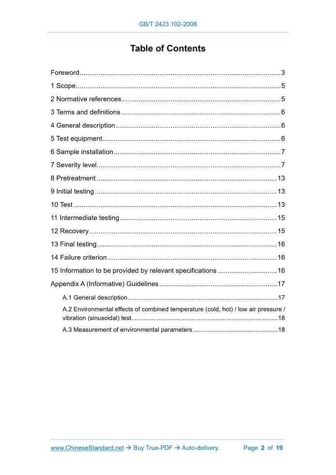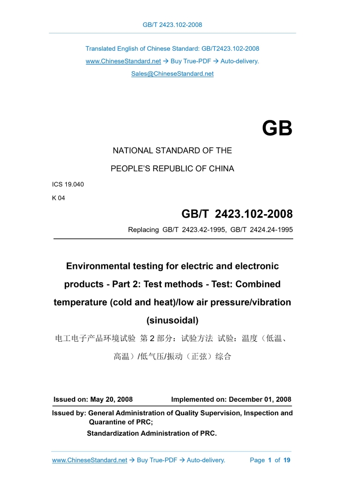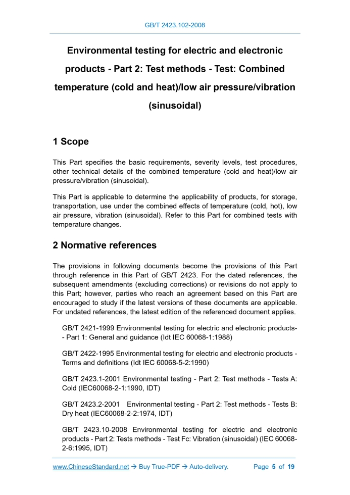 Similar standardsGB/T 2423.102-2008: Environmental testing for electric and electronic products - Part 2: Test methods - Test: Combined temperature (cold and heat) / low air pressure / vibration (sinusoidal)---This is an excerpt. Full copy of true-PDF in English version (including equations, symbols, images, flow-chart, tables, and figures etc.), auto-downloaded/delivered in 9 seconds, can be purchased online: https://www.ChineseStandard.net/PDF.aspx/GBT2423.102-2008 GB NATIONAL STANDARD OF THE PEOPLE’S REPUBLIC OF CHINA ICS 19.040 K 04 Replacing GB/T 2423.42-1995, GB/T 2424.24-1995 Environmental testing for electric and electronic products - Part 2: Test methods - Test: Combined temperature (cold and heat)/low air pressure/vibration (sinusoidal) 高温)/低气压/振动(正弦)综合 ISSUED ON: MAY 20, 2008 IMPLEMENTED ON: DECEMBER 01, 2008 Issued by: General Administration of Quality Supervision, Inspection and Quarantine of PRC; Standardization Administration of PRC. Table of ContentsForeword ... 3 1 Scope ... 5 2 Normative references ... 5 3 Terms and definitions ... 6 4 General description ... 6 5 Test equipment ... 6 6 Sample installation ... 7 7 Severity level ... 7 8 Pretreatment ... 13 9 Initial testing ... 13 10 Test ... 13 11 Intermediate testing ... 15 12 Recovery ... 15 13 Final testing ... 16 14 Failure criterion ... 16 15 Information to be provided by relevant specifications ... 16 Appendix A (Informative) Guidelines ... 17 A.1 General description ... 17 A.2 Environmental effects of combined temperature (cold, hot) / low air pressure / vibration (sinusoidal) test... 18 A.3 Measurement of environmental parameters ... 18 Environmental testing for electric and electronic products - Part 2: Test methods - Test: Combined temperature (cold and heat)/low air pressure/vibration (sinusoidal)1 ScopeThis Part specifies the basic requirements, severity levels, test procedures, other technical details of the combined temperature (cold and heat)/low air pressure/vibration (sinusoidal). This Part is applicable to determine the applicability of products, for storage, transportation, use under the combined effects of temperature (cold, hot), low air pressure, vibration (sinusoidal). Refer to this Part for combined tests with temperature changes.2 Normative referencesThe provisions in following documents become the provisions of this Part through reference in this Part of GB/T 2423. For the dated references, the subsequent amendments (excluding corrections) or revisions do not apply to this Part; however, parties who reach an agreement based on this Part are encouraged to study if the latest versions of these documents are applicable. For undated references, the latest edition of the referenced document applies. GB/T 2421-1999 Environmental testing for electric and electronic products- - Part 1: General and guidance (Idt IEC 60068-1:1988) GB/T 2422-1995 Environmental testing for electric and electronic products - Terms and definitions (Idt IEC 60068-5-2:1990) GB/T 2423.1-2001 Environmental testing - Part 2: Test methods - Tests A: Cold (IEC60068-2-1:1990, IDT) GB/T 2423.2-2001 Environmental testing - Part 2: Test methods - Tests B: Dry heat (IEC60068-2-2:1974, IDT) GB/T 2423.10-2008 Environmental testing for electric and electronic products - Part 2: Tests methods - Test Fc: Vibration (sinusoidal) (IEC 60068- 2-6:1995, IDT) GB/T 2423.21-1991 Basic environmental testing procedures for electric and electronic products - Test M: Low air pressure (neq IEC 60068-2-13:1991) GB/T 2423.26-1992 Basic environmental testing procedures for electric and electronic products - Test Z/BM: combined heat/low air pressure tests (neq IEC 60068-241:1983)3 Terms and definitionsThe terms and definitions, which are defined in GB/T 2422-1995, GB/T 2423.1- 2001, GB/T 2423.2-2001, GB/T 2423.10-2008, GB/T 2423.21-1991, GB/T 2423.26-1992, apply to this Part.4 General descriptionThis test is a combined test of test A (low temperature), test B (high temperature), test M (low air pressure), test Fc (vibration (sinusoidal)). The test sample shall be subjected to the vibration test, temperature test, temperature/low air pressure combined test, in sequence, in accordance with the test procedure; finally superimposed with vibration (sinusoidal), to make the test sample withstand temperature (cold, hot)/low pressure/vibration (sinusoidal) combined test. When the test sample has passed a single vibration (sinusoidal) test, temperature test and temperature/low air pressure combined test, it may directly carry out the temperature (cold, hot)/low air pressure/vibration (sine) combined test. Whether the test sample is in working condition, during the test, shall be stipulated by the relevant specifications.5 Test equipment5.1 General requirements for test equipment The test equipment shall comply with the requirements for test equipment, in GB/T 2423.1-2001 (or GB/T 2423.2-2001), GB/T 2423.21-1991, GB/T 2423.10- 2008, OR otherwise meet the requirements of this test. Attention shall be paid, to avoid the mechanical coupling, between the vibration bench and the test box (chamber), as well as the air pollution in the test box (chamber), due to inhaled air, when the pressure returns to normal atmospheric pressure. When developing test equipment by oneself, it shall properly handle the problems, such as equipment devices and "interface" devices. 5.2 Equipment device Unless otherwise specified in the relevant specifications, under normal circumstances, the vibration bench itself shall be installed, outside the test box (chamber); only the vibration bench surface is extended into the box (chamber). This configuration is more reasonable. If the vibration bench is installed in the test box (chamber), it will not only make the vibration bench repeatedly suffer the comprehensive environment and affect the life of the vibration bench, but also the heat generated by the vibration bench will interfere with the temperature field in the box (cha