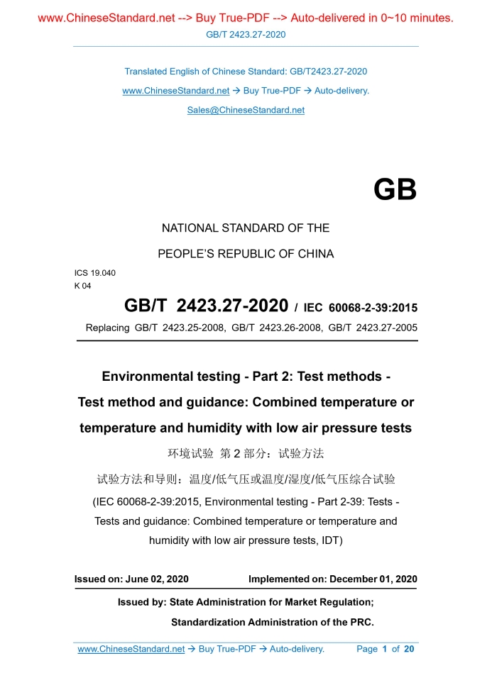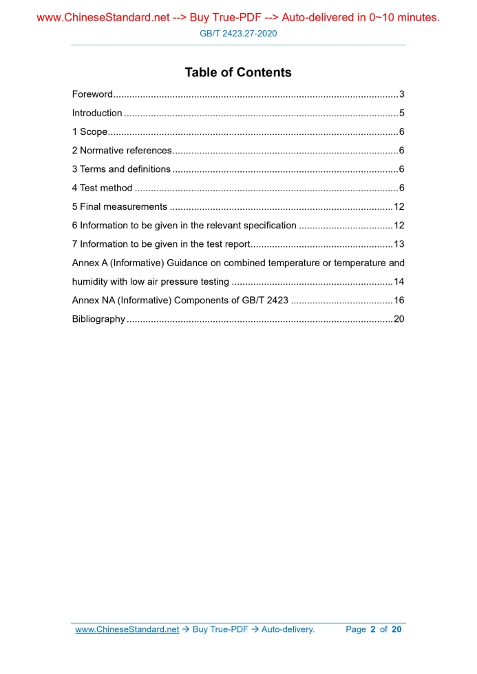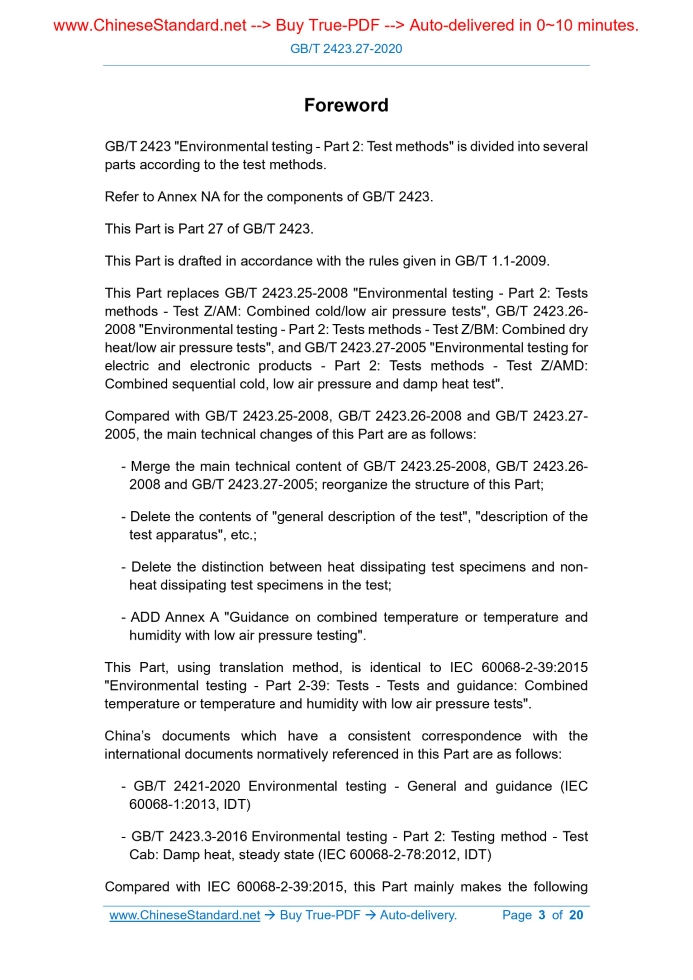 Similar standardsGB/T 2423.27-2020: Environmental testing - Part 2: Test methods - Test method and guidance: Combined temperature or temperature and humidity with low air pressure tests---This is an excerpt. Full copy of true-PDF in English version (including equations, symbols, images, flow-chart, tables, and figures etc.), auto-downloaded/delivered in 9 seconds, can be purchased online: https://www.ChineseStandard.net/PDF.aspx/GBT2423.27-2020 Environmental testing - Part 2.Test methods - Test method and guidance. Combined temperature or temperature and humidity with low air pressure tests ICS 19.040 K04 National Standards of People's Republic of China Replace GB/T 2423.25-2008, GB/T 2423.26-2008, GB/T 2423.27-2005 Environmental testing Part 2.Test methods Test methods and guidelines. temperature/low pressure or Temperature/humidity/low air pressure comprehensive test 2020-06-02 released 2020-12-01 implementation State Administration for Market Regulation Issued by the National Standardization Management Committee Table of ContentsPreface Ⅲ Introduction Ⅳ 1 Scope 1 2 Normative references 1 3 Terms and definitions 1 4 Test method 1 5 Final inspection 6 6 Information that should be given by relevant specifications 6 7 Information to be given in the test report 6 Appendix A (informative appendix) Temperature/low pressure or temperature/humidity/low pressure comprehensive test guide 8 Appendix NA (informative appendix) GB/T 2423 component 9 Reference 12 Preface GB/T 2423 "Environmental Testing Part 2.Test Methods" is divided into several parts according to the test methods. Refer to Appendix NA for the components of GB/T 2423. This part is part 27 of GB/T 2423. This section was drafted in accordance with the rules given in GB/T 1.1-2009. This part replaces GB/T 2423.25-2008 "Environmental Testing of Electrical and Electronic Products Part 2.Test Method Test Z/AM. Low Temperature/low pressure comprehensive test", GB/T 2423.26-2008 "Environmental test of electrical and electronic products Part 2.Test method test Z/ BM. High temperature/low air pressure comprehensive test and GB/T 2423.27-2005 "Environmental testing of electrical and electronic products Part 2.Test methods Test Z/AMD. Low temperature/low air pressure/humid heat continuous comprehensive test". Compared with GB/T 2423.25-2008, GB/T 2423.26-2008 and GB/T 2423.27-2005, the main technical changes in this part are as follows. ---Combined the main technical aspects of GB/T 2423.25-2008, GB/T 2423.26-2008 and GB/T 2423.27-2005 Content and rearrange the structure of this part; --- Deleted the "general description of the test", "description of the test equipment" and other aspects; --- Deleted the distinction between heat dissipation test samples and non-heat dissipation test samples in the test; ---Added Appendix A "Temperature/Low Pressure or Temperature/Humidity/Low Pressure Comprehensive Test Guide". The translation method used in this part is equivalent to the use of IEC 60068-2-39.2015 Environmental Testing Part 2-39.Test Test Methods and Guidance Then. temperature/low pressure or temperature/humidity/low pressure comprehensive test". The Chinese documents that have a consistent correspondence with the international documents cited in this section are as follows. ---GB/T 2421-2020 Environmental Test Overview and Guidelines (IEC 60068-1.2013, IDT) ---GB/T 2423.3-2016 Environmental Test Part 2.Test Method Test Cab. Constant Humidity Test (IEC 60068- 2-78.2012, IDT) Compared with IEC 60068-2-39.2015, this part mainly makes the following editorial changes. ---The name of this part is changed to "Environmental Testing Part 2.Test Methods, Test Methods and Guidelines. Temperature/Low Pressure or Temperature/Humidity Degree/low air pressure comprehensive test"; ---Informative appendix NA "Components of GB/T 2423" has been added. This part is proposed and managed by the National Standardization Technical Committee on Environmental Conditions and Environmental Tests for Electrical and Electronic Products (SAC/TC8). Drafting organizations of this section. China Electrical Equipment Research Institute Co., Ltd., Shenzhen Urit Testing Technology Co., Ltd., AVIC Great Wall Metrology and Testing (Tianjin) Co., Ltd., Guangzhou Power Supply Bureau Co., Ltd. Electric Power Test Research Institute, Wuxi Soyat Test Equipment Co., Ltd., Jiangsu Topmilo Environmental Testing Equipment Co., Ltd., Nanjing Wuhe Testing Equipment Co., Ltd., Chongqing Hongrui Testing Instrument Co., Ltd., Guangdong Midea Health Huo Electric Manufacturing Co., Ltd., Bell Laboratory Equipment Jiangsu Co., Ltd., Zhejiang Institute of Metrology, Fujian Xinneng Offshore Wind Power Research Institute Development Center Co., Ltd., Shanghai Institute of Metrology and Testing Technology, Shenzhen Institute of Metrology and Quality Inspection, Ningbo Chinese Academy of Sciences Information Technology Applied Research Institute. The main drafters of this section. Xu Xuedong, Liu Xin, Mei Liguang, Lu Guoyi, Wang Yong, Zhou Zhongming, Jin Jun, Zhang Yanjun, Zhang Dinghu, You Xianke, Yu Jianhong, Hua Ming, Zhang Hongyu, Huang Xiangsheng, Zhang Ailiang, Zhu Jianhua, Pan Yijie, Guan Zhijian, Liu Jing, Wang Yangming. The previous versions of the standards replaced by this part are as follows. ---GB 2423.25-1981, GB/T 2423.25-1992, GB/T 2423.25-2008; ---GB 2423.26-1981, GB/T 2423.26-1992, GB/T 2423.26-2008; ---GB/T 2423.27-1981, GB/T 2423.27-2005.introductionWhen exposed to different natural environmental conditions, the performance of equipment and components should not cause serious deterioration. For example, temperature, humidity, low Air pressure synthesis may only have a certain effect on components and gaskets. The types and severity of environmental parameters depend on the operating, transportation, and storage environments exposed to equipment and components. Environmental impact on equipment performance It is very different in the tropics and humid tropics and the Arctic. Dif