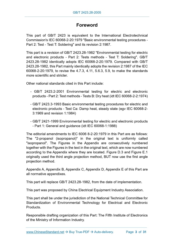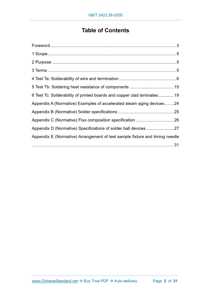 Similar standardsGB/T 2423.28-2005: Environmental testing for electric and electronic products - Part 2: Test methods - Test T: Soldering---This is an excerpt. Full copy of true-PDF in English version (including equations, symbols, images, flow-chart, tables, and figures etc.), auto-downloaded/delivered in 9 seconds, can be purchased online: https://www.ChineseStandard.net/PDF.aspx/GBT2423.28-2005 GB NATIONAL STANDARD OF THE PEOPLE’S REPUBLIC OF CHINA ICS 19.040 K 04 GB/T 2423.28-2005 / IEC 60068-2-20:1979 Replacing GB/T 2423.28-1982 Environmental testing for electric and electronic products - Part 2: Tests methods - Test T: Soldering (IEC 60068-2-20:1979, Basic environmental testing procedures - Part 2: Test - Test T: Soldering, IDT) ISSUED ON: AUGUST 26, 2005 IMPLEMENTED ON: APRIL 01, 2006 Issued by: General Administration of Quality Supervision, Inspection and Quarantine of PRC; Standardization Administration of PRC. Table of ContentsForeword ... 3 1 Scope ... 5 2 Purpose ... 5 3 Terms ... 5 4 Test Ta: Solderability of wire and termination ... 6 5 Test Tb: Soldering heat resistance of components ... 15 6 Test Tc: Solderability of printed boards and copper clad laminates ... 19 Appendix A (Normative) Examples of accelerated steam aging devices ... 24 Appendix B (Normative) Solder specifications ... 25 Appendix C (Normative) Flux composition specification ... 26 Appendix D (Normative) Specifications of solder ball devices ... 27 Appendix E (Normative) Arrangement of test sample fixture and timing needle ... 31ForewordThis part of GB/T 2423 is equivalent to the International Electrotechnical Commission's IEC 60068-2-20:1979 "Basic environmental testing procedures - Part 2: Test - Test T: Soldering" and its revision 2:1987. This part is a revision of GB/T 2423.28-1982 "Environmental testing for electric and electronic products - Part 2: Tests methods - Test T: Soldering". GB/T 2423.28-1982 identically adopts IEC 60068-2-20:1979. Compared with GB/T 2423.28-1982, this Part mainly identically adopts the revision 2:1987 of the IEC 60068-2-20:1979, to revise the 4.7.3, 4.11, 5.6.3, 5.9, to make the standards more scientific and stricter. Other national standards cited in this Part include: - GB/T 2423.2-2001 Environmental testing for electric and electronic products - Part 2: Test methods - Tests B: Dry heat (idt IEC 60068-2-2:1974) - GB/T 2423.3-1993 Basic environmental testing procedures for electric and electronic products - Test Ca: Damp heat, steady state (egv IEC 60068-2- 3:1969 and revision 1:1984) - GB/T 2421-1999 Environmental testing for electric and electronic products - Part 1: General and guidance (idt IEC 60068-1:1988) The editorial amendments to IEC 6006 8-2-20:1979 in this Part are as follows: The "2-propanol (isopropanol)" in the original text is uniformly called "isopropanol". The Figures in the Appendix are consecutively numbered together with the Figures in the text in the original text, which are now numbered according to the Appendix where they are located. Figure D.3 and Figure E.1 originally used the third angle projection method, BUT now use the first angle projection method. Appendix A, Appendix B, Appendix C, Appendix D, Appendix E of this Part are all normative appendixes. This part will replace GB/T 2423.28-1982, from the date of implementation. This part was proposed by China Electrical Equipment Industry Association. This part shall be under the jurisdiction of the National Technical Committee for Standardization of Environmental Technology for Electrical and Electronic Products. Responsible drafting organization of this Part: The Fifth Institute of Electronics of the Ministry of Information Industry. Environmental testing for electric and electronic products - Part 2: Tests methods - Test T: Soldering1 ScopeThis Part of GB/T 2423 applies to all electrical and electronic components, that may be subject to the following test conditions.2 PurposeDetermine the ability of component terminations and printed circuits to be easily wetted; check the ability of components themselves not to be damaged during assembly and soldering.3 Terms3.1 Colophony Natural rosin is the residue, after turpentine is extracted from the oil- containing pine tree. It is mainly composed of rosin acid and similar resin acids. It also includes a small amount of resin acid esters. 3.2 Contact angle Usually refers to the angle, between the tangent plane of the liquid surface and the two planes of the liquid-solid interface, at the intersection of the liquid and the solid (see Figure 1). This specifically refers to the contact angle, when the liquid solder is in contact with a solid metal surface. When inactive flux is not suitable for use, according to the requirements of relevant standards, ammonium chloride (analytical pure) can be added to the above flux, to increase the chloride ion content to 0.5% by mass (referring to the amount, which is expressed by free chloride ions, based on the benchmark of rosin content). 4.8.3 Procedure The test wire shall be basically straight. If necessary or convenient, they can be removed from a sample to be tested. Before the solderability test, the wire shall not be cleaned. If required by the relevant standards, the wire can be immersed in a neutral organic solvent, at room temperature, to remove oil stains. Before the new solder ball, which is selected in accordance with 4.8.2.1, is placed on the heating head in the soldering device, the solder, which is left on the heating head from the previous test, shall be wiped clean. The flux is used, by dipping the wire in the flux OR brushing the flux on the wire, that has been placed in a suitable position in the test device. A small amount of flux can also be applied to the molten solder ball, to ensure that it is clean AND not oxidized; meanwhile it can completely wet the heating head. Then put the wire to be tested into the ball, so that the wire touches the surface of the heating head. 4.8.4 Requirements Meas