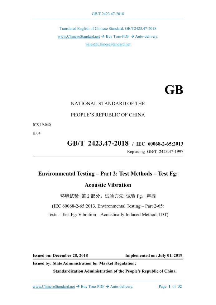 GB/T 2423.47-2018: Environmental testing - Part 2: Test methods - Test Fg: Acoustic vibration Delivery: 9 seconds. True-PDF full-copy in English & invoice will be downloaded + auto-delivered via email. See step-by-step procedure Status: Valid GB/T 2423.47: Historical versions