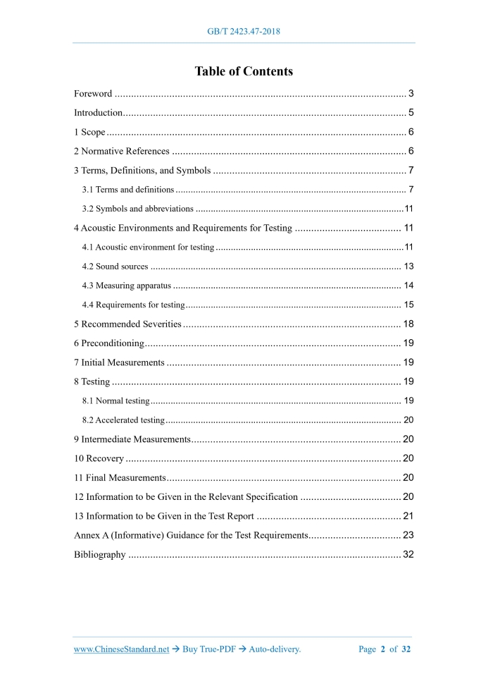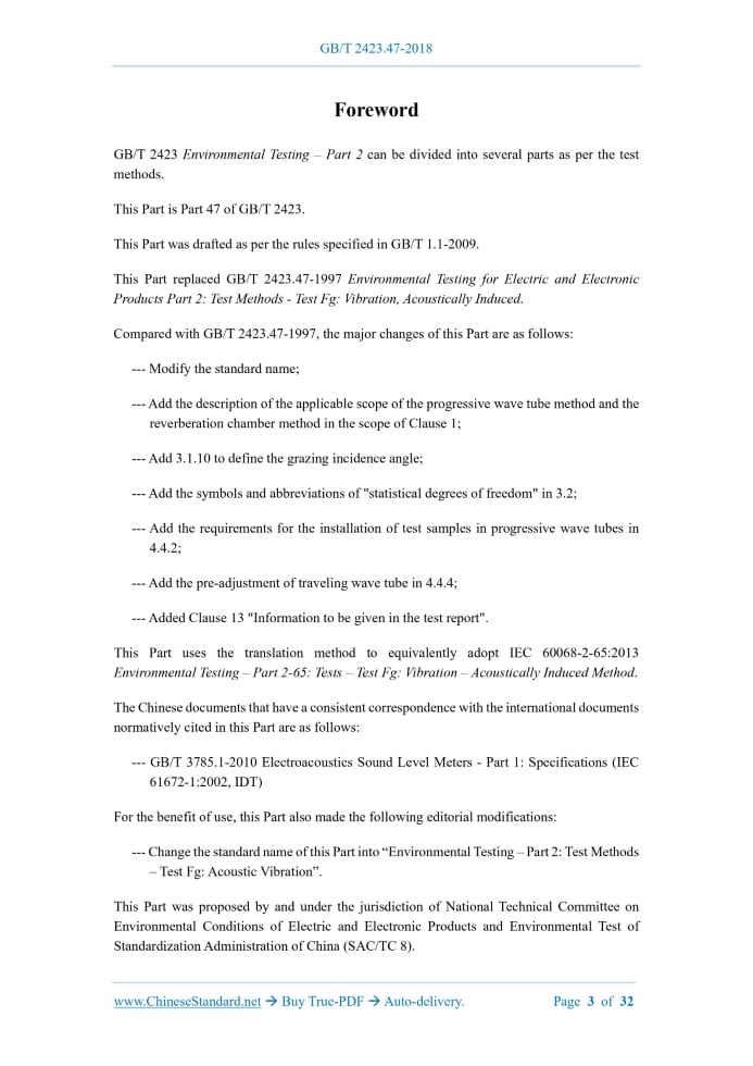 Similar standardsGB/T 2423.47-2018: Environmental testing - Part 2: Test methods - Test Fg: Acoustic vibration---This is an excerpt. Full copy of true-PDF in English version (including equations, symbols, images, flow-chart, tables, and figures etc.), auto-downloaded/delivered in 9 seconds, can be purchased online: https://www.ChineseStandard.net/PDF.aspx/GBT2423.47-2018NATIONAL STANDARD OF THE PEOPLE’S REPUBLIC OF CHINA ICS 19.040 K 04 GB/T 2423.47-2018 / IEC 60068-2-65:2013 Replacing GB/T 2423.47-1997 Environmental Testing – Part 2: Test Methods – Test Fg: Acoustic Vibration (IEC 60068-2-65:2013, Environmental Testing – Part 2-65: Tests – Test Fg: Vibration – Acoustically Induced Method, IDT) ISSUED ON: DECEMBER 28, 2018 IMPLEMENTED ON: JULY 01, 2019 Issued by: State Administration for Market Regulation; Standardization Administration of the People’s Republic of China. Table of ContentsForeword ... 3 Introduction ... 5 1 Scope ... 6 2 Normative References ... 6 3 Terms, Definitions, and Symbols ... 7 3.1 Terms and definitions ... 7 3.2 Symbols and abbreviations ... 11 4 Acoustic Environments and Requirements for Testing ... 11 4.1 Acoustic environment for testing ... 11 4.2 Sound sources ... 13 4.3 Measuring apparatus ... 14 4.4 Requirements for testing ... 15 5 Recommended Severities ... 18 6 Preconditioning ... 19 7 Initial Measurements ... 19 8 Testing ... 19 8.1 Normal testing ... 19 8.2 Accelerated testing ... 20 9 Intermediate Measurements ... 20 10 Recovery ... 20 11 Final Measurements ... 20 12 Information to be Given in the Relevant Specification ... 20 13 Information to be Given in the Test Report ... 21 Annex A (Informative) Guidance for the Test Requirements ... 23 Bibliography ... 32ForewordGB/T 2423 Environmental Testing – Part 2 can be divided into several parts as per the test methods. This Part is Part 47 of GB/T 2423. This Part was drafted as per the rules specified in GB/T 1.1-2009. This Part replaced GB/T 2423.47-1997 Environmental Testing for Electric and Electronic Products Part 2: Test Methods - Test Fg: Vibration, Acoustically Induced. Compared with GB/T 2423.47-1997, the major changes of this Part are as follows: --- Modify the standard name; --- Add the description of the applicable scope of the progressive wave tube method and the reverberation chamber method in the scope of Clause 1; --- Add 3.1.10 to define the grazing incidence angle; --- Add the symbols and abbreviations of "statistical degrees of freedom" in 3.2; --- Add the requirements for the installation of test samples in progressive wave tubes in 4.4.2; --- Add the pre-adjustment of traveling wave tube in 4.4.4; --- Added Clause 13 "Information to be given in the test report". This Part uses the translation method to equivalently adopt IEC 60068-2-65:2013 Environmental Testing – Part 2-65: Tests – Test Fg: Vibration – Acoustically Induced Method. The Chinese documents that have a consistent correspondence with the international documents normatively cited in this Part are as follows: --- GB/T 3785.1-2010 Electroacoustics Sound Level Meters - Part 1: Specifications (IEC 61672-1:2002, IDT) For the benefit of use, this Part also made the following editorial modifications: --- Change the standard name of this Part into “Environmental Testing – Part 2: Test Methods – Test Fg: Acoustic Vibration”. This Part was proposed by and under the jurisdiction of National Technical Committee on Environmental Conditions of Electric and Electronic Products and Environmental Test of Standardization Administration of China (SAC/TC 8). Environmental Testing – Part 2: Test Methods – Test Fg: Acoustic Vibration1 ScopeThis Part of GB/T 2423 provides standard procedures and guidance for conducting acoustic tests in order to determine the ability of a specimen to withstand vibration caused by a specified sound-pressure level environment to which it is, or is liable to be, subjected. For sound pressure level environments of less than 120 dB acoustic tests are not normally required. This Part determines the mechanical weakness and/or degradation in the performance of specimens and to use this information, in conjunction with the relevant specification, to decide on their acceptability for use. The methods of test may also be used as a means of establishing the mechanical robustness or fatigue resistance of specimens. Two procedures are described for conducting tests and for measurement of the sound pressure levels within the acoustic noise field and considers the need for measurement of the vibration responses at specified points on the specimen. It also gives guidance for the selection of the acoustic noise environment, spectrum, sound pressure level and duration of exposure. The progressive wave tube method is relevant to material where aerodynamic turbulence will excite part, or all, of the total external surface. Such applications include aircraft panel assemblies where the excitation exists on one side only. The reverberation chamber method is relevant where it is preferable to induce vibration onto the entire external surface of equipment by distributed excitation rather than fixed points by means of electro-dynamic shakers.2 Normative ReferencesThe following documents are essential to the application of this document. For the dated documents, only the versions with the dates indicated are applicable to this document; for the undated documents, only the latest version (including all the amendments) is applicable to this document. GB/T 27025-2008 General Requirements for the Competence of Testing and Calibration Laboratories (ISO/IEC 17025:2005, IDT) IEC 61672-1 Electroacoustics – Sound Level Meters – Part 1: Specifications ......Source: Above contents are excerpted from the full-copy PDF -- translated/reviewed by: www.ChineseStandard.net / Wayne Zheng et al. Tips & Frequently Asked Questions:Question 1: How long will the true-PDF of English version of GB/T 2423.47-2018 be delivered?A