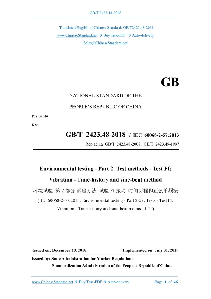 GB/T 2423.48-2018: Environmental testing - Part 2: Test methods - Test Ff: Vibration - Time-history and sine-beat method Delivery: 9 seconds. True-PDF full-copy in English & invoice will be downloaded + auto-delivered via email. See step-by-step procedure Status: Valid GB/T 2423.48: Historical versions