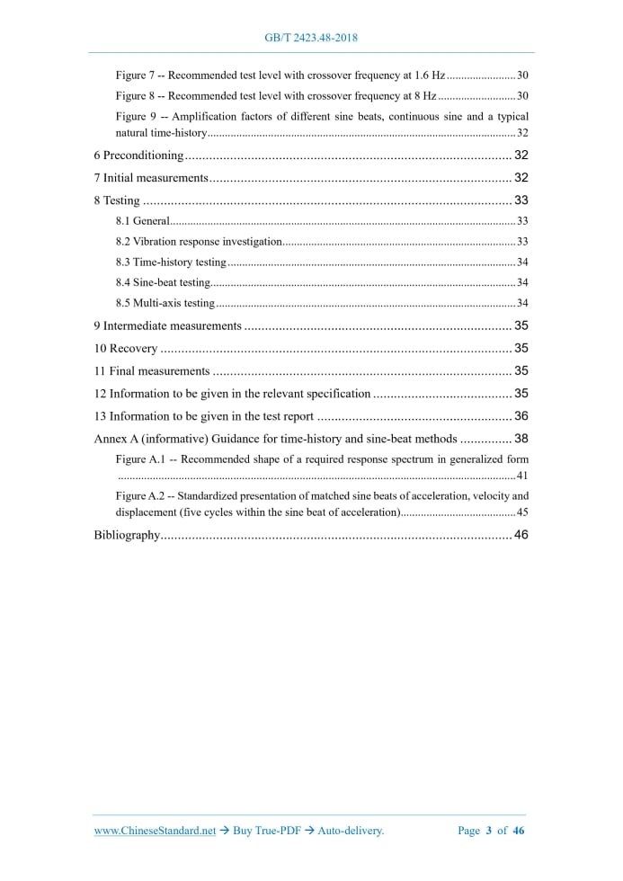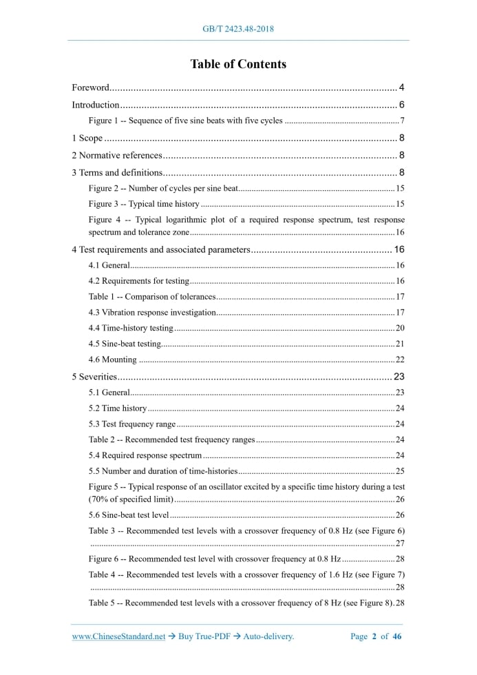 Similar standardsGB/T 2423.48-2018: Environmental testing - Part 2: Test methods - Test Ff: Vibration - Time-history and sine-beat method---This is an excerpt. Full copy of true-PDF in English version (including equations, symbols, images, flow-chart, tables, and figures etc.), auto-downloaded/delivered in 9 seconds, can be purchased online: https://www.ChineseStandard.net/PDF.aspx/GBT2423.48-2018 NATIONAL STANDARD OF THE PEOPLE’S REPUBLIC OF CHINA ICS 19.040 K 04 GB/T 2423.48-2018 / IEC 60068-2-57.2013 Replacing GB/T 2423.48-2008, GB/T 2423.49-1997 Environmental testing - Part 2.Test methods - Test Ff. Vibration - Time-history and sine-beat method (IEC 60068-2-57.2013, Environmental testing - Part 2-57.Tests - Test Ff. Vibration - Time-history and sine-beat method, IDT) Issued on. DECEMBER 28, 2018 Implemented on. JULY 01, 2019 Issued by. State Administration for Market Regulation; Standardization Administration of the People's Republic of China. Table of ContentsForeword... 4 Introduction... 6 Figure 1 -- Sequence of five sine beats with five cycles... 7 1 Scope... 8 2 Normative references... 8 3 Terms and definitions... 8 Figure 2 -- Number of cycles per sine beat... 15 Figure 3 -- Typical time history... 15 Figure 4 -- Typical logarithmic plot of a required response spectrum, test response spectrum and tolerance zone... 16 4 Test requirements and associated parameters... 16 4.1 General... 16 4.2 Requirements for testing... 16 Table 1 -- Comparison of tolerances... 17 4.3 Vibration response investigation... 17 4.4 Time-history testing... 20 4.5 Sine-beat testing... 21 4.6 Mounting... 22 5 Severities... 23 5.1 General... 23 5.2 Time history... 24 5.3 Test frequency range... 24 Table 2 -- Recommended test frequency ranges... 24 5.4 Required response spectrum... 24 5.5 Number and duration of time-histories... 25 Figure 5 -- Typical response of an oscillator excited by a specific time history during a test (70% of specified limit)... 26 5.6 Sine-beat test level... 26 Table 3 -- Recommended test levels with a crossover frequency of 0.8 Hz (see Figure 6) ... 27 Figure 6 -- Recommended test level with crossover frequency at 0.8 Hz... 28 Table 4 -- Recommended test levels with a crossover frequency of 1.6 Hz (see Figure 7) ... 28 Table 5 -- Recommended test levels with a crossover frequency of 8 Hz (see Figure 8). 28 Figure 7 -- Recommended test level with crossover frequency at 1.6 Hz... 30 Figure 8 -- Recommended test level with crossover frequency at 8 Hz... 30 Figure 9 -- Amplification factors of different sine beats, continuous sine and a typical natural time-history... 32 6 Preconditioning... 32 7 Initial measurements... 32 8 Testing... 33 8.1 General... 33 8.2 Vibration response investigation... 33 8.3 Time-history testing... 34 8.4 Sine-beat testing... 34 8.5 Multi-axis testing... 34 9 Intermediate measurements... 35 10 Recovery... 35 11 Final measurements... 35 12 Information to be given in the relevant specification... 35 13 Information to be given in the test report... 36 Annex A (informative) Guidance for time-history and sine-beat methods... 38 Figure A.1 -- Recommended shape of a required response spectrum in generalized form ... 41 Figure A.2 -- Standardized presentation of matched sine beats of acceleration, velocity and displacement (five cycles within the sine beat of acceleration)... 45 Bibliography... 46ForewordGB/T 2423 “Environmental testing - Part 2” is divided into several parts according to test methods. This Part is Part 48 of GB/T 2423. This Part was drafted in accordance with the rules given in GB/T 1.1-2009. This Part replaces GB/T 2423.48-2008 “Environmental testing for electric and electronic products - Part 2.Test methods - Test Ff. Vibration- Time-history method” and GB/T 2423.49-1997 “Environmental testing for electric and electronic products Part 2.Test methods Test Fe. Vibration-sine-beat method”. Compared with GB/T 2423.48-2008 and GB/T 2423.49-1997, in addition to editorial modifications, the main technical changes are as follows. - combined the contents of GB/T 2423.48-2008 and GB/T 2423.49-1997; rearranged the structure of this Part; - deleted GB/T 2423.5-1995, ISO 266.1997 and ISO 2041.1990, GB/T 2298-1991 as references; - noted the sources of the terms and definitions; modified some definitions and explained the modification; - modified the definition for “damping”; added the terms “viscous damping”, “high stress cycles”, “natural time history”; added the note of the term “signal tolerance”; deleted the terms "response peak", "random motion sample", "sampling frequency", "distortion", and "strong part of the specified response spectrum"; - modified the content of “general requirements”; - modified the content of “test frequency range”; - added the requirements for test tolerance; - deleted “parasitic movement”; separated the concepts of "lateral motion" and "rotational motion"; - modified “signal tolerance” and “vibration amplitude tolerance”; - deleted "calculation of test response spectrum"; - modified "number of response high peaks", "vibration response check" and "time history test"; - deleted Annex B “Test frequency range” of GB/T 2423.48-2008; - modified Annex A “Guidelines” of GB/T 2423.49-1997; - added Clause 13 "Information to be given in the test report". This Part uses translation method to identically adopt IEC 60068-2-57.2013 “Environmental testing - Part 2-57.Tests - Test Ff. Vibration - Time-history and sine- beat method”. The Chinese documents which have consistency with the international normative references in this Part are as follows. - GB/T 2421.1-2008, Environmental Testing for Electric and Electronic products - General and Guidance (IEC 60068-1.1998, IDT); - GB/T 2423.10-2008, Environmental testing for electric and electronic products - Part 2.Tests methods - Test Fc. Vibration (sinusoidal) (IEC 60068-2-6.1995, IDT); - GB/T 2424.26-2008, Environmental testing - Sup