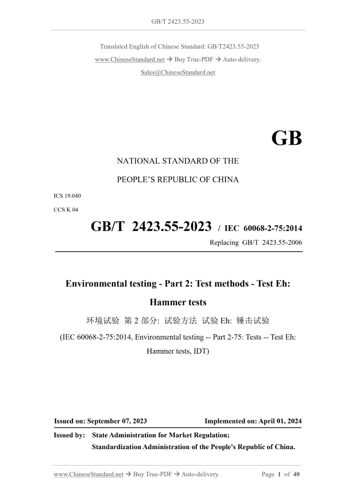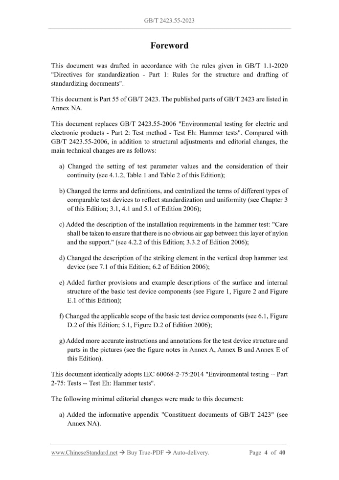 Similar standardsGB/T 2423.55-2023: Environmental testing - Part 2: Test methods - Test Eh: Hammer tests---This is an excerpt. Full copy of true-PDF in English version (including equations, symbols, images, flow-chart, tables, and figures etc.), auto-downloaded/delivered in 9 seconds, can be purchased online: https://www.ChineseStandard.net/PDF.aspx/GBT2423.55-2023GB NATIONAL STANDARD OF THE PEOPLE’S REPUBLIC OF CHINA ICS 19.040 CCS K 04 GB/T 2423.55-2023 / IEC 60068-2-75.2014 Replacing GB/T 2423.55-2006 Environmental testing - Part 2.Test methods - Test Eh. Hammer tests (IEC 60068-2-75.2014, Environmental testing -- Part 2-75.Tests -- Test Eh. Hammer tests, IDT) Issued on: SEPTEMBER 07, 2023 Implemented on: APRIL 01, 2024 Issued by. State Administration for Market Regulation; Standardization Administration of the People's Republic of China. Table of ContentsForeword... 4 Introduction... 6 1 Scope... 7 2 Normative references... 7 3 Terms and definitions... 8 4 General principles for hammer test methods... 9 4.1 Severity level... 9 4.2 Test apparatus... 9 Table 1 -- Striking element characteristics... 10 Figure 1 -- Typical schematic diagram of an striking element... 10 4.3 Pretreatment... 11 4.4 Initial testing... 11 4.5 Test... 11 4.6 Restoration... 12 4.7 Final testing... 12 4.8 Information to be provided in the relevant specifications... 12 5 Test Eha. Pendulum... 13 5.1 Test apparatus... 13 Figure 2 -- Measuring points... 13 5.2 Height of fall... 14 Table 2 -- Height of fall... 14 5.3 Tests... 14 6 Test Ehb. Spring hammer... 14 6.1 Test apparatus... 14 Figure 3 -- 2 J release end shape... 15 6.2 Effect of gravity... 15 6.3 Calibration... 16 7 Test Ehc. Vertical drop weight... 16 7.1 Test apparatus... 16 7.2 Height of fall... 16 Annex A (normative) Shape of the striking element... 17 Figure A.1 -- Examples of striking elements with a force less than or equal to 1 J... 18 Figure A.2 -- Example of a 2 J striking elements... 18 Figure A.3 -- Example of a 5 J striking element... 19 Figure A.4 -- Example of a 10 J striking element... 19 Figure A.5 -- Example of a 20 J striking element... 20 Figure A.6 -- Example of a 50 J striking element... 20 Annex B (normative) Calibration of spring hammer... 21 B.1 Calibration principle... 21ForewordThis document was drafted in accordance with the rules given in GB/T 1.1-2020 "Directives for standardization - Part 1.Rules for the structure and drafting of standardizing documents". This document is Part 55 of GB/T 2423.The published parts of GB/T 2423 are listed in Annex NA. This document replaces GB/T 2423.55-2006 "Environmental testing for electric and electronic products - Part 2.Test method - Test Eh. Hammer tests". Compared with GB/T 2423.55-2006, in addition to structural adjustments and editorial changes, the main technical changes are as follows. a) Changed the setting of test parameter values and the consideration of their continuity (see 4.1.2, Table 1 and Table 2 of this Edition); b) Changed the terms and definitions, and centralized the terms of different types of comparable test devices to reflect standardization and uniformity (see Chapter 3 of this Edition; 3.1, 4.1 and 5.1 of Edition 2006); c) Added the description of the installation requirements in the hammer test. "Care shall be taken to ensure that there is no obvious air gap between this layer of nylon and the support." (see 4.2.2 of this Edition; 3.3.2 of Edition 2006); d) Changed the description of the striking element in the vertical drop hammer test device (see 7.1 of this Edition; 6.2 of Edition 2006); e) Added further provisions and example descriptions of the surface and internal structure of the basic test device components (see Figure 1, Figure 2 and Figure E.1 of this Edition); f) Changed the applicable scope of the basic test device components (see 6.1, Figure D.2 of this Edition; 5.1, Figure D.2 of Edition 2006); g) Added more accurate instructions and annotations for the test device structure and parts in the pictures (see the figure notes in Annex A, Annex B and Annex E of this Edition). This document identically adopts IEC 60068-2-75.2014 "Environmental testing -- Part 2-75.Tests -- Test Eh. Hammer tests". The following minimal editorial changes were made to this document. a) Added the informative appendix "Constituent documents of GB/T 2423" (see Annex NA). Environmental testing - Part 2.Test methods - Test Eh. Hammer tests1 ScopeThis document describes three equivalent test methods for subjecting samples to striking under specified severity levels, including the number of striking, energy and direction of striking. It is used to assess the robustness of products in terms of electrical safety. This document is applicable to tests with energy levels from 0.14 J to 50 J. This document gives three suitable apparatuses for the tests. Annex C provides guidance in this regard.2 Normative referencesThe following referenced documents are indispensable for the application of this document. For dated references, only the edition cited applies. For undated references, the latest edition of the referenced document (including any amendments) applies. ISO 1052, Steels for general engineering purposes NOTE. GB/T 3934-2003, Specification of gauges for general purpose screw threads (ISO 1502.1996, MOD) ISO 2039-2, Plastics -- Determination of hardness -- Part 2.Rockwell hardness NOTE. GB/T 3398.2-2008, Plastics -- Determination of hardness -- Part 2.Rockwell hardness (ISO 2039-2.1987, IDT) ISO 2041, Vibration and shock and condition monitoring -- Vocabulary NOTE. GB/T 2298-2010, Mechanical vibration, shock and condition monitoring -- Vocabulary (ISO 2041.2009, IDT) ISO2768-1, General tolerances -- Part 1.Tolerances for linear and angular dimensions without individual tolerances indications NOTE. GB/T 1804-2000, General tolerances -- Tolerances for linear and angular dimensions without individual tolerance indications (ISO 2768-1.1989, IDT) The calibration striking element is suspen