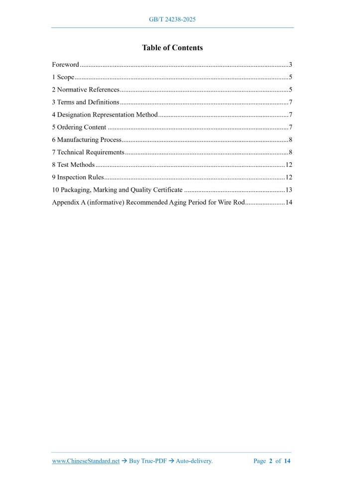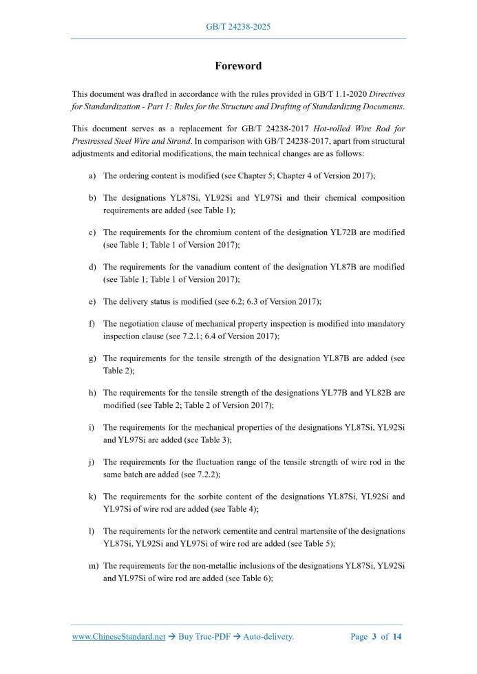 Similar standardsGB/T 24238-2025: Hot-rolled steel wire rod for prestressed steel wire and strand---This is an excerpt. Full copy of true-PDF in English version (including equations, symbols, images, flow-chart, tables, and figures etc.), auto-downloaded/delivered in 9 seconds, can be purchased online: https://www.ChineseStandard.net/PDF.aspx/GBT24238-2025GB NATIONAL STANDARD OF THE PEOPLE’S REPUBLIC OF CHINA ICS 77.140.60 CCS H 44 Replacing GB/T 24238-2017 Hot-rolled Steel Wire Rod for Prestressed Steel Wire and Strand Issued on. MARCH 28, 2025 Implemented on. OCTOBER 1, 2025 Issued by. State Administration for Market Regulation; Standardization Administration of the People’s Republic of China. Table of ContentsForeword... 3 1 Scope... 5 2 Normative References... 5 3 Terms and Definitions... 7 4 Designation Representation Method... 7 5 Ordering Content... 7 6 Manufacturing Process... 8 7 Technical Requirements... 8 8 Test Methods... 12 9 Inspection Rules... 12 10 Packaging, Marking and Quality Certificate... 13 Appendix A (informative) Recommended Aging Period for Wire Rod... 141 ScopeThis document specifies the designation representation method, ordering content, manufacturing process, technical requirements, test methods, inspection rules, packaging, marking and quality certificate of hot-rolled wire rod for prestressed steel wire and strand. This document applies to hot-rolled wire rod for prestressed steel wire and strand (hereinafter referred to as the “wire rod”).2 Normative ReferencesThe contents of the following documents constitute indispensable clauses of this document through the normative references in the text. In terms of references with a specified date, only versions with a specified date are applicable to this document. In terms of references without a specified date, the latest version (including all the modifications) is applicable to this document. GB/T 222 Permissible Tolerances for Chemical Composition of Steel Products GB/T 223.5 Steel and Iron - Determination of Acid-soluble Silicon and Total Silicon Content - Reduced Molybdosilicate Spectrophotometric Method GB/T 223.12 Methods for Chemical Analysis of Iron, Steel and Alloy - The Sodium Carbonate Separation - Diphenyl Carbazide Photometric Method for the Determination of Chromium Content GB/T 223.14 Methods for Chemical Analysis of Iron, Steel and Alloy - The N-benzoyl-N- phenylhydroxylamine Extraction Photometric Method for the Determination of Vanadium Content GB/T 223.19 Methods for Chemical Analysis of Iron, Steel and Alloy - The Neocuproine- chloroform Extraction Photometric Method for the Determination of Copper Content GB/T 223.23 Iron, Steel and Alloy - Determination of Nickel Content - The Dimethylglyoxime Spectrophotometric Method GB/T 223.37 Iron, Steel and Alloy - Determination of Nitrogen Content - Indophenol Blue Spectrophotometric Method after Distillation Separation GB/T 223.59 Iron, Steel and Alloy - Determination of Phosphorus Content - Bismuth Phosphomolybdate Blue Spectrophotometric Method and Antimony Phosphomolybdate Blue Spectrophotometric Method GB/T 223.60 Iron, Steel and Alloy - Determination of Silicon Content - Gravimetric Method GB/T 223.63 Iron, Steel and Alloy - Determination of Manganese Content - Sodium (potassium) Periodate Spectrophotometric Method GB/T 223.82 Steel and Iron - Determination of Hydrogen Content - Thermal Conductivity / Infrared Method after Fusion under Inert Gas GB/T 223.85 Steel and Iron - Determination of Sulfur Content - Infrared Absorption Method after Combustion in an Induction Furnace GB/T 223.86 Steel and Iron - Determination of Total Carbon Content - Infrared Absorption Method after Combustion in an Induction Furnace3 Terms and DefinitionsThis document does not have terms or definitions that need to be defined.4 Designation Representation MethodThe designation of steel consists of the first letter of the Chinese pinyin representing “stress” (capitalized), the average carbon content and the manganese content or the silicon element symbol.5 Ordering ContentThe contract or order for goods placed under this document shall include the following contents.6 Manufacturing Process6.1 Smelting Method Steel is smelted in a converter or electric furnace, and shall be refined outside the furnace.7 Technical Requirements7.1 Designations and Chemical Composition 7.1.1 The designations and chemical composition (melting analysis) of steel for the wire rod shall comply with the provisions of Table 1. 7.2 Mechanical Properties 7.2.1 The tensile strength Rm and reduction of cross-sectional area Z of wire rod after aging shall comply with the provisions of Table 2 and Table 3.The recommended aging period for wire rod is shown in Appendix A. After negotiation between the supply-side and the demand- side, and statement in the contract, adjustments can be made based on the mechanical properties indicators in Table 2 and Table 3. 7.3 Decarburization Layer The wire rod shall be inspected for the depth of decarburization layer. The depth of the total decarburization layer (ferrite + transition layer) on one side of the wire rod shall not be greater than 1.0%D (D represents the nominal diameter of the wire rod). 7.4 Microstructure 7.4.1 The metallographic structure of the wire rod shall be mainly sorbite, and the sorbite content shall comply with the provisions of Table 4. 7.5 Surface Quality 7.5.1 The harmful defective parts at the head and tail of the wire rod shall be cut off, and its cross section shall not have shrinkage holes, delamination or inclusions. 7.6 Dimensions, Shape and Weight 7.7 Special Requirements8 Test Methods8.1 The inspection items, sampling methods and test methods for each batch of wire rod shall comply with the provisions of Table 7. 8.2 Chemical analysis methods shall comply with the general methods, such as. GB/T 4336, GB/T 20213 and GB/T 20214, or GB/T 223.5, GB/T 223.12, GB/T 223.14, GB/T 223.19, GB/T 223.23, GB/T 223.37, GB/T 223.59, GB/T