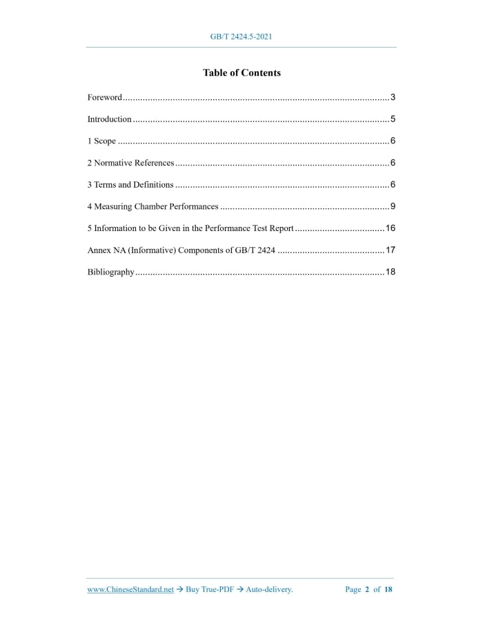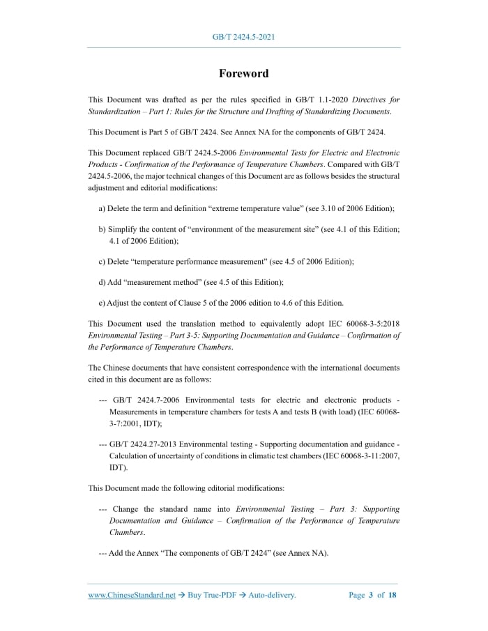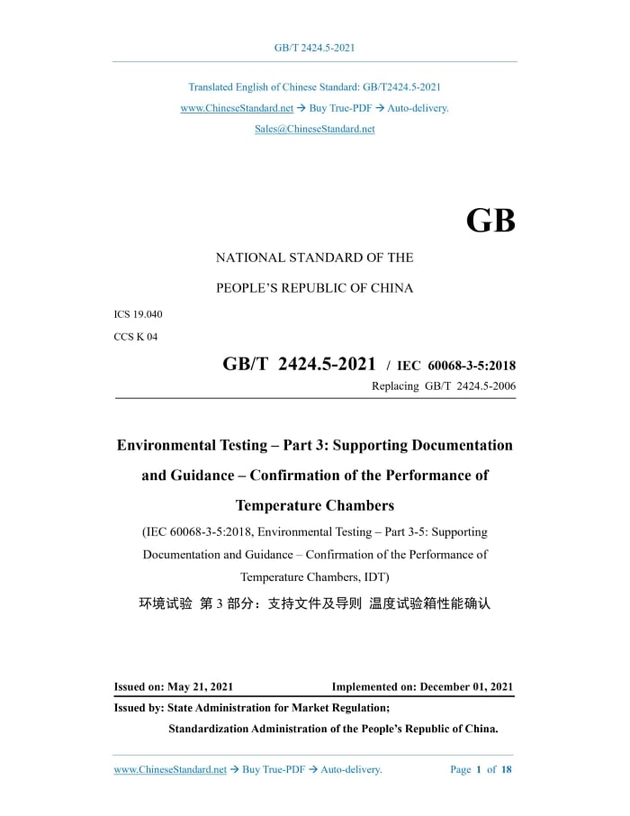 Similar standardsGB/T 2424.5-2021: Environmental testing - Part 3: Supporting documentation and guidance - Confirmation of the performance of temperature chambers---This is an excerpt. Full copy of true-PDF in English version (including equations, symbols, images, flow-chart, tables, and figures etc.), auto-downloaded/delivered in 9 seconds, can be purchased online: https://www.ChineseStandard.net/PDF.aspx/GBT2424.5-2021 GB NATIONAL STANDARD OF THE PEOPLE’S REPUBLIC OF CHINA ICS 19.040 CCS K 04 GB/T 2424.5-2021 / IEC 60068-3-5:2018 Replacing GB/T 2424.5-2006 Environmental Testing – Part 3: Supporting Documentation and Guidance – Confirmation of the Performance of Temperature Chambers (IEC 60068-3-5:2018, Environmental Testing – Part 3-5: Supporting Documentation and Guidance – Confirmation of the Performance of Temperature Chambers, IDT) ISSUED ON: MAY 21, 2021 IMPLEMENTED ON: DECEMBER 01, 2021 Issued by: State Administration for Market Regulation; Standardization Administration of the People’s Republic of China. Table of ContentsForeword ... 3 Introduction ... 5 1 Scope ... 6 2 Normative References ... 6 3 Terms and Definitions ... 6 4 Measuring Chamber Performances ... 9 5 Information to be Given in the Performance Test Report ... 16 Annex NA (Informative) Components of GB/T 2424 ... 17 Bibliography ... 18ForewordThis Document was drafted as per the rules specified in GB/T 1.1-2020 Directives for Standardization – Part 1: Rules for the Structure and Drafting of Standardizing Documents. This Document is Part 5 of GB/T 2424. See Annex NA for the components of GB/T 2424. This Document replaced GB/T 2424.5-2006 Environmental Tests for Electric and Electronic Products - Confirmation of the Performance of Temperature Chambers. Compared with GB/T 2424.5-2006, the major technical changes of this Document are as follows besides the structural adjustment and editorial modifications: a) Delete the term and definition “extreme temperature value” (see 3.10 of 2006 Edition); b) Simplify the content of “environment of the measurement site” (see 4.1 of this Edition; 4.1 of 2006 Edition); c) Delete “temperature performance measurement” (see 4.5 of 2006 Edition); d) Add “measurement method” (see 4.5 of this Edition); e) Adjust the content of Clause 5 of the 2006 edition to 4.6 of this Edition. This Document used the translation method to equivalently adopt IEC 60068-3-5:2018 Environmental Testing – Part 3-5: Supporting Documentation and Guidance – Confirmation of the Performance of Temperature Chambers. The Chinese documents that have consistent correspondence with the international documents cited in this document are as follows: --- GB/T 2424.7-2006 Environmental tests for electric and electronic products - Measurements in temperature chambers for tests A and tests B (with load) (IEC 60068- 3-7:2001, IDT); --- GB/T 2424.27-2013 Environmental testing - Supporting documentation and guidance - Calculation of uncertainty of conditions in climatic test chambers (IEC 60068-3-11:2007, IDT). This Document made the following editorial modifications: --- Change the standard name into Environmental Testing – Part 3: Supporting Documentation and Guidance – Confirmation of the Performance of Temperature Chambers. --- Add the Annex “The components of GB/T 2424” (see Annex NA). Environmental Testing – Part 3: Supporting Documentation and Guidance – Confirmation of the Performance of Temperature Chambers1 ScopeThis Document provides a uniform and reproducible method of confirming that temperature test chambers, without specimens, conform to the requirements specified in climatic test procedures of IEC 60068-2 (all parts) and other standards. This document is intended for users when conducting regular chamber performance monitoring.2 Normative ReferencesThe provisions in following documents become the essential provisions of this Document through reference in this Document. For the dated documents, only the versions with the dates indicated are applicable to this Document; for the undated documents, only the latest version (including all the amendments) is applicable to this Document. IEC 60068-2 (all parts) Environmental Testing – Part 2: Tests IEC 60068-3-7 Environmental Testing – Part 3-7: Supporting Documentation and Guidance – Measurements in Temperature Chambers for Tests A (Cold) and B (Dry Heat) (with Load) IEC 60068-3-11 Environmental Testing – Part 3-11: Supporting Documentation and Guidance – Calculation of Uncertainty of Conditions in Climatic Test Chambers3 Terms and DefinitionsFor the purposes of this document, the following terms and definitions apply. ISO and IEC maintain terminological databases for use in standardization at the following addresses: • IEC Electropedia: available at http://www.electropedia.org/ • ISO Online browsing platform: available at http://www.iso.org/obp4 Measuring Chamber Performances4.1 Test area environment The environment around a temperature test chamber may influence the conditions inside the test chamber. The confirmation of performance of temperature chambers should be carried out under standard atmospheric conditions specified in IEC 60068-1. 4.2 Temperature measurement system The uncertainty of measurement of the output of the measurement system should be determined by calibration of the system, traceable to international standards (see ISO 10012). The temperature sensors may be either calibrated platinum resistors or a thermocouple. The thermal response time of the sensors shall be within a minimum of 10s and a maximum of 40s for 50 % of response. It is preferred that the thermal response time of the entire measurement system to be less than 40s. The use of sensors that are compliant to IEC 60584-1 tolerance class 1 (for thermocouples) or IEC 60751 tolerance class A (for resistors) is recommended. 4.3 Temperature chamber test specimens All measurements described in 4.5 are performed with an empty working spac