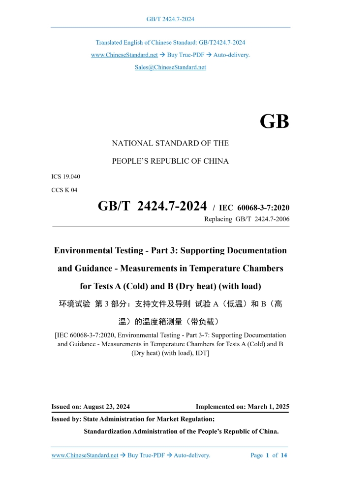 GB/T 2424.7-2024: Environmental testing - Part 3: Supporting documentation and guidance - Measurements in temperature chambers for tests A (Cold) and B (Dry heat) (with load) Delivery: 9 seconds. True-PDF full-copy in English & invoice will be downloaded + auto-delivered via email. See step-by-step procedure Status: Valid GB/T 2424.7: Historical versions