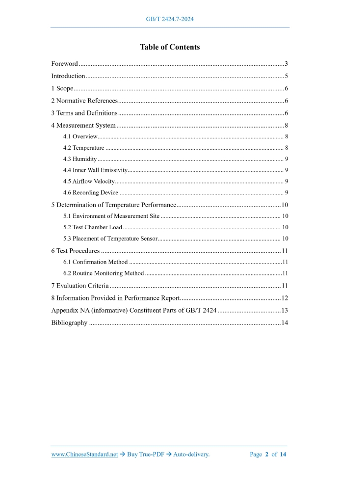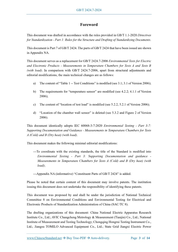 Similar standardsGB/T 2424.7-2024: Environmental testing - Part 3: Supporting documentation and guidance - Measurements in temperature chambers for tests A (Cold) and B (Dry heat) (with load)---This is an excerpt. Full copy of true-PDF in English version (including equations, symbols, images, flow-chart, tables, and figures etc.), auto-downloaded/delivered in 9 seconds, can be purchased online: https://www.ChineseStandard.net/PDF.aspx/GBT2424.7-2024 GB NATIONAL STANDARD OF THE PEOPLE’S REPUBLIC OF CHINA ICS 19.040 CCS K 04 GB/T 2424.7-2024 / IEC 60068-3-7.2020 Replacing GB/T 2424.7-2006 Environmental Testing - Part 3.Supporting Documentation and Guidance - Measurements in Temperature Chambers for Tests A (Cold) and B (Dry heat) (with load) [IEC 60068-3-7.2020, Environmental Testing - Part 3-7.Supporting Documentation and Guidance - Measurements in Temperature Chambers for Tests A (Cold) and B (Dry heat) (with load), IDT] Issued on: AUGUST 23, 2024 Implemented on: MARCH 1, 2025 Issued by. State Administration for Market Regulation; Standardization Administration of the People’s Republic of China. Table of ContentsForeword... 3 Introduction... 5 1 Scope... 6 2 Normative References... 6 3 Terms and Definitions... 6 4 Measurement System... 8 4.1 Overview... 8 4.2 Temperature... 8 4.3 Humidity... 9 4.4 Inner Wall Emissivity... 9 4.5 Airflow Velocity... 9 4.6 Recording Device... 9 5 Determination of Temperature Performance... 10 5.1 Environment of Measurement Site... 10 5.2 Test Chamber Load... 10 5.3 Placement of Temperature Sensor... 10 6 Test Procedures... 11 6.1 Confirmation Method... 11 6.2 Routine Monitoring Method... 11 7 Evaluation Criteria... 11 8 Information Provided in Performance Report... 12 Appendix NA (informative) Constituent Parts of GB/T 2424... 13 Bibliography... 14ForewordThis document was drafted in accordance with the rules provided in GB/T 1.1-2020 Directives for Standardization - Part 1.Rules for the Structure and Drafting of Standardizing Documents. This document is Part 7 of GB/T 2424.The parts of GB/T 2424 that have been issued are shown in Appendix NA. This document serves as a replacement for GB/T 2424.7-2006 Environmental Tests for Electric and Electronic Products - Measurements in Temperature Chambers for Tests A and Tests B (with load). In comparison with GB/T 2424.7-2006, apart from structural adjustments and editorial modifications, the main technical changes are as follows. a) The content of “Table 1 -- Test Conditions” is modified (see 3.1; 3.1 of Version 2006); b) The requirements for “temperature sensor” are modified (see 4.2.2; 4.1.1 of Version 2006); c) The content of “location of test load” is modified (see 5.2.2, 5.2.1 of Version 2006); d) “Location of the chamber wall sensor” is deleted (see 5.3.2 and Figure 2 of Version 2006). This document identically adopts IEC 60068-3-7.2020 Environmental Testing - Part 3-7. Supporting Documentation and Guidance - Measurements in Temperature Chambers for Tests A (Cold) and B (Dry heat) (with load). This document makes the following minimal editorial modifications. ---To coordinate with the existing standards, the title of the Standard is modified into Environmental Testing - Part 3.Supporting Documentation and guidance - Measurements in Temperature Chambers for Tests A (Cold) and B (Dry heat) (with load); ---Appendix NA (informative) “Constituent Parts of GB/T 2424” is added. Please be noted that certain content of this document may involve patents. The institution issuing this document does not undertake the responsibility of identifying these patents. This document was proposed by and shall be under the jurisdiction of National Technical Committee 8 on Environmental Conditions and Environmental Testing for Electrical and Electronic Products of Standardization Administration of China (SAC/TC 8). The drafting organizations of this document. China National Electric Apparatus Research Institute Co., Ltd.; AVIC Changcheng Metrology & Measurement (Tianjin) Co., Ltd.; National Institute of Measurement and Testing Technology; Chongqing Hongrui Testing Instrument Co., Ltd.; Jiangsu TOMILO Advanced Equipment Co., Ltd.; State Grid Jiangxi Electric Power Environmental Testing - Part 3.Supporting Documentation and Guidance - Measurements in Temperature Chambers for Tests A (Cold) and B (Dry heat) (with load)1 ScopeThis document provides a uniform and reproducible method for confirming whether the temperature test chambers comply with the requirements specified by the test methods in IEC 60068-2-1 and IEC 60068-2-2 when there are radiating or non-radiating test samples and under the condition where there is air circulation in the working space. This document is mainly applicable to users when conducting routine test chamber performance monitoring.2 Normative ReferencesThe contents of the following documents constitute indispensable clauses of this document through the normative references in the text. In terms of references with a specified date, only versions with a specified date are applicable to this document. In terms of references without a specified date, the latest version (including all the modifications) is applicable to this document. GB/T 2424.5-2021 Enviromental Testing - Part 3.Supporting Documentation and Guidance - Confirmation of the Performance of Temperature Chambers (IEC 60068-3-5.2018, IDT)3 Terms and DefinitionsThe following terms and definitions are applicable to this document. The terminology databases used for standardization maintained by ISO and IEC can be found below. 3.1 test specification Test procedures for test chambers with or without forced air circulation. It is applicable to test chambers of all sizes. NOTE. Table 1 summarizes the test conditions of IEC 60068-2-1 and IEC 60068-2-2; the temperature surge test conditions have been deleted in earlier versions of these documents. ......Source: Above contents are excerpted from the full-copy PDF -- translated/reviewed by: