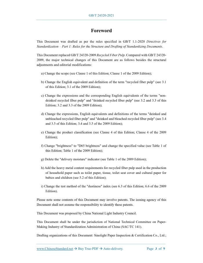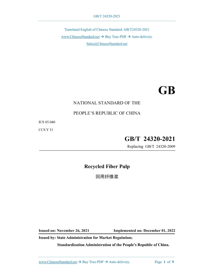 Similar standardsGB/T 24320-2021: Recycled fiber pulp---This is an excerpt. Full copy of true-PDF in English version (including equations, symbols, images, flow-chart, tables, and figures etc.), auto-downloaded/delivered in 9 seconds, can be purchased online: https://www.ChineseStandard.net/PDF.aspx/GBT24320-2021GB NATIONAL STANDARD OF THE PEOPLE’S REPUBLIC OF CHINA ICS 85.040 CCS Y 31 Replacing GB/T 24320-2009 Recycled Fiber Pulp ISSUED ON: NOVEMBER 26, 2021 IMPLEMENTED ON: DECEMBER 01, 2022 Issued by: State Administration for Market Regulation; Standardization Administration of the People’s Republic of China. Table of ContentsForeword ... 3 1 Scope ... 5 2 Normative References ... 5 3 Terms and Definitions ... 6 4 Product Classification ... 6 5 Requirements ... 7 6 Test Method ... 8 7 inspection Rules ... 8 8 Marking, Packaging, Transportation, and Storage ... 9ForewordThis Document was drafted as per the rules specified in GB/T 1.1-2020 Directives for Standardization – Part 1: Rules for the Structure and Drafting of Standardizing Documents. This Document replaced GB/T 24320-2009 Recycled Fiber Pulp. Compared with GB/T 24320- 2009, the major technical changes of this Document are as follows besides the structural adjustments and editorial modifications: a) Change the scope (see Clause 1 of this Edition; Clause 1 of the 2009 Edition); b) Change the English equivalent and definition of the term "recycled fiber pulp" (see 3.1 of this Edition; 3.1 of the 2009 Edition); c) Change the expressions and the corresponding English equivalents of the terms "non- deinked recycled fiber pulp" and "deinked recycled fiber pulp" (see 3.2 and 3.3 of this Edition; 3.2 and 3.3 of the 2009 Edition); d) Change the expressions, English equivalents and definitions of the terms "deinked and unbleached recycled fiber pulp" and "deinked and bleached recycled fiber pulp" (see 3.4 and 3.5 of this Edition; 3.4 and 3.5 of the 2009 Edition); e) Change the product classification (see Clause 4 of this Edition; Clause 4 of the 2009 Edition); f) Change "brightness" to "D65 brightness" and change the specified value (see Table 1 of this Edition; Table 1 of the 2009 Edition); g) Delete the "delivery moisture" indicator (see Table 1 of the 2009 Edition); h) Add the heavy metal content requirements for recycled fiber pulp used in the production of household paper such as toilet paper, tissue, toilet seat cover and cultural paper for babies and children (see 5.2 of this Edition); i) Change the test method of the "dustiness" index (see 6.3 of this Edition; 6.6 of the 2009 Edition). Please note some contents of this Document may involve patents. The issuing agency of this Document shall not assume the responsibility to identify these patents. This Document was proposed by China National Light Industry Council. This Document shall be under the jurisdiction of National Technical Committee on Paper- Making Industry of Standardization Administration of China (SAC/TC 141). Drafting organizations of this Document: Sinolight Paper Inspection & Certification Co., Ltd.; Recycled Fiber Pulp1 ScopeThis Document specifies the product classification, technical requirements, test methods, inspection rules, marking, packaging, transportation and storage of recycled fiber pulp. This Document is applicable to all kinds of recycled fiber pulp. This Document does not apply to recycled pulp.2 Normative ReferencesThe provisions in following documents become the essential provisions of this Document through reference in this Document. For the dated documents, only the versions with the dates indicated are applicable to this Document; for the undated documents, only the latest version (including all the amendments) is applicable to this Document. GB/T 740 Pulps - Sampling for testing GB/T 742 Fibrous raw material, pulp, paper and board - Determination of residue (ash) on ignition at 575 ℃ and 900 ℃ GB/T 1541 Paper and board - Determination of dirt GB/T 2828.1 Sampling procedures for inspection by attribute - Part1: Sampling schemes indexed by acceptance quality limit (AQL) for lot-by-lot inspection GB/T 7974 Paper, board and pulps - Measurement of diffuse blue reflectance factor - D65 brightness (Diff/ Geometry, Outdoor daylight conditions) GB/T 10739 Paper, board and pulps - Standard atmosphere for conditioning and testing GB/T 20216 Pulp and paper - Determination of the effective residual ink concentration (ERIC number) - Infrared reflectance measurement GB/T 21557 Waste paper - Estimation of stickies GB/T 24323 Pulps - Laboratory sheets - Determination of physical properties GB/T 24324 Pulps - Preparation of laboratory sheets for physical testing - Conventional sheet-former method GB/T 24327 Pulps - Laboratory wet disintegration - Disintegration of chemical pulps GB/T 24991 Paper, board and pulps - Determination of lead content - Graphite furnace atomic absorption spectrometry method GB/T 24992 Paper, board and pulps - Determination of arsenic GB/T 29285 Pulps - Laboratory wet disintegration - Disintegration of mechanical pulps3 Terms and DefinitionsFor the purposes of this Document, the following terms and definitions apply. 3.1 Recycled fiber pulp After the waste paper is processed in the process of crushing, purification, screening, washing, heat dispersion and other processes in the pulping process, the pulp with degree of purification can meet the requirements for machine paper making. 3.2 Non-deinked recycled fiber pulp The recycled fiber pulp without de-inking and bleaching treatment. 3.3 Deinked recycled fiber pulp The recycled fiber pulp obtained by removing the ink on the waste paper by using a combination of mechanical and chemical treatment methods. 3.4 Deinked and unbleached recycled fiber pulp The deinked recycled fiber pulp without bleaching treatment. 3.5 Deinked and bleached recycled fiber pulp The deinked recycled fiber pulp with bleaching treatment.4 Product Classification4.1 Recycled fiber pulp is divided into non-dei