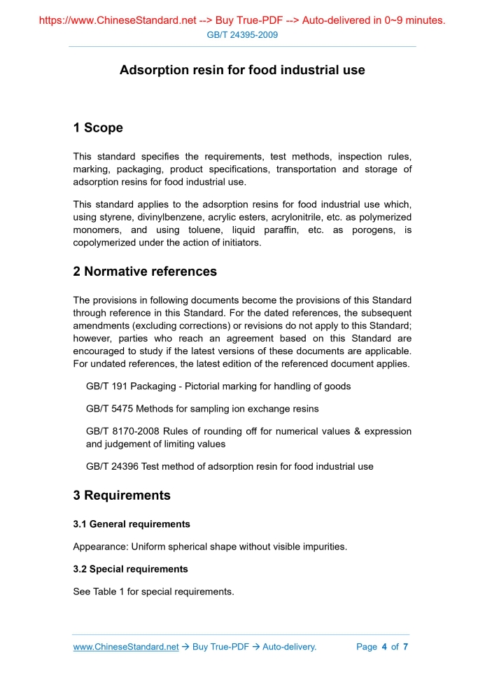 Similar standardsGB/T 24395-2009: Adsorption resin for food industrial use---This is an excerpt. Full copy of true-PDF in English version (including equations, symbols, images, flow-chart, tables, and figures etc.), auto-downloaded/delivered in 9 seconds, can be purchased online: https://www.ChineseStandard.net/PDF.aspx/GBT24395-2009GB NATIONAL STANDARD OF THE PEOPLE’S REPUBLIC OF CHINA ICS 67.250 G 32 Adsorption resin for food industrial use Issued on. SEPTEMBER 30, 2009 Implemented on. DECEMBER 01, 2009 Issued by. General Administration of Quality Supervision, Inspection and Quarantine of PRC; Standardization Administration of PRC. Table of ContentsForeword... 3 1 Scope... 4 2 Normative references... 4 3 Requirements... 4 4 Test method... 5 5 Inspection rules... 5 6 Marking, packaging, transportation, storage and product manual... 6ForewordThis standard was proposed by and shall be under the jurisdiction of the China National Institute of Standardization. Responsible drafting organization of this standard. Tianjin Institute of Product Quality Supervision and Monitoring Technology. Participated drafting organizations of this standard. Tianjin Ou Rui Biological Technology Co., Ltd., Jiangsu Suqing Water Treatment Engineering Group Co., Ltd. The main drafters of this standard. Yang Jialing, Liu Shuang, Qian Ping, Hong Yuchun, Bian Hui, Dai Xikang, Ou Lailiang, Tian Jin. Adsorption resin for food industrial use1 ScopeThis standard specifies the requirements, test methods, inspection rules, marking, packaging, product specifications, transportation and storage of adsorption resins for food industrial use. This standard applies to the adsorption resins for food industrial use which, using styrene, divinylbenzene, acrylic esters, acrylonitrile, etc. as polymerized monomers, and using toluene, liquid paraffin, etc. as porogens, is copolymerized under the action of initiators.2 Normative referencesThe provisions in following documents become the provisions of this Standard through reference in this Standard. For the dated references, the subsequent amendments (excluding corrections) or revisions do not apply to this Standard; however, parties who reach an agreement based on this Standard are encouraged to study if the latest versions of these documents are applicable. For undated references, the latest edition of the referenced document applies. GB/T 191 Packaging - Pictorial marking for handling of goods GB/T 5475 Methods for sampling ion exchange resins3 Requirements3.1 General requirements Appearance. Uniform spherical shape without visible impurities. 3.2 Special requirements See Table 1 for special requirements.4 Test methodIt is determined according to the method specified in GB/T 24396.5 Inspection rules5.1 Inspection classification and inspection items This product inspection is divided into exit-factory inspection and type inspection. 5.2 Group-batch Take the product produced in each kettle as an inspection batch. 5.3 Sampling Carry out sampling in accordance with the provisions of GB/T 5475.Take 2 kg from each batch, wherein 1 kg is used as the test sample and 1 kg is used as the standby sample. Put them into two clean airtight containers, respectively. 5.4 Judgment rules6 Marking, packaging, transportation, storage andproduct manual 6.1 Marking The product marking shall comply with the requirements of GB/T 191.Each batch of products shall have a quality inspection report. 6.2 Packaging Products shall be packed in containers lined with plastic bags. Each package shall be accompanied by a certificate of conformity. 6.3 Transportation and storage During transportation and storage, this product shall be kept in an environment of 4 °C ~ 40 °C; sealed and stored; avoided from over-cooling or over-heating, thereby preventing the resin from losing moisture. ......Source: Above contents are excerpted from the full-copy PDF -- translated/reviewed by: www.ChineseStandard.net / Wayne Zheng et al. Tips & Frequently Asked Questions:Question 1: How long will the true-PDF of English version of GB/T 24395-2009 be delivered?Answer: The full copy PDF of English version of GB/T 24395-2009 can be downloaded in 9 seconds, and it will also be emailed to you in 9 seconds (double mechanisms to ensure the delivery reliably), with PDF-invoice.Question 2: Can I share the purchased PDF of GB/T 24395-2009_English with my colleagues?Answer: Yes. The purchased PDF of GB/T 24395-2009_English will be deemed to be sold to your employer/organization who actually paid for it, including your colleagues and your employer's intranet.Question 3: Does the price include tax/VAT?Answer: Yes. Our tax invoice, downloaded/delivered in 9 seconds, includes all tax/VAT and complies with 100+ countries' tax regulations (tax exempted in 100+ countries) -- See Avoidance of Double Taxation Agreements (DTAs): List of DTAs signed between Singapore and 100+ countriesQuestion 4: Do you accept my currency other than USD?Answer: Yes. www.ChineseStandard.us -- GB/T 24395-2009 -- Click this link and select your country/currency to pay, the exact amount in your currency will be printed on the invoice. Full PDF will also be downloaded/emailed in 9 seconds.How to buy and download a true PDF of English version of GB/T 24395-2009?A step-by-step guide to download PDF of GB/T 24395-2009_EnglishStep 1: Visit website https://www.ChineseStandard.net (Pay in USD), or https://www.ChineseStandard.us (Pay in any currencies such as Euro, KRW, JPY, AUD).Step 2: Search keyword "GB/T 24395-2009". Step 3: Click "Add to Cart". If multiple PDFs are required, repeat steps 2 and 3 to add up to 12 PDFs to cart. Step 4: Select payment option (Via payment agents Stripe or PayPal). Step 5: Customize Tax Invoice -- Fill up your email etc. Step 6: Click "Checkout". Step 7: Make payment by credit card, PayPal, Google Pay etc. After the payment is completed and in 9 seconds, you will receive 2 emails attached with the purchased PDFs and PDF-invoice, respectively. Step 8: