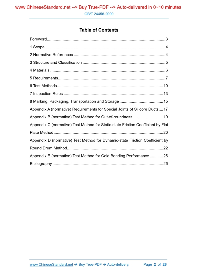 Similar standardsGB/T 24456-2009: High-density Polyethylene Silicore Plastic Duct---This is an excerpt. Full copy of true-PDF in English version (including equations, symbols, images, flow-chart, tables, and figures etc.), auto-downloaded/delivered in 9 seconds, can be purchased online: https://www.ChineseStandard.net/PDF.aspx/GBT24456-2009GB NATIONAL STANDARD OF THE PEOPLE’S REPUBLIC OF CHINA ICS 83.140.30; 23.040.20 G 33 High-density Polyethylene Silicore Plastic Duct 高密度聚乙烯硅芯管 ISSUED ON: OCTOBER 15, 2009 IMPLEMENTED ON: MARCH 1, 2010 Issued by: General Administration of Quality Supervision, Inspection and Quarantine; Standardization Administration of the People’s Republic of China. Table of ContentsForeword ... 3 1 Scope ... 4 2 Normative References ... 4 3 Structure and Classification ... 5 4 Materials ... 6 5 Requirements ... 7 6 Test Methods ... 10 7 Inspection Rules ... 13 8 Marking, Packaging, Transportation and Storage ... 15 Appendix A (normative) Requirements for Special Joints of Silicore Ducts ... 17 Appendix B (normative) Test Method for Out-of-roundness ... 19 Appendix C (normative) Test Method for Static-state Friction Coefficient by Flat Plate Method ... 20 Appendix D (normative) Test Method for Dynamic-state Friction Coefficient by Round Drum Method ... 22 Appendix E (normative) Test Method for Cold Bending Performance ... 25 Bibliography ... 26 High-density Polyethylene Silicore Plastic Duct1 ScopeThis Standard specifies the structure and classification, materials, requirements, test methods, inspection rules, marking, packaging, transportation and storage of high- density polyethylene silicore plastic ducts (hereinafter referred to as “silicore ducts”). This Standard is applicable to silicore ducts and supporting duct fittings used for the protection of optical cables and power cables, which are laid in environments, such as: underground direct burial, pipelines and trenches, etc. This Standard is not applicable to silicore ducts and supporting duct fittings used for the protection of optical cables and power cables, which are directly exposed outdoor to the sunlight and with an air blowing pressure greater than 1.2 MPa.2 Normative ReferencesThrough the reference in this Standard, the clauses of the following documents become clauses of this Standard. In terms of references with a specified date, all the subsequent modification sheets (excluding the corrected content) or revised versions are not applicable to this Standard. However, the various parties that reach an agreement in accordance with this Standard are encouraged to explore the possibility of adopting the latest version of these documents. In terms of references without a specified date, the latest version is applicable to this Standard. GB/T 191 Packaging - Pictorial Marking for Handling of Goods (GB/T 191-2008, ISO 780:1997, MOD) GB/T 1842-2008 Plastics - Test Method for Environmental Stress-cracking of Polyethylene GB/T 2411 Plastics and Ebonite - Determination of Indentation Hardness by Means of A Durometer (shore hardness) GB/T 2828.1-2003 Sampling Procedures for Inspection by Attribute - Part 1: Sampling Schemes Indexed by Acceptance Quality Limit (AQL) for Lot-by-lot Inspection GB/T 2918-1998 Plastics - Standard Atmospheres for Conditioning and Testing GB/T 3682-2000 Determination of the Melt Mass-flow Rate (MFR) and the Melt Volume-flow Rate (MVR) of Thermoplastics GB/T 6111-2003 Thermoplastics Pipes for the Conveyance of Fluids - Resistance to Figure 1 -- Schematic Diagram of Cross-sectional Structure of Silicore Duct 3.2 Product Classification 3.2.1 By structure, it may be classified into: ---Both the inner and outer walls are smooth solid-walled silicore ducts: represented by the Latin letter S; ---Ribbed silicore duct with smooth outer wall and longitudinal ribbed inner wall: represented by the Latin letter R1; ---Ribbed silicore duct with ribbed outer wall and smooth inner wall: represented by the Latin letter R2; ---Ribbed silicore duct with ribbed outer and inner walls: represented by the Latin letter R3. 3.2.2 By color, it may be classified into: ---Single-color silicore duct whose outer layer is a single color and without color stripes; ---Color-striped silicore duct whose outer layer is inlaid with color stripes of other colors. 3.3 Product Marking The product marking of silicore ducts is composed of name, standard No., sequence number, material, specifications, duct wall structure and outer-layer color code, in which, the material is represented by PE-HD; the specifications are shown in Table 2, for example, 40/33; the duct wall structure is shown in 3.2.1: S---solid-walled duct, which may usually be omitted, R1, R2, R3---ribbed ducts; the outer-layer color code is shown in Table 1. An example of product marking: 40/33 black silicore duct with smooth inner and outer walls in compliance with GB/T 24456 shall be marked as: Silicore duct GB/T 24456 PE-HD 40/33 BK4 MaterialsThe main material for the production of silicore ducts shall be high-density polyethylene extrusion grade resin that complies with the stipulations of GB/T 11116. Its melt mass- flow rate MFR (190/2.16) is 0.1 g/10 min ~ 1.0 g/10 min. Under the condition of ensuring compliance with the requirements of Chapter 5 of this Standard, no more than 10% of the company’s clean recycled materials may be used. Tightly put a silicore duct sample (length: 100 mm) on a metal rod with an appropriate outer diameter; place it directly under the Type-D Shore Hardness Tester. In accordance with the method specified in GB/T 2411, read the instantaneous hardness of the test as the measurement result. Read 5 times in total; take the arithmetic mean value as the measurement result. 6.5.2 Inner wall friction coefficient 6.5.2.1 See Appendix C for the static-state inner wall friction coefficient test method. 6.5.2.2 See Appendix D for the dynamic-state inner wall friction coefficient test method. 6.5.3 Tensile yield stre
