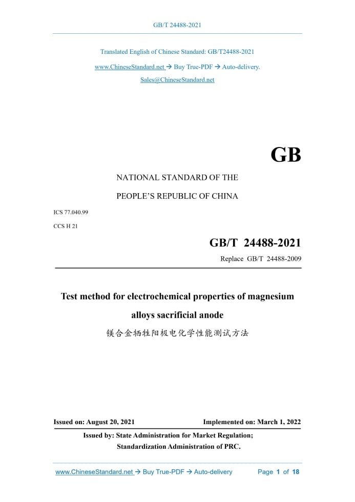 GB/T 24488-2021: Test method for electrochemical properties of magnesium alloys sacrificial anode Delivery: 9 seconds. True-PDF full-copy in English & invoice will be downloaded + auto-delivered via email. See step-by-step procedure Status: Valid GB/T 24488: Historical versions