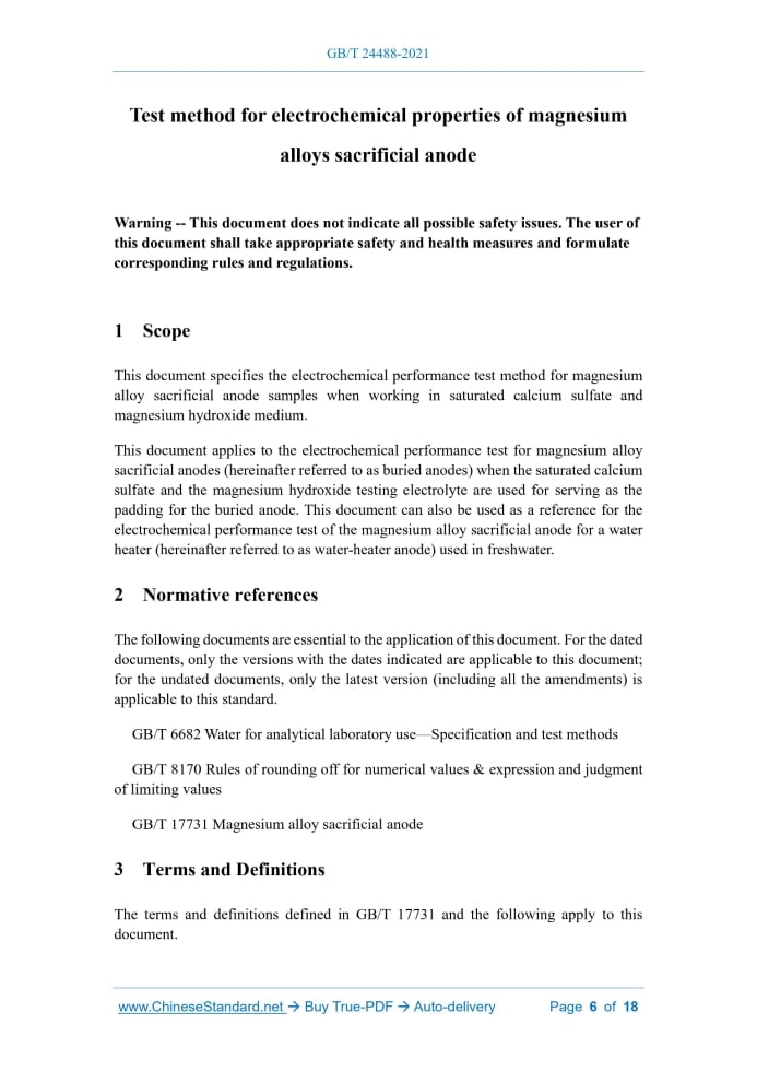 Similar standardsGB/T 24488-2021: Test method for electrochemical properties of magnesium alloys sacrificial anode---This is an excerpt. Full copy of true-PDF in English version (including equations, symbols, images, flow-chart, tables, and figures etc.), auto-downloaded/delivered in 9 seconds, can be purchased online: https://www.ChineseStandard.net/PDF.aspx/GBT24488-2021NATIONAL STANDARD OF THE PEOPLE’S REPUBLIC OF CHINA ICS 77.040.99 CCS H 21 Replace GB/T 24488-2009 Test method for electrochemical properties of magnesium alloys sacrificial anode ISSUED ON: AUGUST 20, 2021 IMPLEMENTED ON: MARCH 1, 2022 Issued by: State Administration for Market Regulation; Standardization Administration of PRC. Table of ContentsForeword ... 3 1 Scope ... 6 2 Normative references ... 6 3 Terms and Definitions ... 6 4 Principle of the method ... 7 5 Test conditions ... 7 6 Reagents ... 8 7 Instruments and equipment ... 8 8 Samples ... 10 9 Test steps ... 13 10 Experimental data processing ... 15 11 Precision ... 17 12 Test report... 17 Test method for electrochemical properties of magnesium alloys sacrificial anode Warning -- This document does not indicate all possible safety issues. The user of this document shall take appropriate safety and health measures and formulate corresponding rules and regulations.1 ScopeThis document specifies the electrochemical performance test method for magnesium alloy sacrificial anode samples when working in saturated calcium sulfate and magnesium hydroxide medium. This document applies to the electrochemical performance test for magnesium alloy sacrificial anodes (hereinafter referred to as buried anodes) when the saturated calcium sulfate and the magnesium hydroxide testing electrolyte are used for serving as the padding for the buried anode. This document can also be used as a reference for the electrochemical performance test of the magnesium alloy sacrificial anode for a water heater (hereinafter referred to as water-heater anode) used in freshwater.2 Normative referencesThe following documents are essential to the application of this document. For the dated documents, only the versions with the dates indicated are applicable to this document; for the undated documents, only the latest version (including all the amendments) is applicable to this standard. GB/T 6682 Water for analytical laboratory use—Specification and test methods GB/T 8170 Rules of rounding off for numerical values & expression and judgment of limiting values GB/T 17731 Magnesium alloy sacrificial anode3 Terms and DefinitionsThe terms and definitions defined in GB/T 17731 and the following apply to this document. 3.1 Closed circuit potential In the electrolyte, the cathode is connected to the sacrificial anode; the potential of the sacrificial anode that is relative to the reference electrode, when the current is passing through. 3.2 Open circuit potential In the electrolyte, the cathode is connected to the sacrificial anode; the potential of the sacrificial anode that is relative to the reference electrode, after the current is disconnected for 1 h. 3.3 Practical current capacity The actually measured amount of electricity produced by consuming a unit mass of sacrificial anode. [Source: GB/T 17731-2015, 3.1] 3.4 Theoretical current capacity The amount of electricity produced by consuming a unit mass of sacrificial anode, which is calculated according to Faraday’s law. [Source: GB/T 17731-2015, 3.2] 3.5 Current efficiency The percentages of practical current capacity and theoretical current capacity.4 Principle of the methodMake the constant DC current flow through a series-connected test cell consisting of a pre-weighed magnesium alloy anode sample, a steel cathode test crucible, and the electrolyte for 14 d. Measure the oxidation potential of the sample several times during the test; measure the oxidation potential of the sample after the test ends and the current is disconnected for 1 h; measure the total amount of electricity flowing through the battery. After the test, wash and weigh each sample, and calculate the amount of electricity obtained from the loss of a unit mass of the sample.5 Test conditionsDuring the test, the temperature of the electrolyte shall be kept within the range of 22 °C±5 °C.9 Test steps9.1 Test preparation 9.1.1 When using a copper coulombmeter (as shown in Figure 2), use fine abrasives (00 # or finer) to grind the coulombmeter’s cathode copper wire; then, put it in an oven, dry it at 105 °C for 15 minutes, and cool it to room temperature; weigh it, and the weight shall be accurate to 0.1 mg. The anode copper sheet shall be cleaned before being put in the coulombmeter’s solution, and the purity of copper wire and copper sheet shall not be less than 99.9%. 9.1.2 Wash the anode sample with water and acetone in turn; then, put it in an oven, dry it at 105 °C for 30 min, and cool it to room temperature; weigh it, and the weight shall be accurate to 0.1 mg. After the sample is cleaned with acetone, in order to avoid contamination of the sample, the sample shall be handled with gloves. 9.1.3 Buried anode sample: Use insulating tape to wrap the surface between 100 mm and 139 mm from the immersed end face of the sample, so that the immersion area of the sample is 41.2 cm2. 9.1.4 Sample of the extruded magnesium anode of the water heater: Seal the immersed end face and the surface 10 mm away from it with insulating materials; wrap the surface between 113.2 mm and 142 mm from the immersed end face of the sample with insulating tape, so that the immersed area of the sample is 41.2 cm2. 9.1.5 Sample of the cast magnesium anode of the water heater: Process it according to the method of “9.1.3 Buried anode sample”. 9.1.6 Brush the cathode test crucible with soft plastic. If the inner surface of the cathode test crucible is completely covered by a high-resistance coating, and the required current cannot be obtained, the high-resistance coating on the surface shall