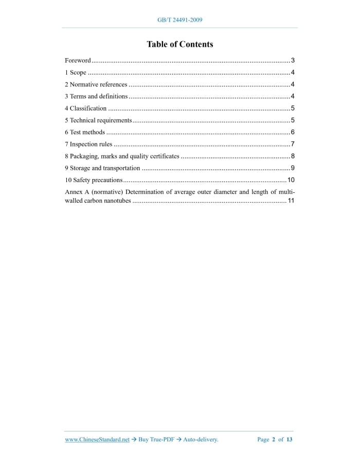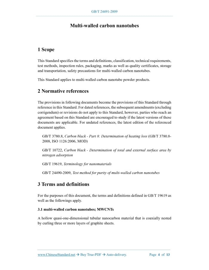 Similar standardsGB/T 24491-2009: Multi-walled carbon nanotubes---This is an excerpt. Full copy of true-PDF in English version (including equations, symbols, images, flow-chart, tables, and figures etc.), auto-downloaded/delivered in 9 seconds, can be purchased online: https://www.ChineseStandard.net/PDF.aspx/GBT24491-2009GB NATIONAL STANDARD OF THE PEOPLE’S REPUBLIC OF CHINA ICS 59.100.20 G 13 Multi-walled carbon nanotubes 多壁碳纳米管 ISSUED ON: OCTOBER 30, 2009 IMPLEMENTED ON: JUNE 01, 2010 Issued by: General Administration of Quality Supervision, Inspection and Quarantine of the People's Republic of China; Standardization Administration of the People's Republic of China. Table of ContentsForeword ... 3 1 Scope ... 4 2 Normative references ... 4 3 Terms and definitions ... 4 4 Classification ... 5 5 Technical requirements ... 5 6 Test methods ... 6 7 Inspection rules ... 7 8 Packaging, marks and quality certificates ... 8 9 Storage and transportation ... 9 10 Safety precautions ... 10 Annex A (normative) Determination of average outer diameter and length of multi- walled carbon nanotubes ... 11 Multi-walled carbon nanotubes1 ScopeThis Standard specifies the terms and definitions, classification, technical requirements, test methods, inspection rules, packaging, marks as well as quality certificates, storage and transportation, safety precautions for multi-walled carbon nanotubes. This Standard applies to multi-walled carbon nanotube powder products.2 Normative referencesThe provisions in following documents become the provisions of this Standard through reference in this Standard. For dated references, the subsequent amendments (excluding corrigendum) or revisions do not apply to this Standard, however, parties who reach an agreement based on this Standard are encouraged to study if the latest versions of these documents are applicable. For undated references, the latest edition of the referenced document applies. GB/T 3780.8, Carbon black - Part 8: Determination of heating loss (GB/T 3780.8- 2008, ISO 1126:2006, MOD) GB/T 10722, Carbon black - Determination of total and external surface area by nitrogen adsorption GB/T 19619, Terminology for nanomaterials GB/T 24490-2009, Test method for purity of multi-walled carbon nanotubes3 Terms and definitionsFor the purposes of this document, the terms and definitions defined in GB/T 19619 as well as the followings apply. 3.1 multi-walled carbon nanotubes; MWCNTs A hollow quasi-one-dimensional tubular nanocarbon material that is coaxially nested by curling three or more layers of graphite sheets.4 ClassificationMulti-walled carbon nanotubes are divided into three categories according to their average outer diameter: - Category 1: the average outer diameter ≤ 20 nm. - Category 2: the average outer diameter > 20 nm ~ 50 nm. - Category 3: the average outer diameter > 50 nm ~ 150 nm. Each category is divided into four grades according to the content (mass fraction) of multi-walled carbon nanotubes: - Grade I: the content is greater than 98%. - Grade II: the content is greater than 95%. - Grade III: the content is greater than 85%. - Grade IV: the content is greater than 70%.5 Technical requirements5.1 Basic features a) Appearance: Black powder or granule, without obvious agglomeration. b) Morphology: Observed with transmission electron microscope magnification over 100,000 times, multi-walled carbon nanotubes are fibrous. The ratio of length to diameter is greater than 20. Along the axis of the fiber, it is a hollow tube. There can be a bamboo-like partition inside the hollow tube. The graphite sheets on the tube wall can have a certain inclination relative to the central axis of the tube. 5.2 Requirements The technical requirements of multi-walled carbon nanotubes shall meet the requirements in Table 1.7 Inspection rules7.1 Inspection classification The inspection specified in this Standard is divided into exit-factory inspection and type inspection. 7.1.1 Exit-factory inspection Each batch of products shall be inspected for appearance and morphology, average outer diameter, multi-walled carbon nanotube content, and ash content. 7.1.2 Type inspection Type inspection shall be carried out randomly when one of the following situations occurs: a) When there is a change in the batch number, model, supplier, etc. of raw materials; b) When there is a change in the production process; c) When the normal production lasts for 3 months; d) When the production equipment stops production for more than 3 months and starts production for the first time; e) When customers make special requirements. All technical requirements specified in this Standard shall be inspected. 7.2 Inspection and acceptance rules 7.2.1 Inspection and acceptance 7.2.1.1 The exit-factory inspection and acceptance of multi-walled carbon nanotubes shall be carried out by the quality and technical supervision department of the supplier. The supplier shall ensure that the delivered multi-walled carbon nanotubes comply with the provisions of this Standard or the contract. 7.2.1.2 The buyer has the right to inspect and accept any inspection item specified in this Standard or the contract. The acceptance inspection shall be carried out within 15 days from the date of delivery of the goods. 7.2.2 Batching rules Multi-walled carbon nanotubes shall be submitted in batches for acceptance. Each batch consists of multi-walled carbon nanotubes with the same production process, the same outer diameter, and the same quality grade. The net weight of each batch of products bag and seal it. Then put a layer of polyethylene sealing bag outside the sealing bag. Seal it. The net weight of each package is 1.0 kg or 5.0 kg. If there is any special packaging requirement, it can be negotiated by both parties. 8.2 Each bag shall have a firm mark on the front. The mark contains the following information: a) Product name; b) Trademark; c) Reference to this Standard, product quality grade; d) Net weight, ba
